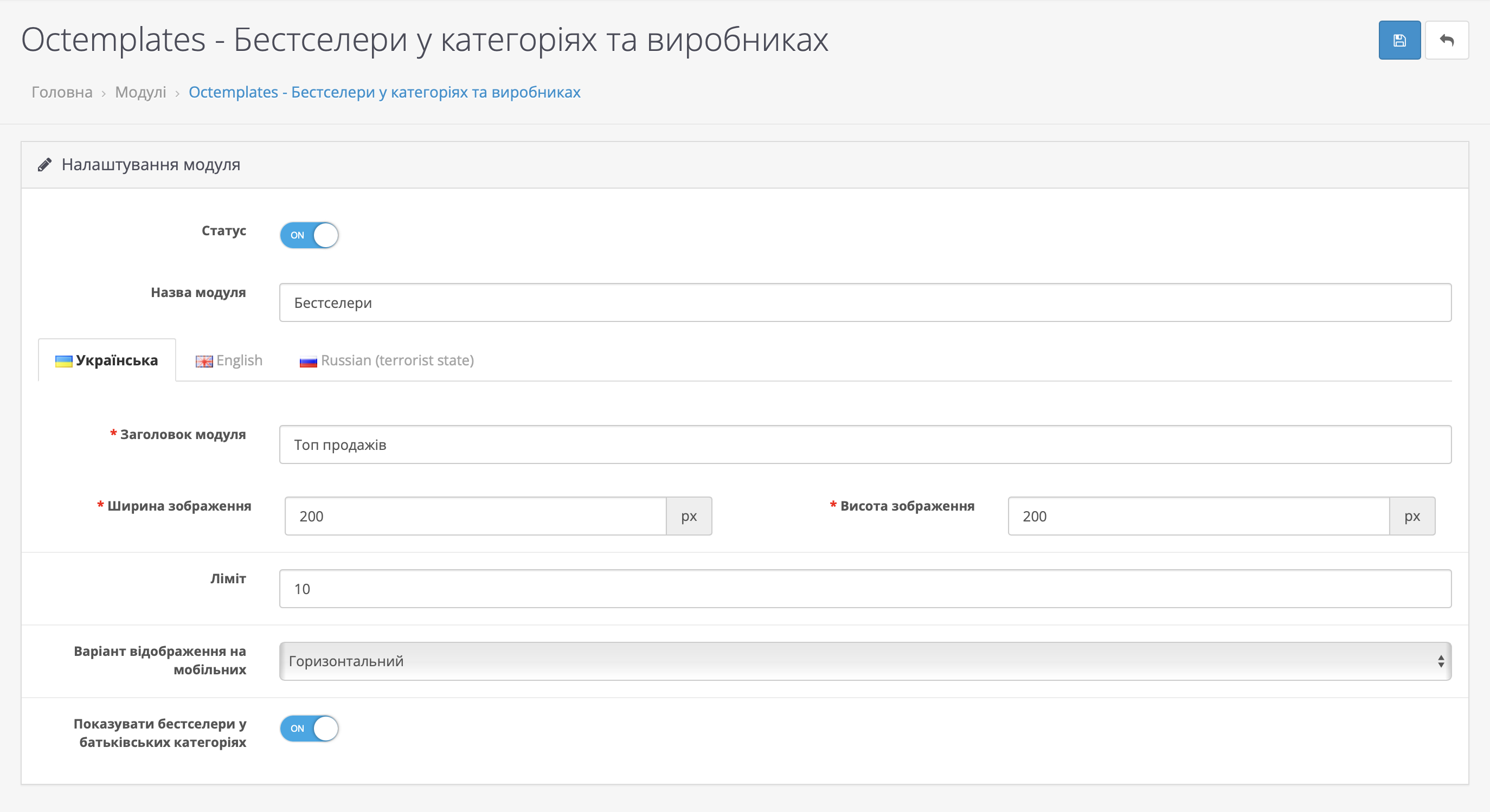 - "Заголовок модуля" дозволяє задати заголовок для блоку модуля, який виводитиметься на сторінках магазину;