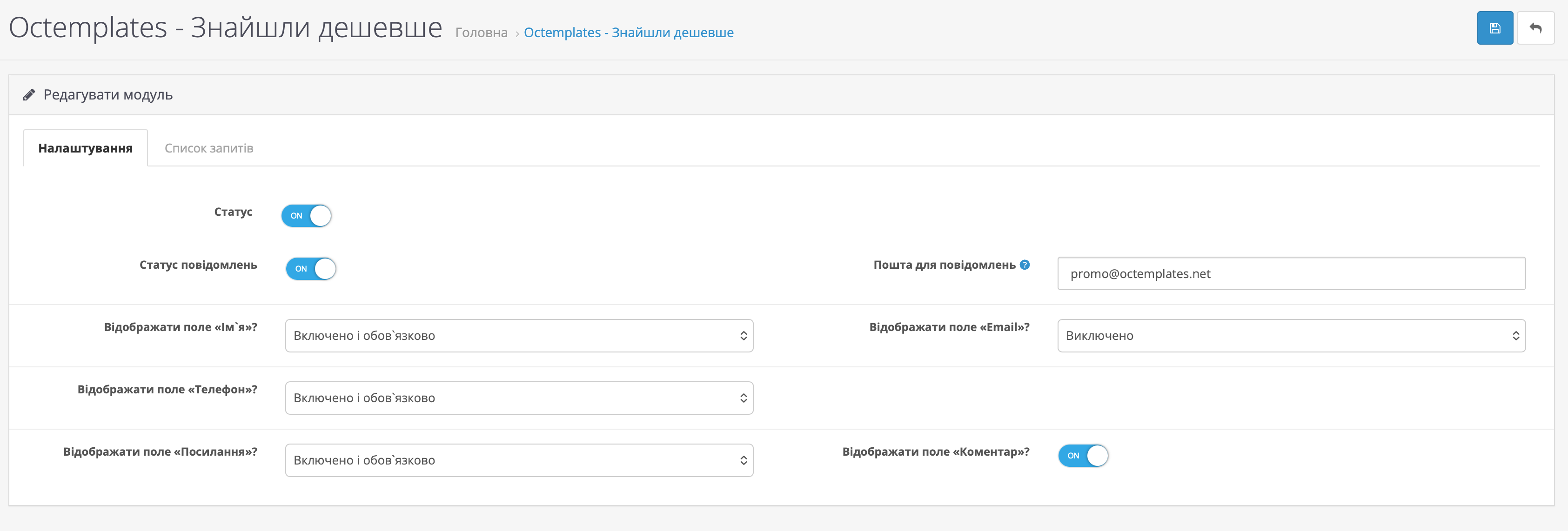 - "Статус повідомлень" - дозволяє вибрати, чи повідомляти адміністратора магазину про нову заявку по e-mail;
