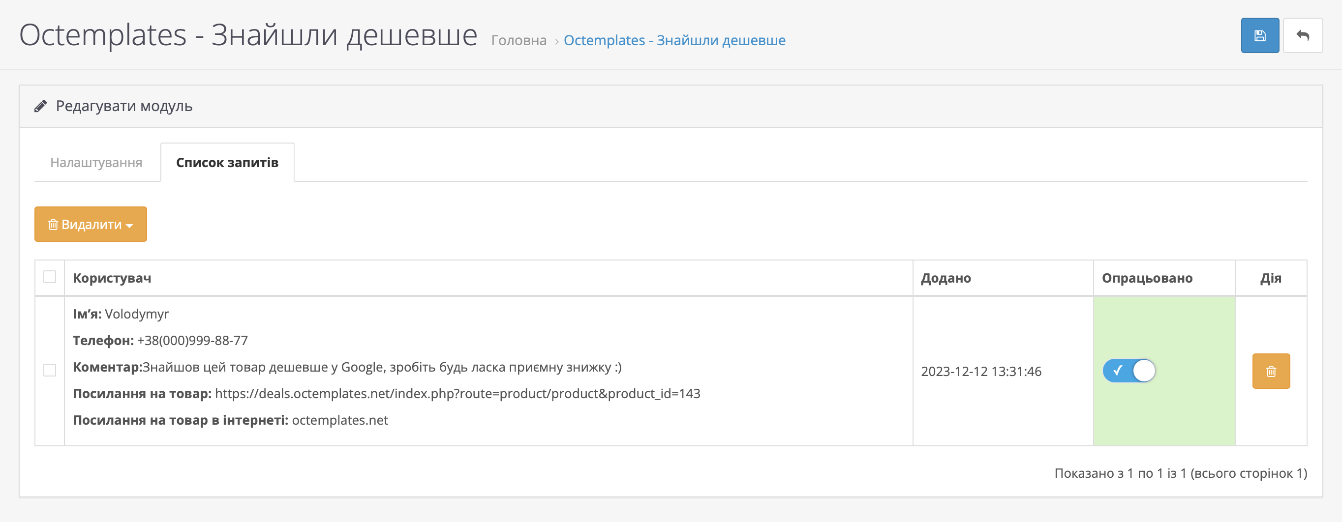 У вкладці "Список запитів" ви можете переглянути всі створені користувачами заявки. Також, ви можете помічати заявки як оброблені, додавати свої коментарі до запитів, а зайві заявки можна видалити як по одній, так і виділивши групами. Усі нові необроблені заявки матимуть червоне тло блоку, оброблені - зелене тло блоку.