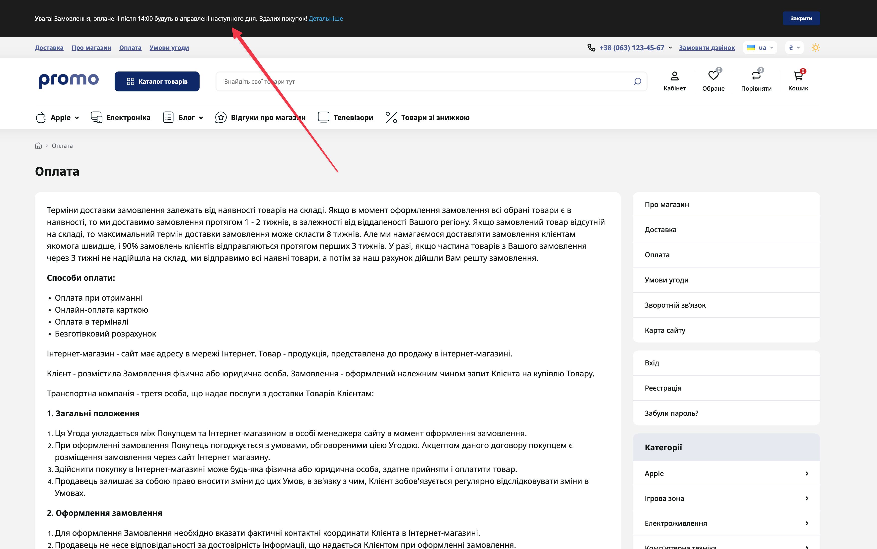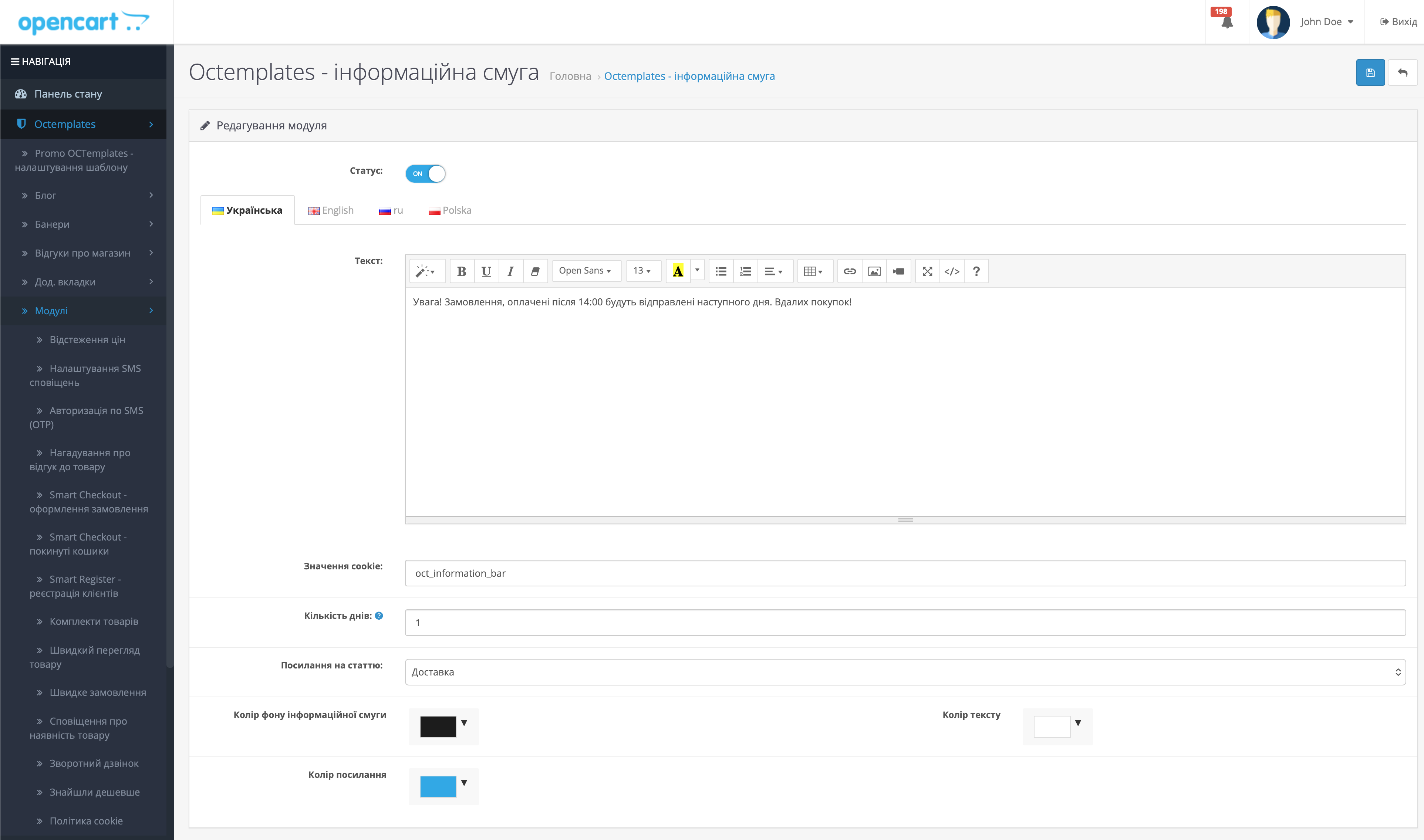 Модуль "Octemplates - Інформаційна смуга" дозволяє вивести вгорі сторінки блок з інформаційним повідомленням про акції, вихідні дні та іншу інформацію, на яку необхідно звернути увагу відвідувачів магазину.