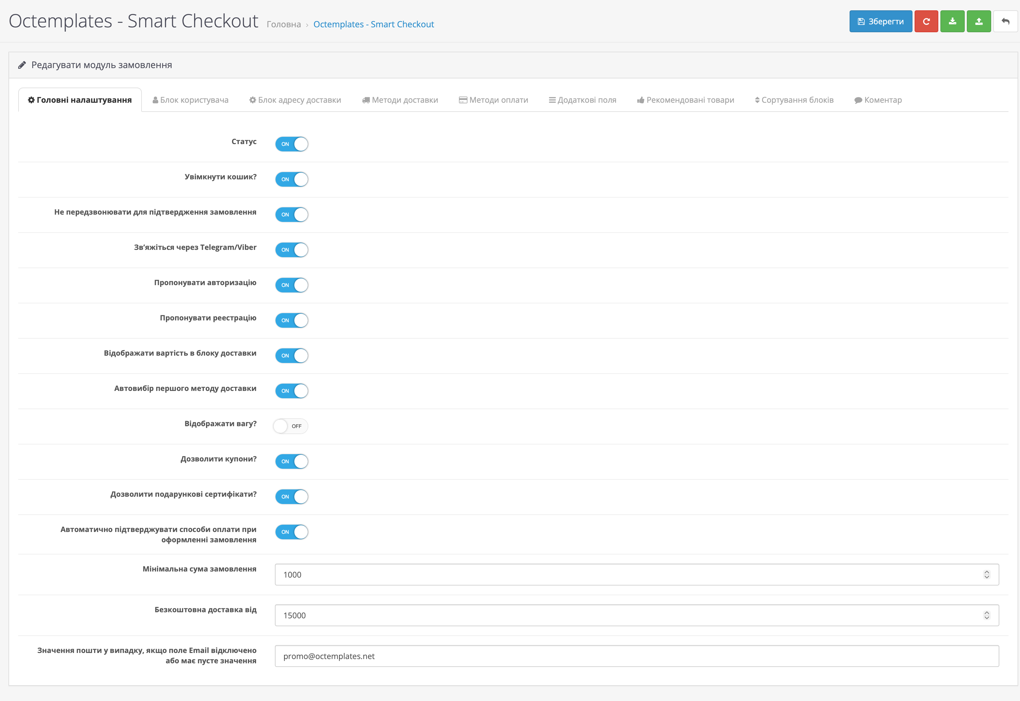 Для встановлення модуля "Octemplates - Оформлення замовлення" перейдіть у розділ "Octemplates - Модулі - Smart Сheckout - оформлення замовлення". Тут ви знайдете вкладки з доступними параметрами модуля.