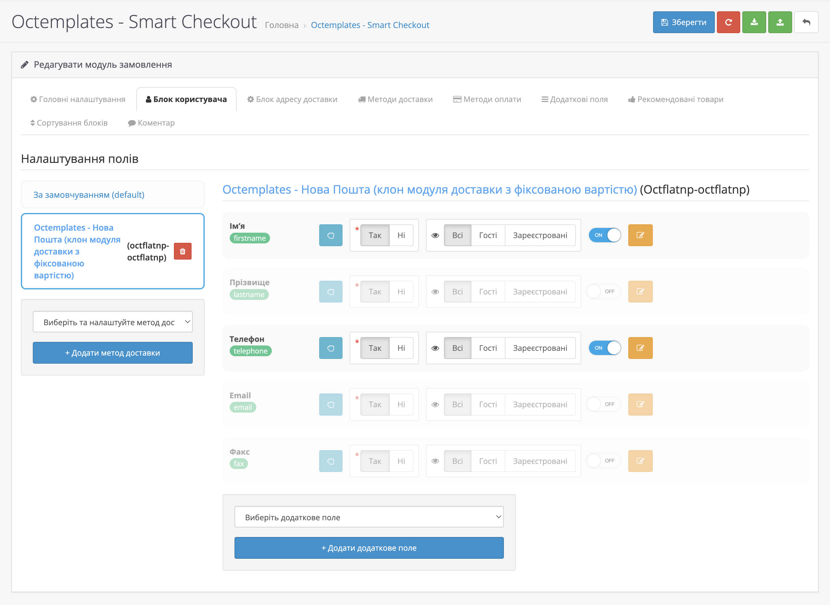 У вкладці "Блок користувача" можна налаштувати поля, які будуть відображатися в блоці користувача під час оформлення замовлення. Тут можна налаштувати набір полів за замовчуванням, додати додаткові поля, а також налаштувати для кожного метода доставки поля довільним способом. Поля можна сортувати перетаскуванням, натиснувши та утримуючи натиснутою відповідну кнопку з курсором.