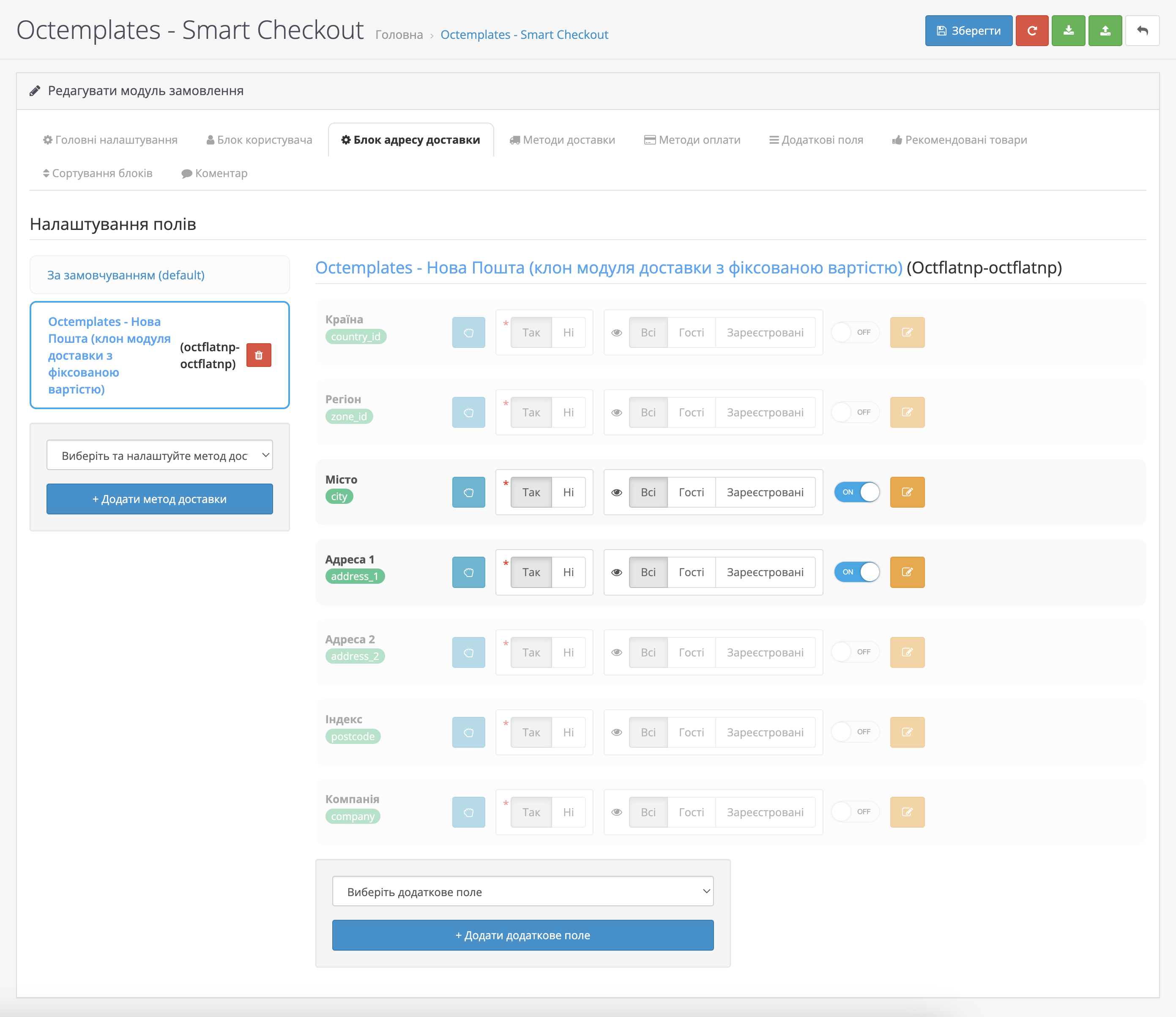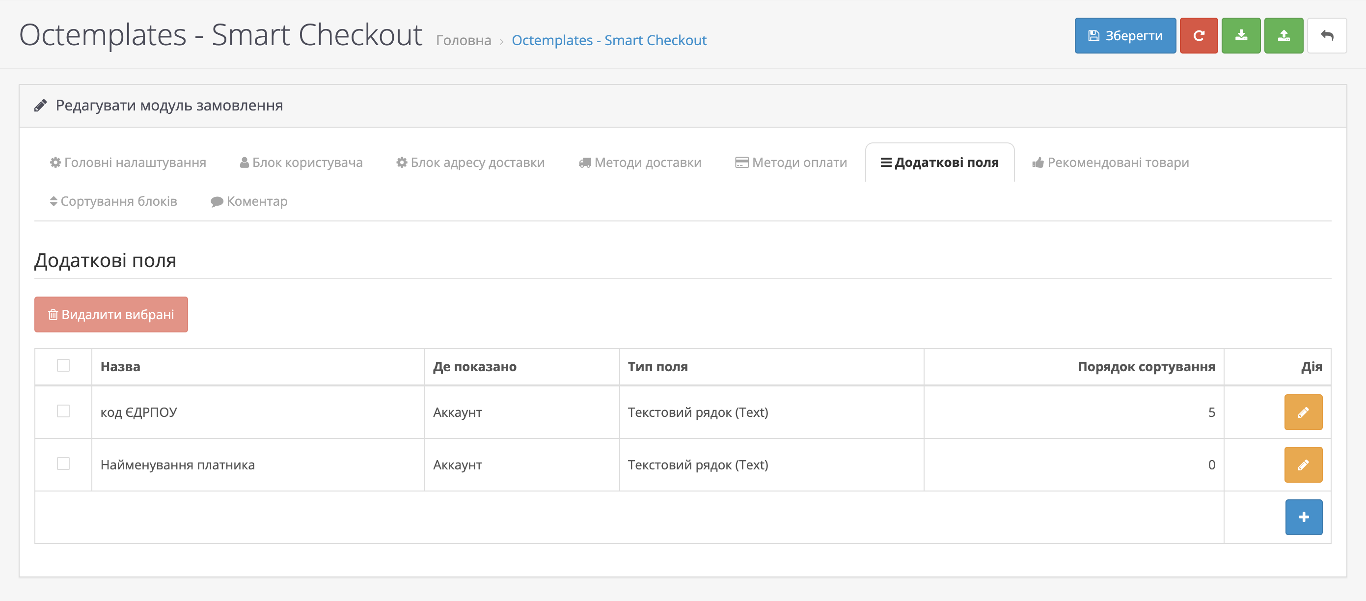У вкладці "Додаткові поля" можна налаштувати додаткові поля для показу в тому чи іншому блоці під час оформлення замовлення. Тут ви зможете додавати нові поля, редагувати та видаляти існуючі.