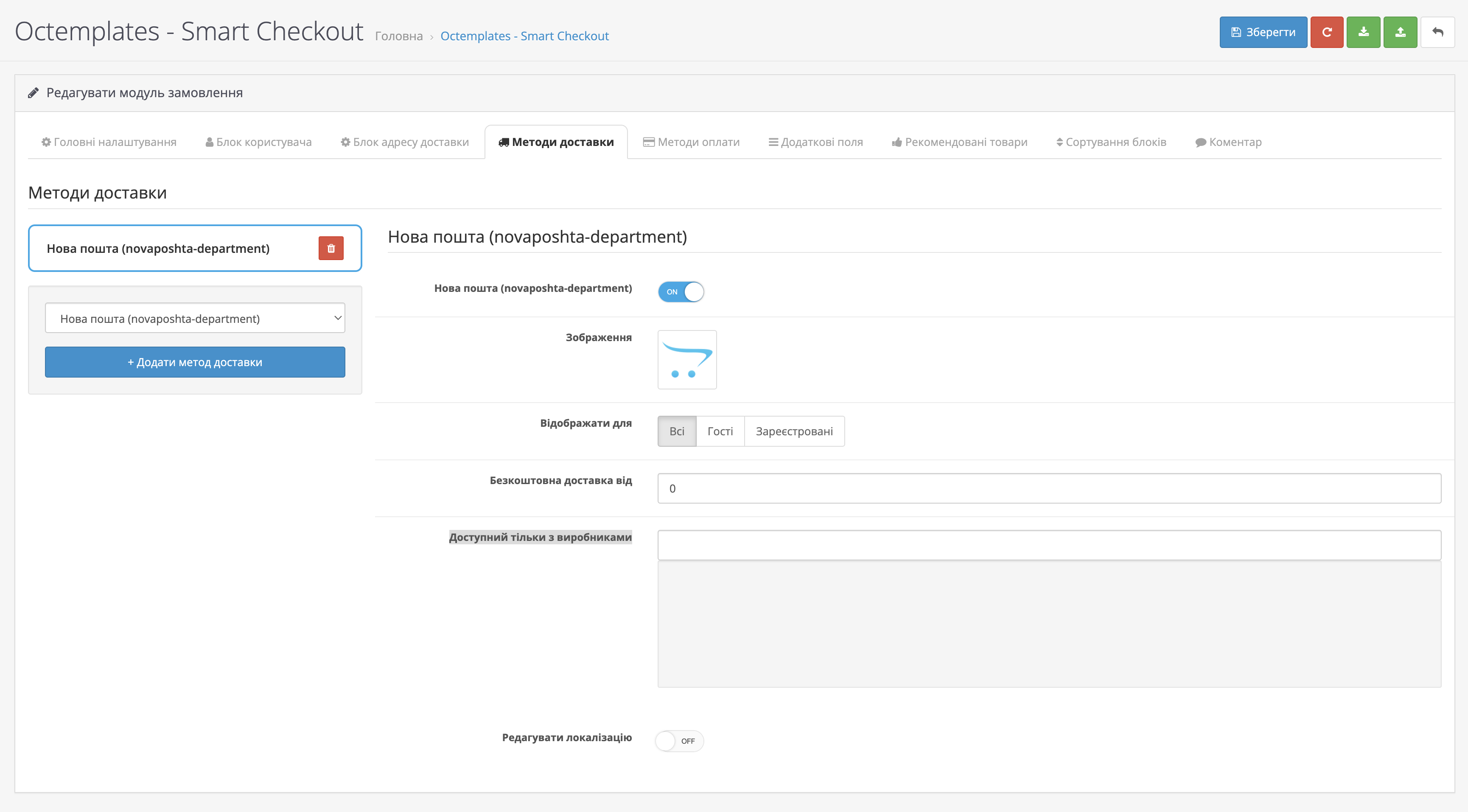 - "Редагувати локалізацію" - дозволяє відредагувати заголовок та назву методу доставки.
