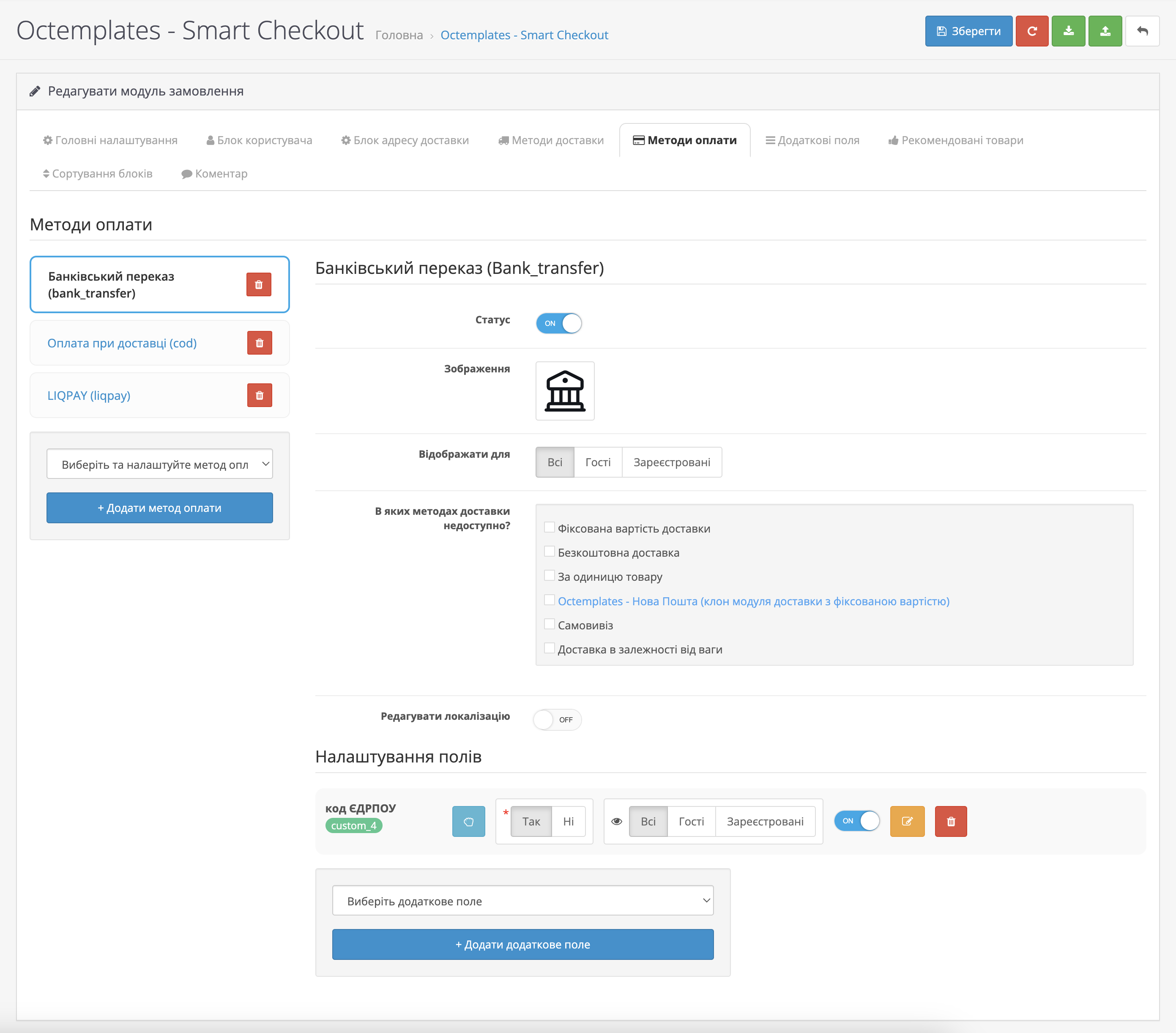 Також ви можете налаштувати додаткові поля для кожного окремого методу оплати. Доступні такі налаштування:
