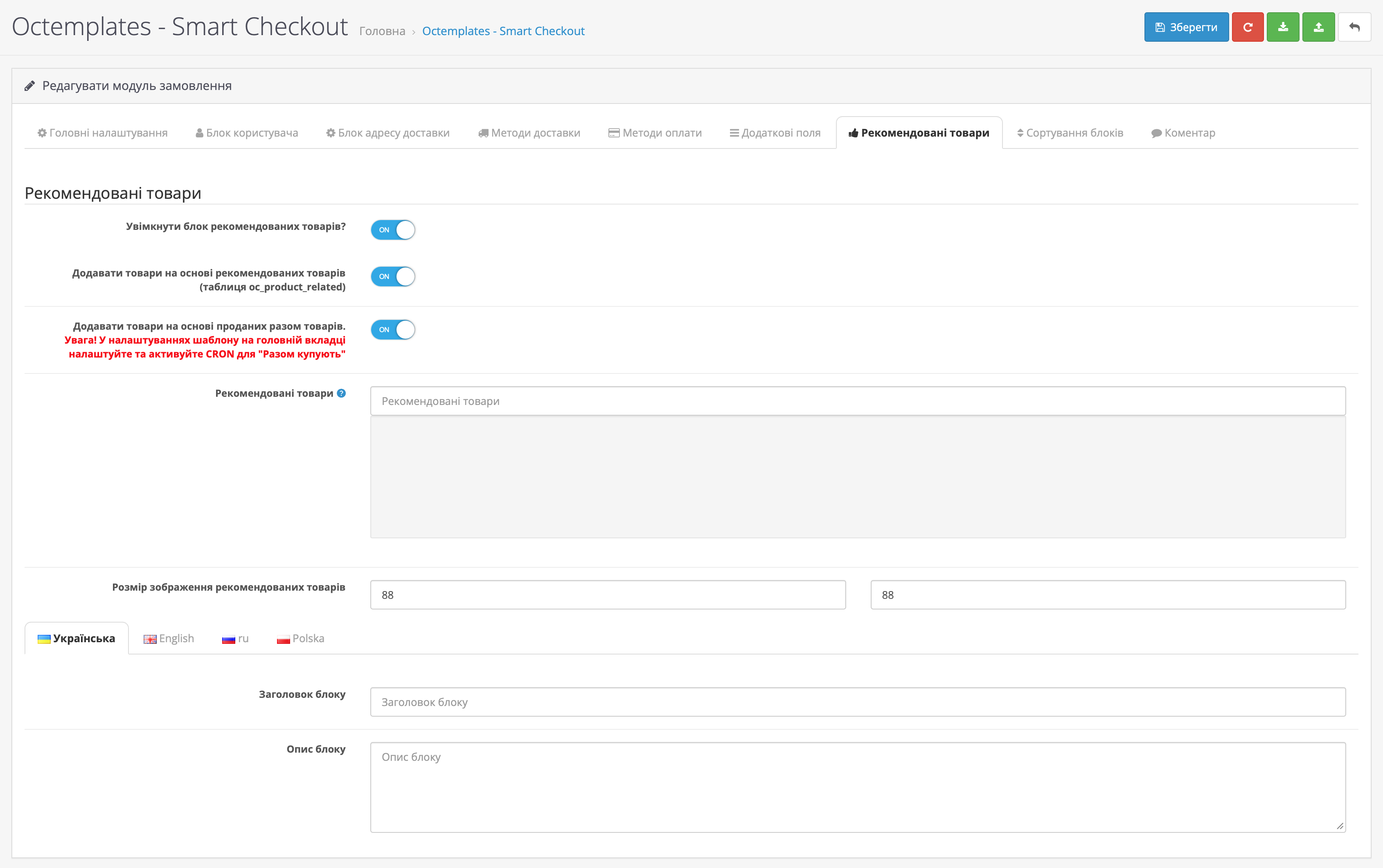 - "Увімкнути блок рекомендованих товарів?" дозволяє активувати відображення блоку рекомендованих товарів на сторінці оформлення замовлення;
