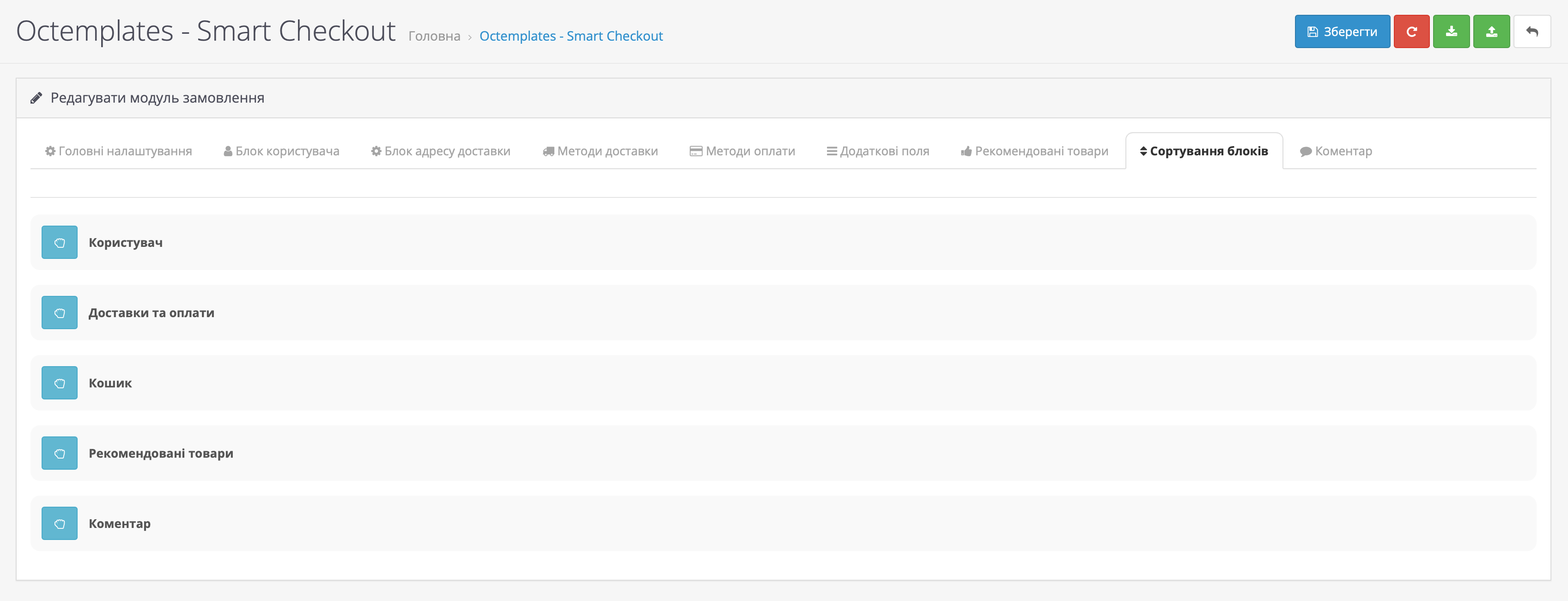 У вкладці "Сортування блоків" можна налаштувати порядок відображення блоків на сторінці оформлення замовлення. Блоки можна сортувати перетаскуванням, натиснувши та утримуючи натиснутою відповідну кнопку з курсором.