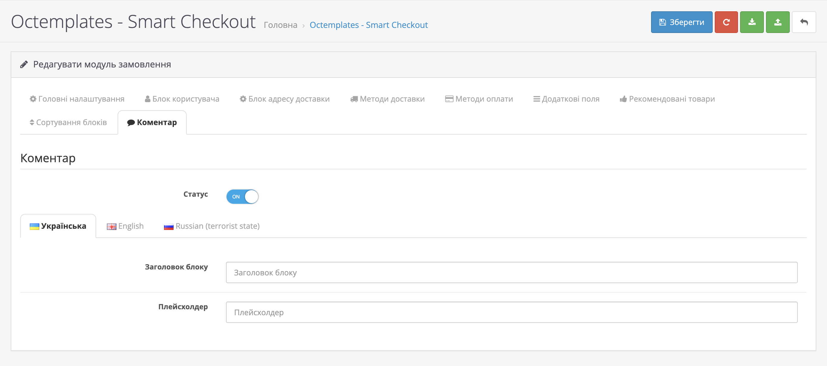 - "Статус" - дозволяє ввімкнути або вимкнути відображення блоку для коментаря покупців;