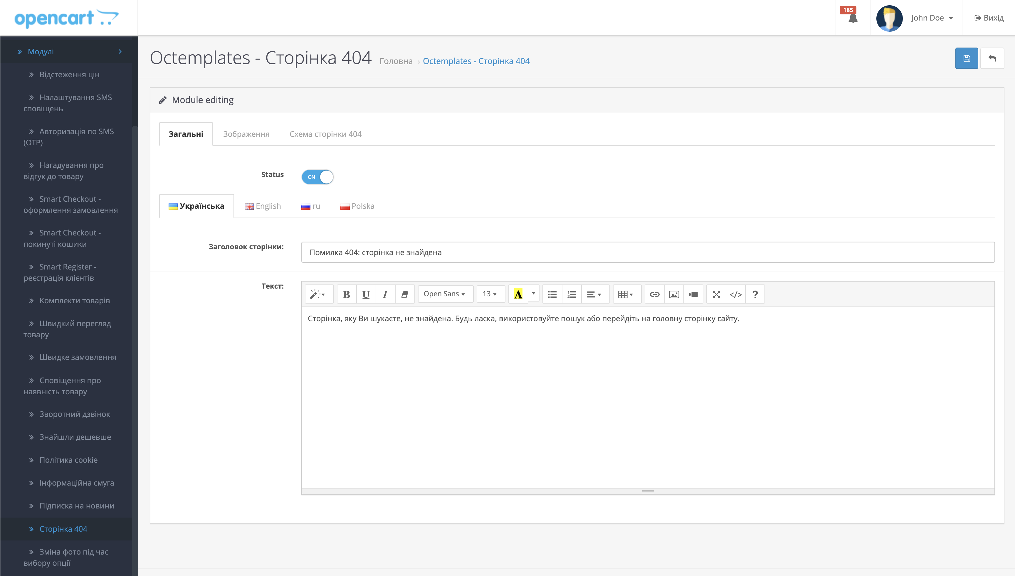 - "Статус" - дозволяє включити\вимкнути модуль "Octemplates - Сторінка 404";