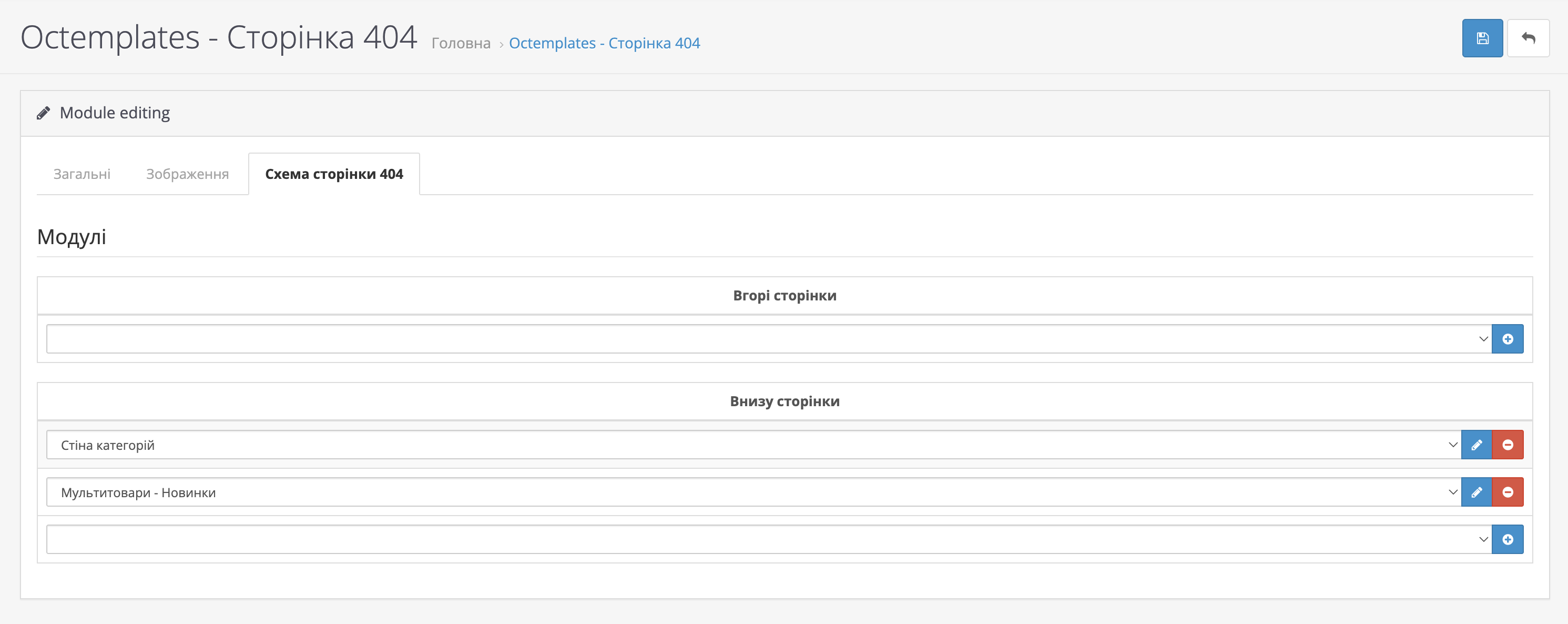 У вкладці "Схема сторінки 404" ви зможете вивести будь-який модуль, який призначений для виведення в content-top або content-bottom без переходу на сторінку налаштування схем.