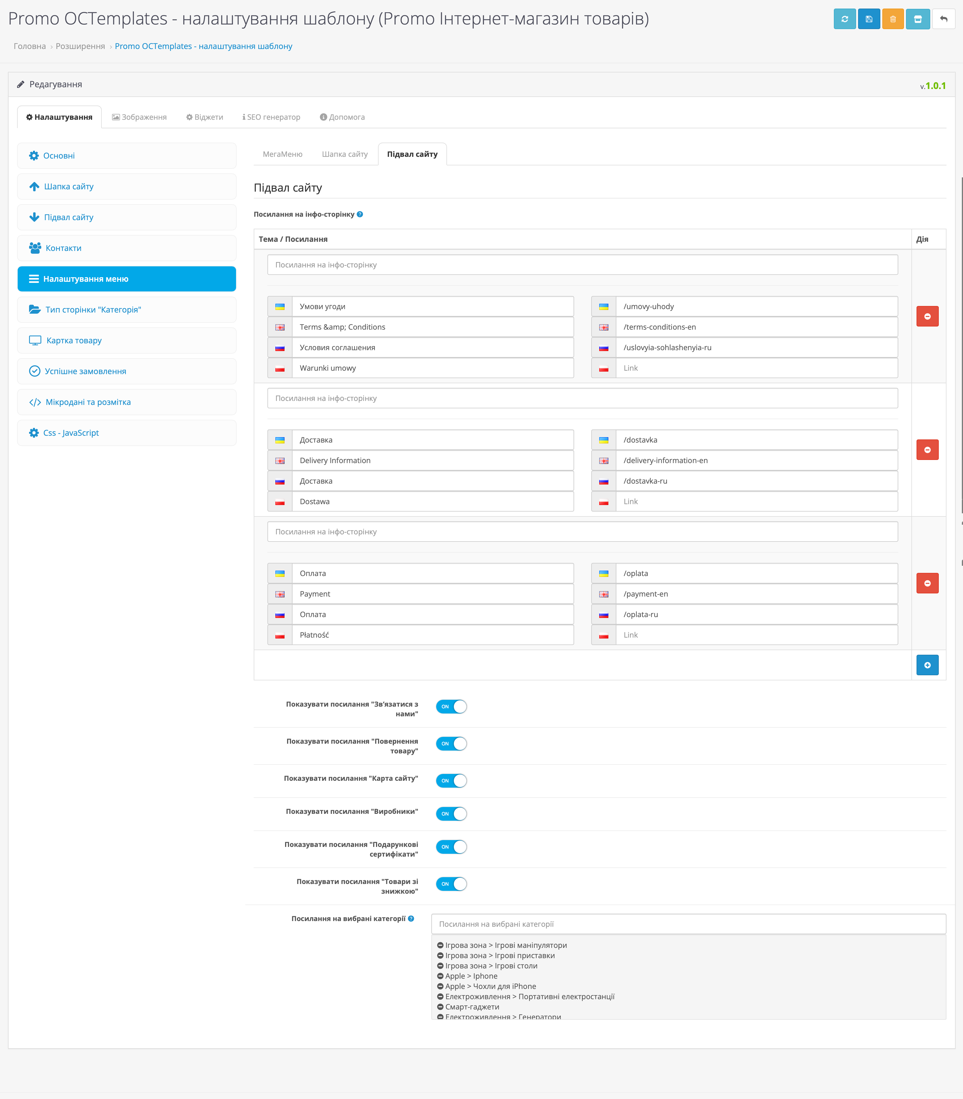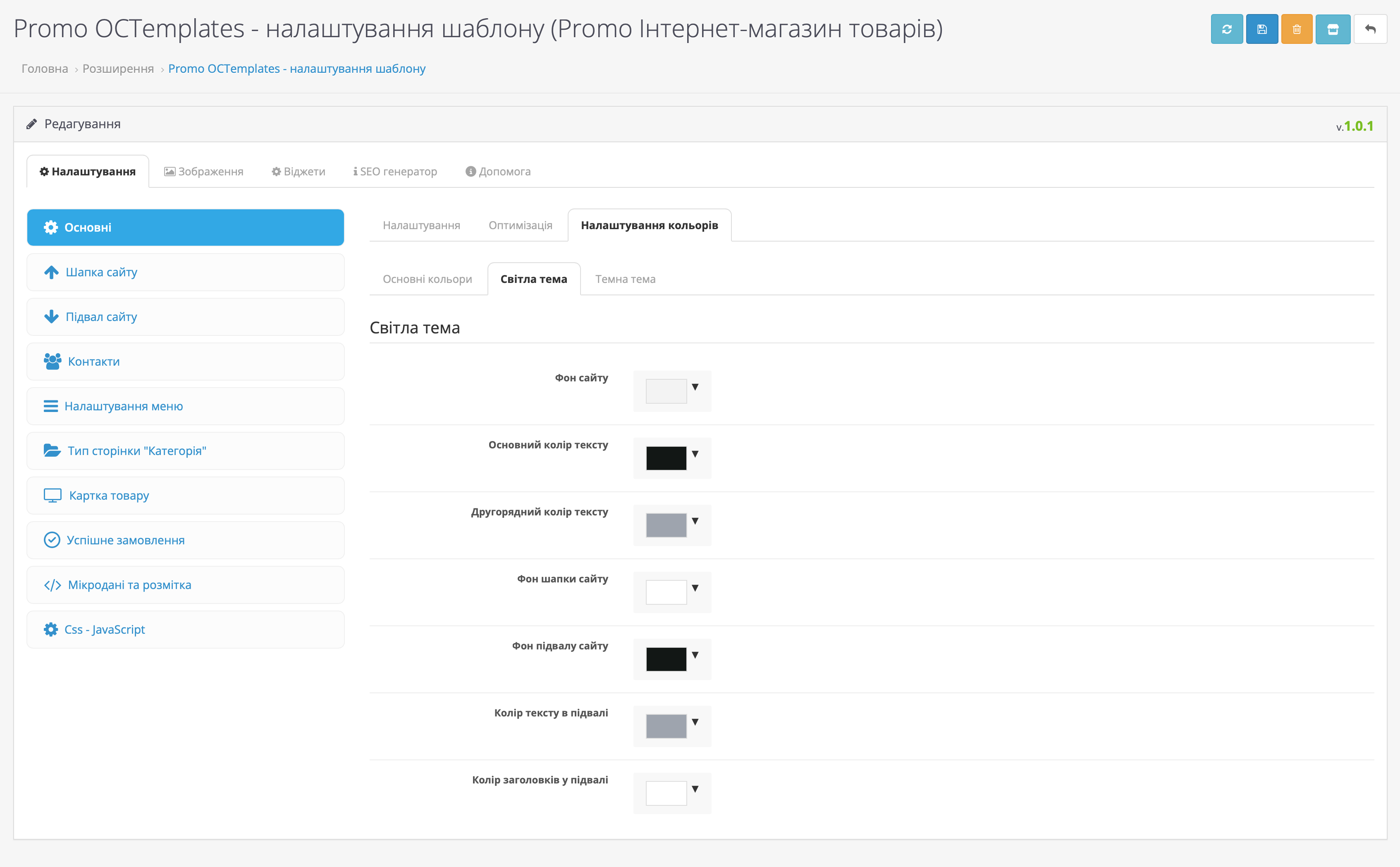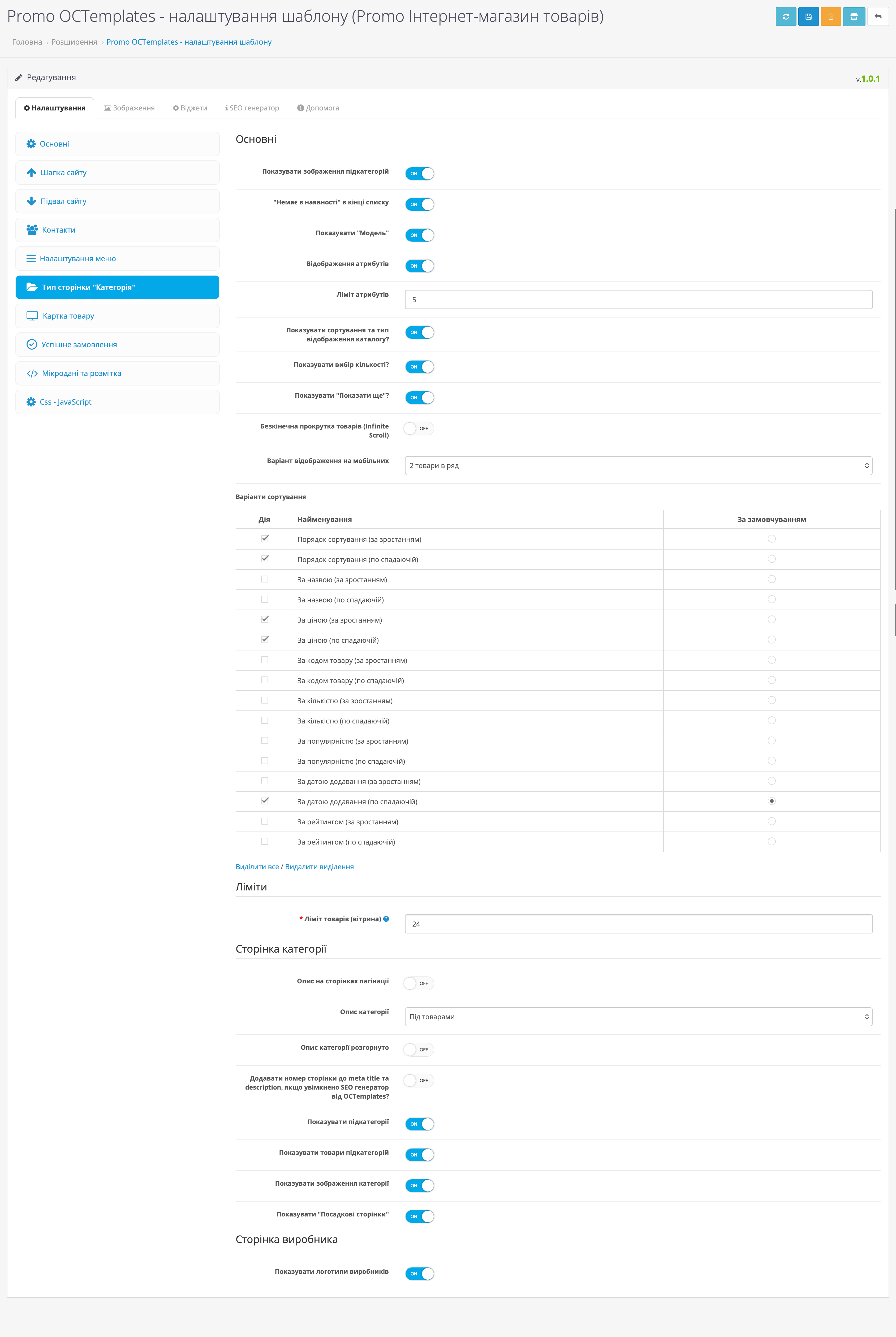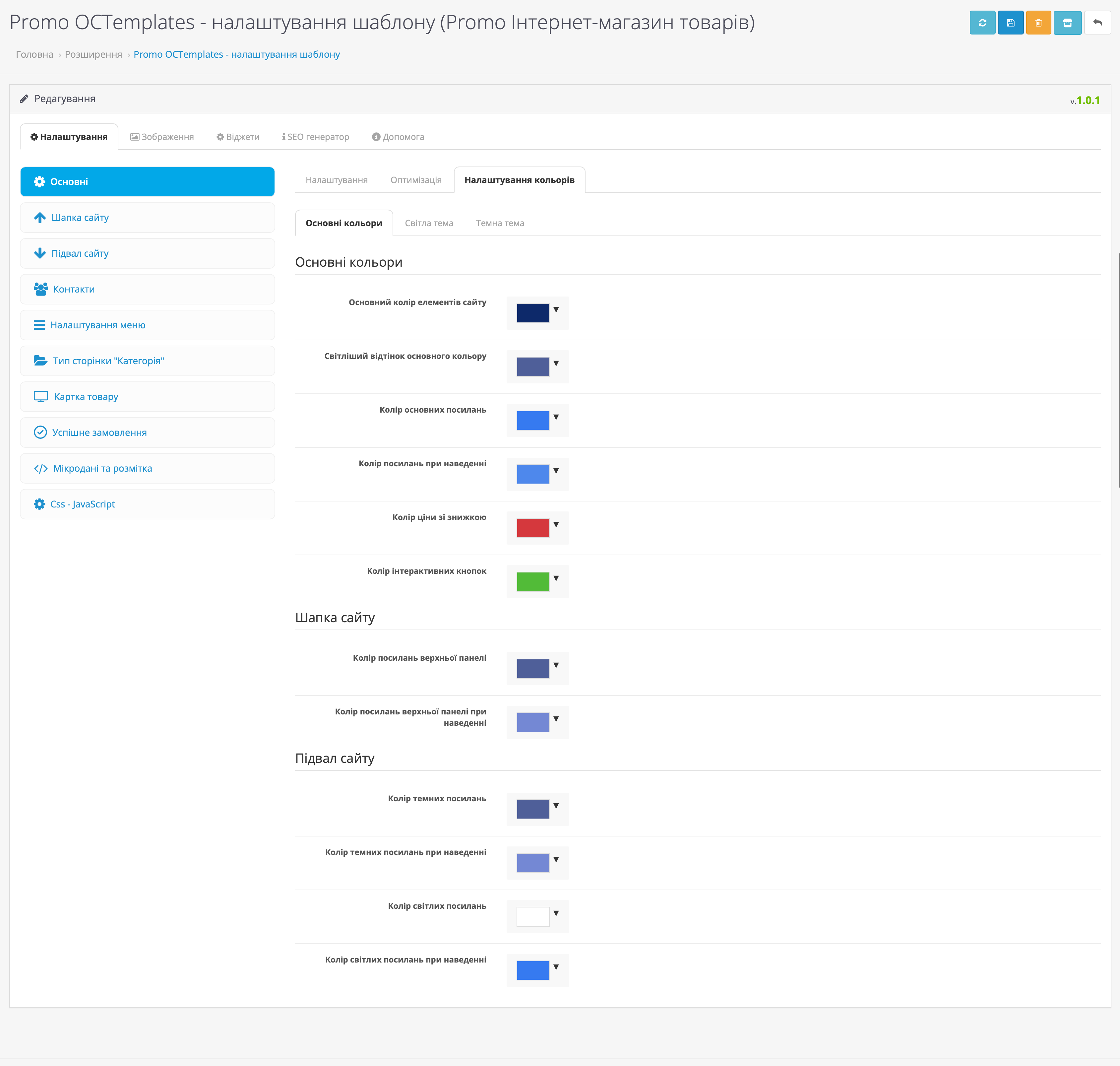 Модуль "Promo OCTemplates - налаштування шаблону" містить основні налаштування шаблону, які зручно структуровані за вкладками.