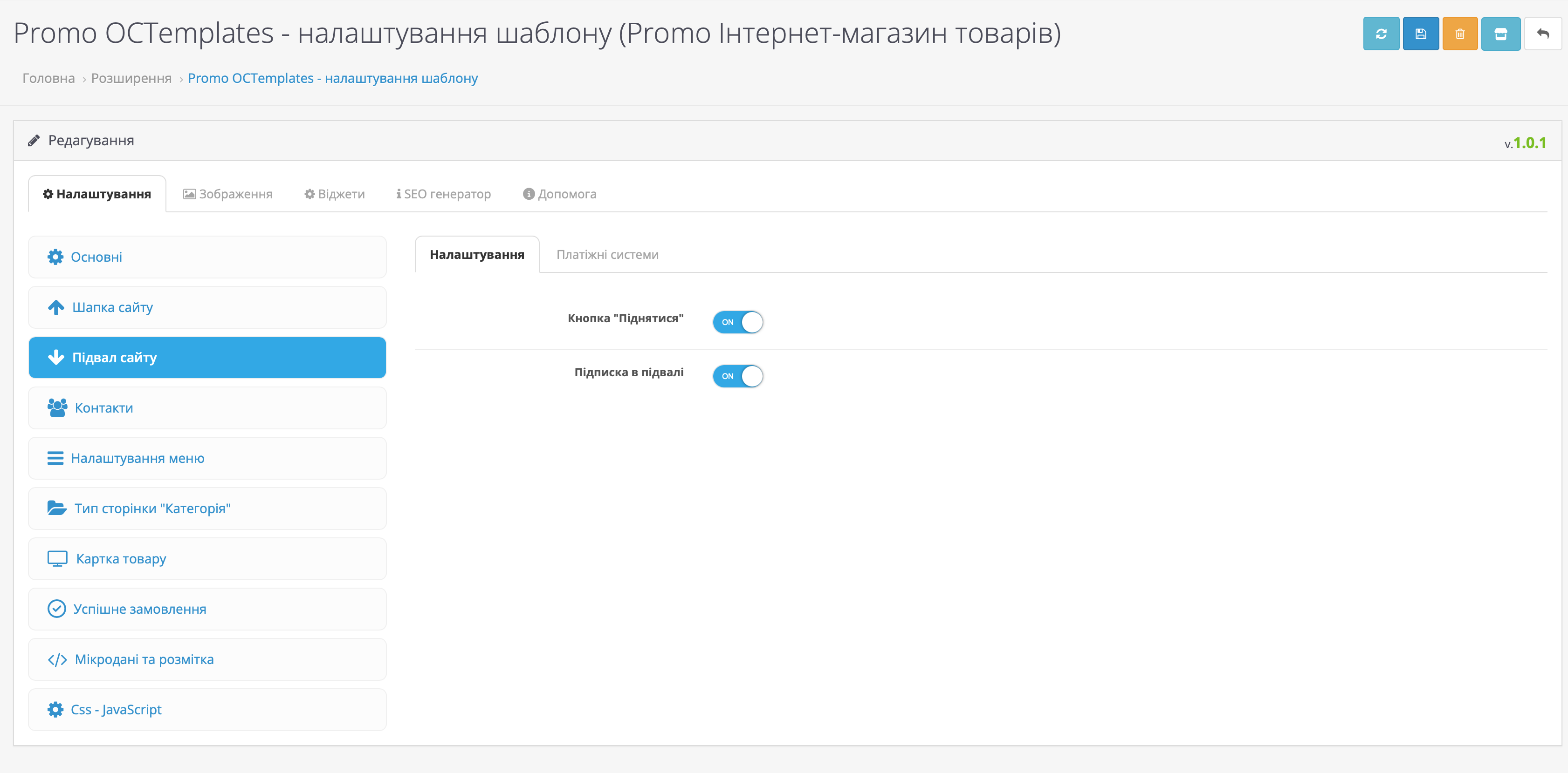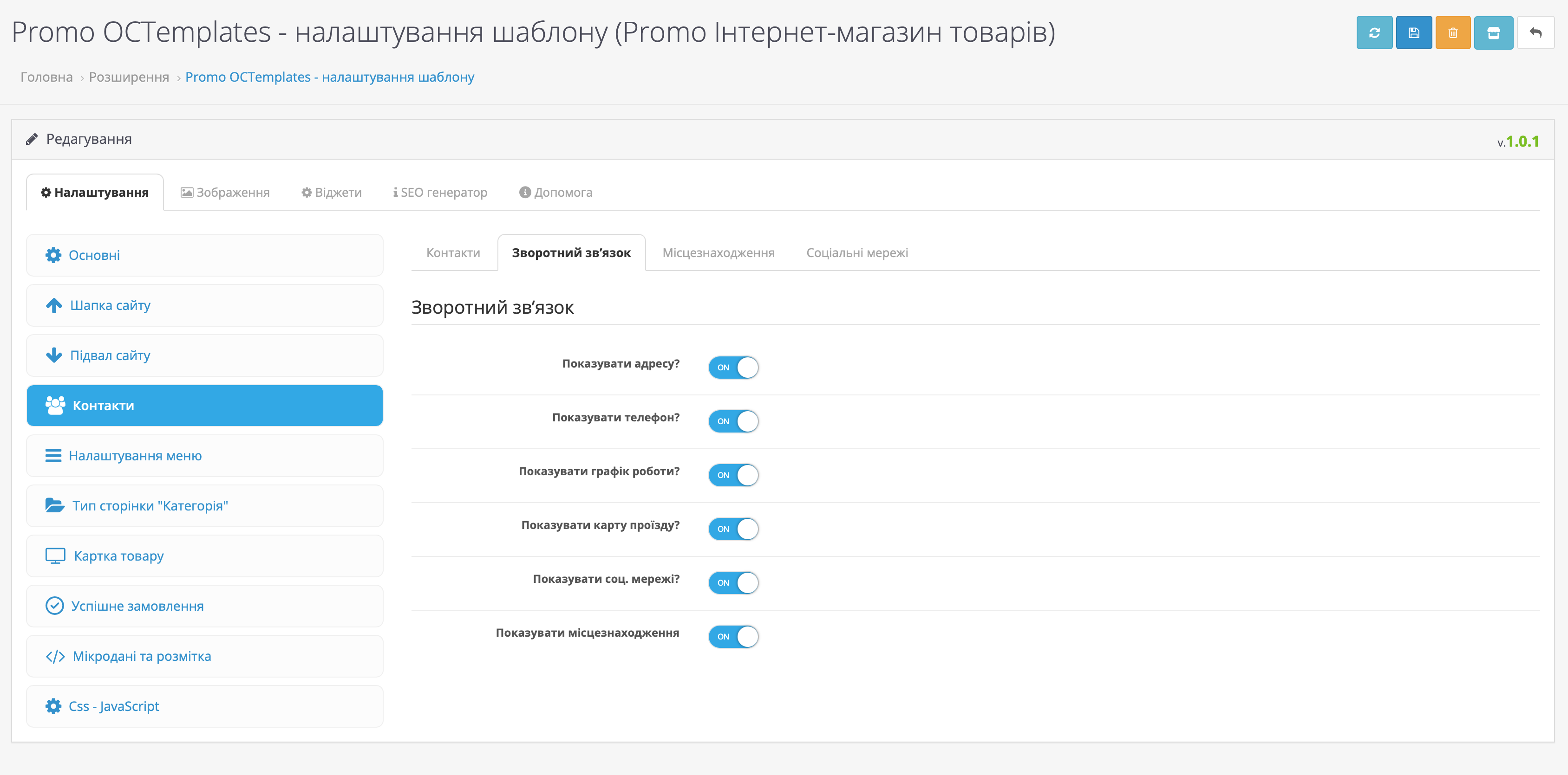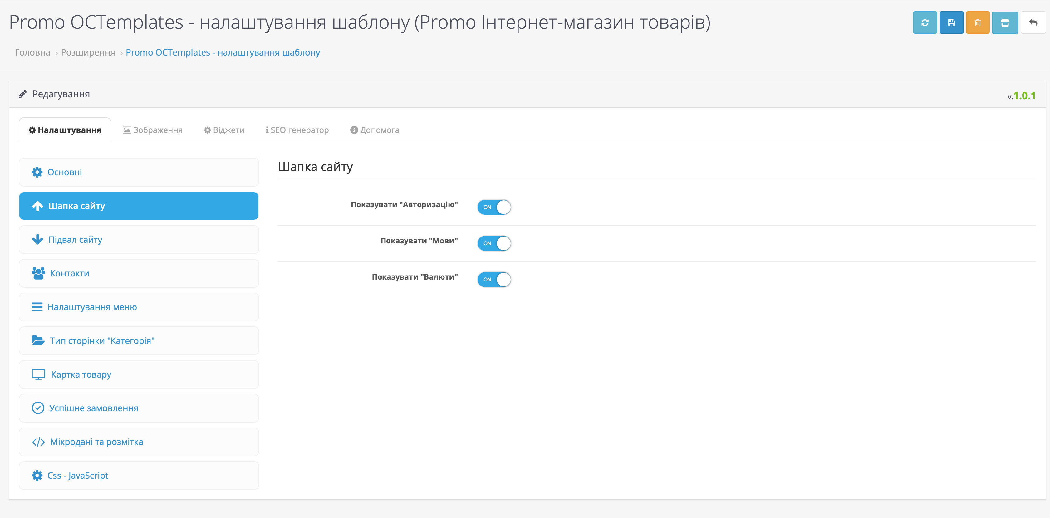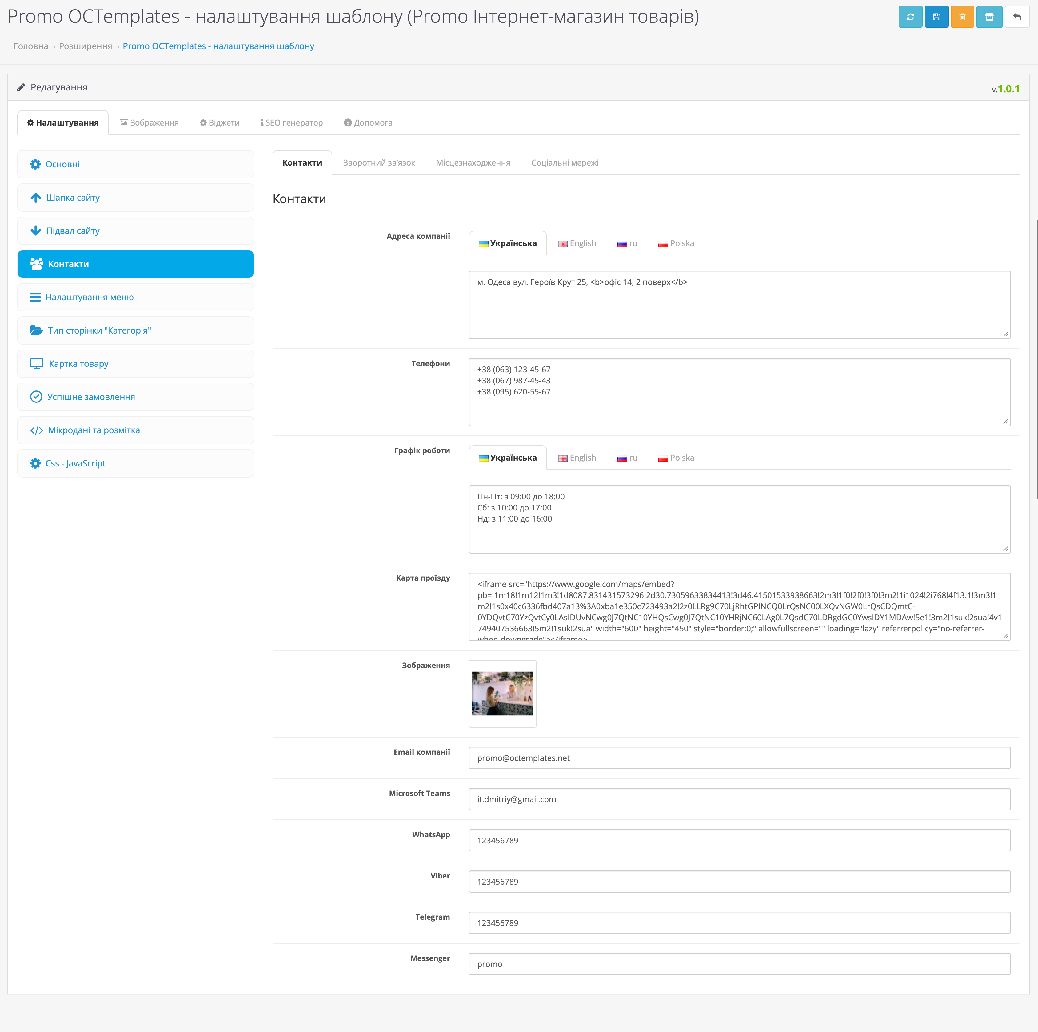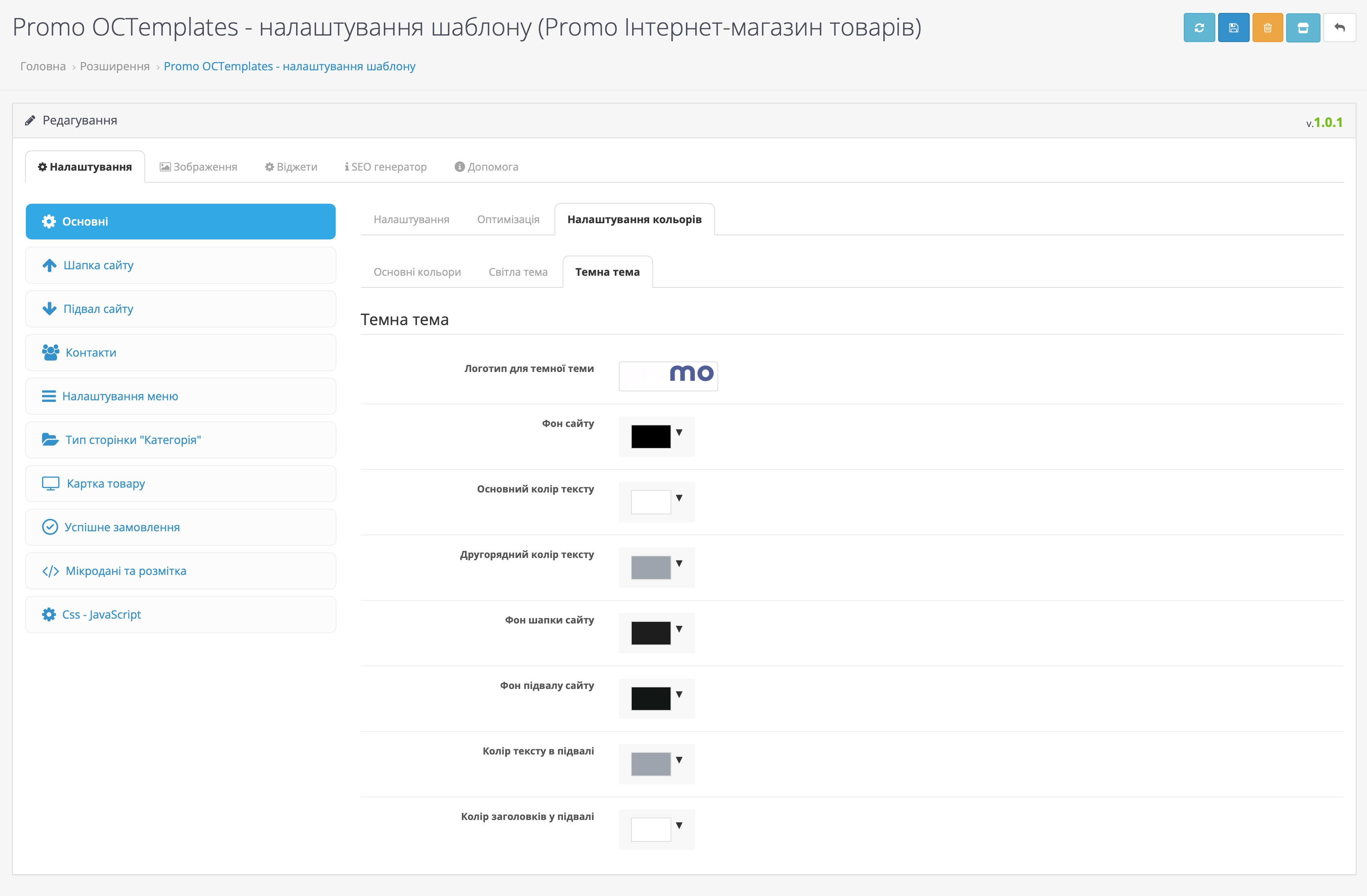 Модуль "Promo OCTemplates - налаштування шаблону" містить основні налаштування шаблону, які зручно структуровані за вкладками.