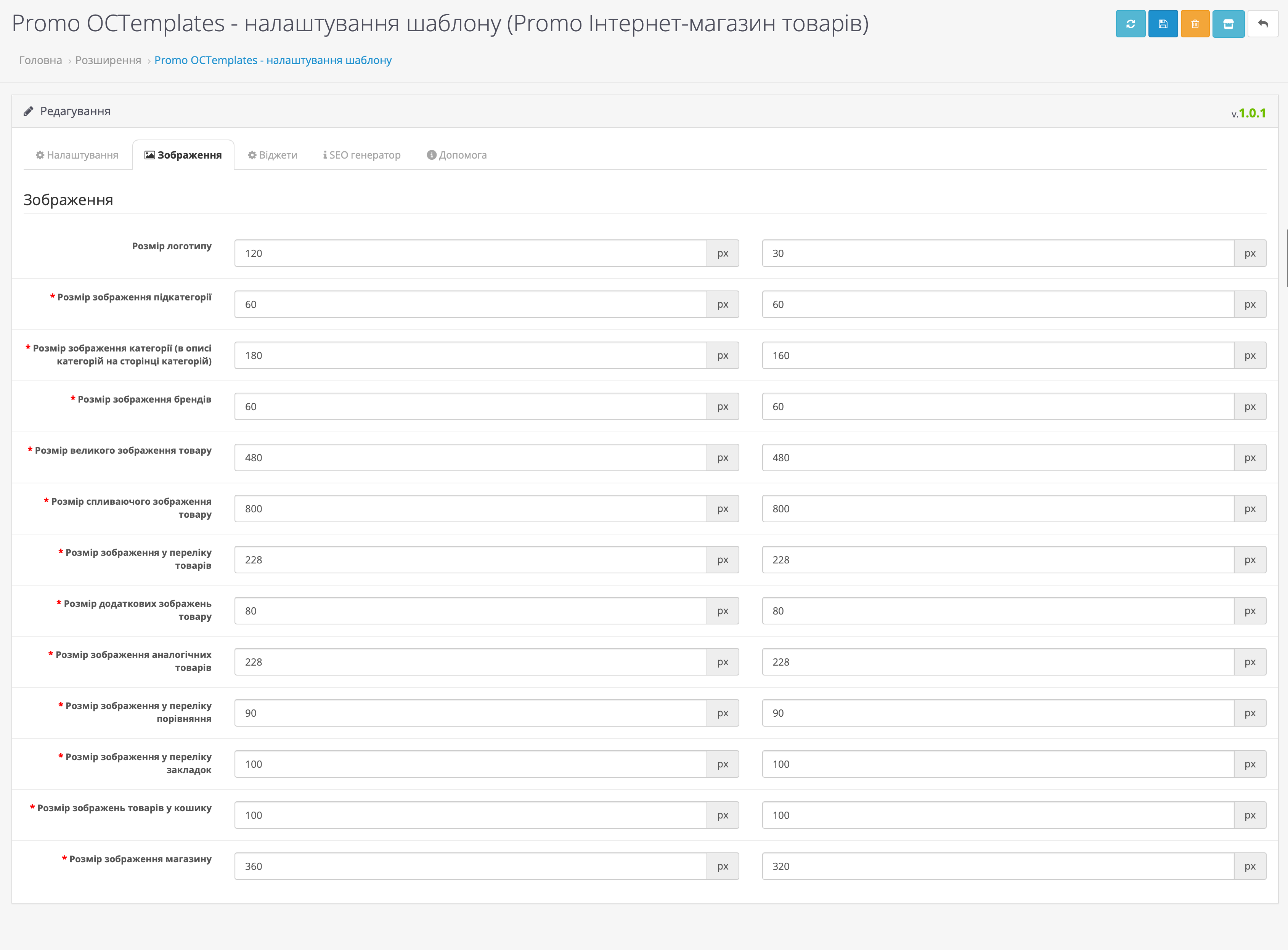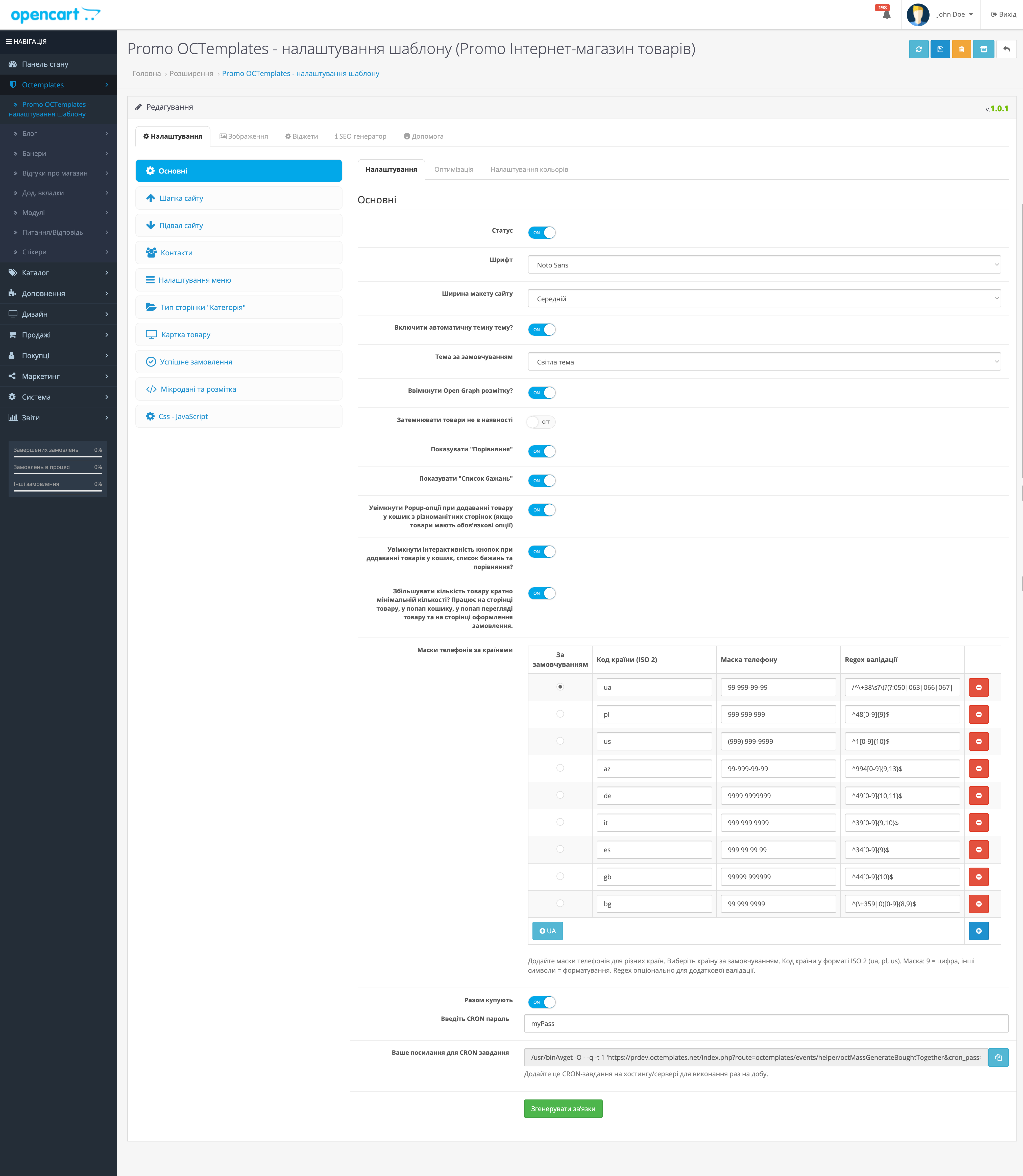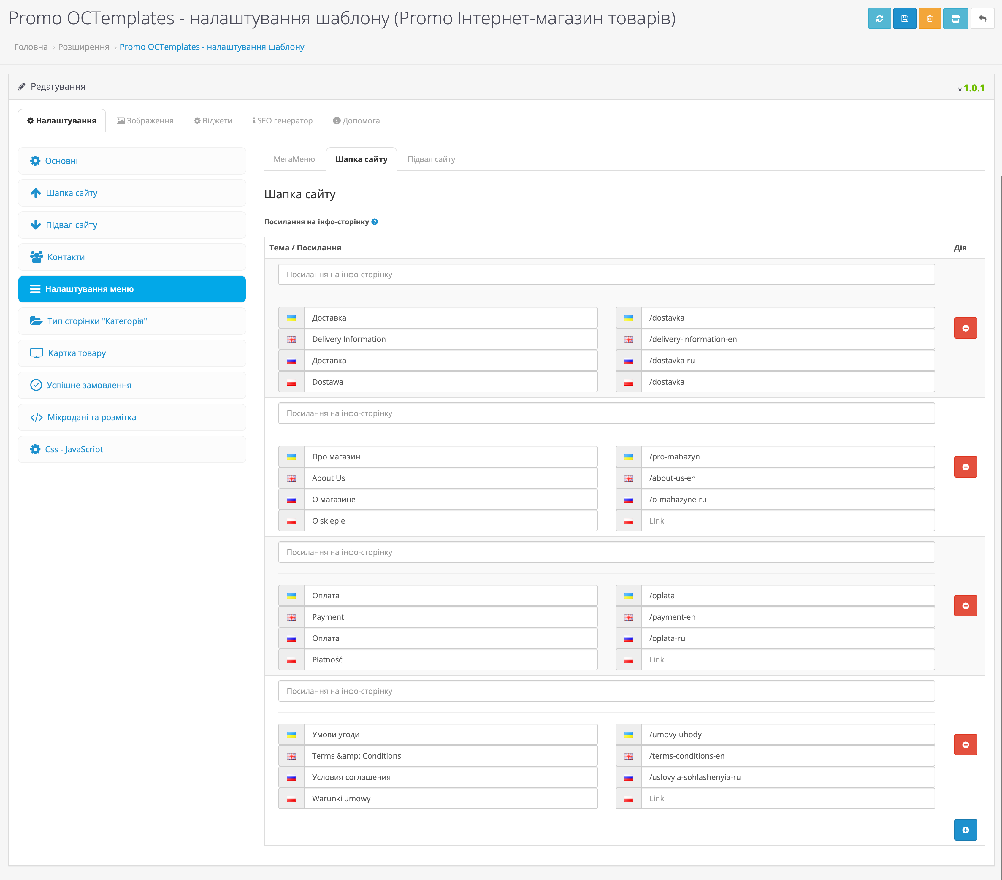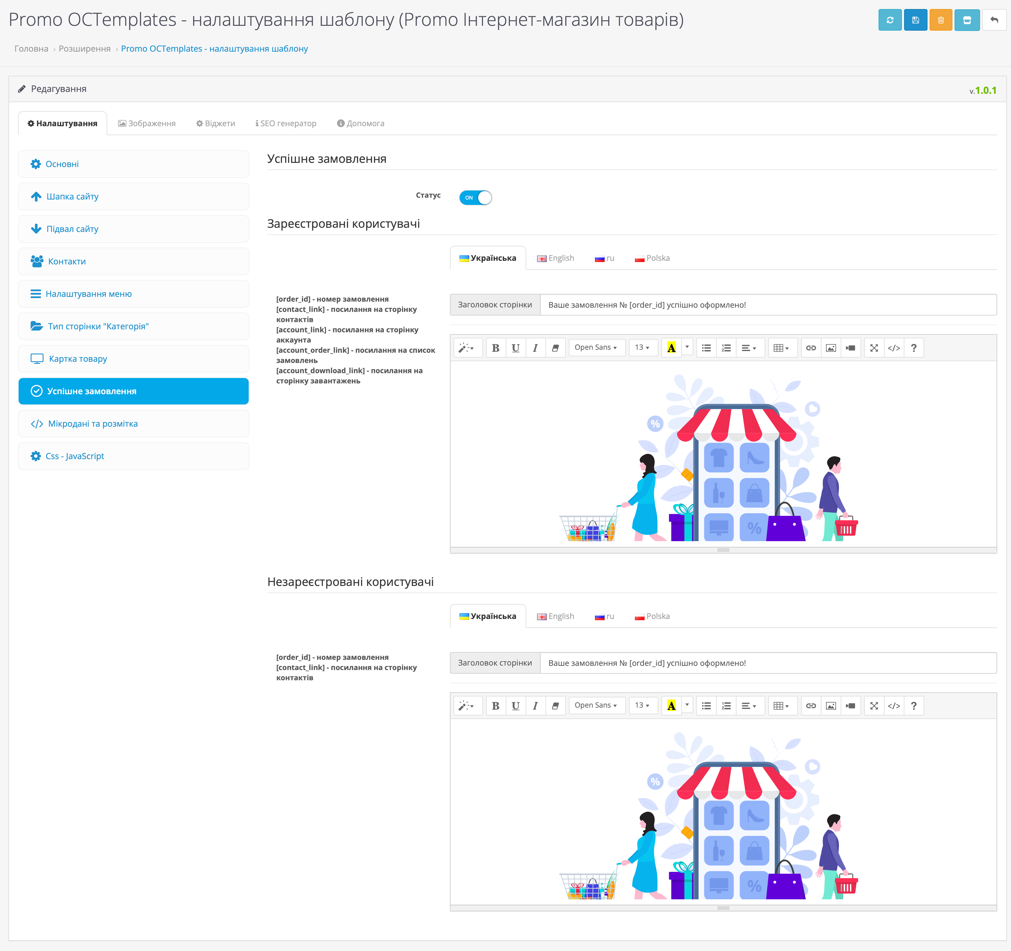 Модуль "Promo OCTemplates - налаштування шаблону" містить основні налаштування шаблону, які зручно структуровані за вкладками.