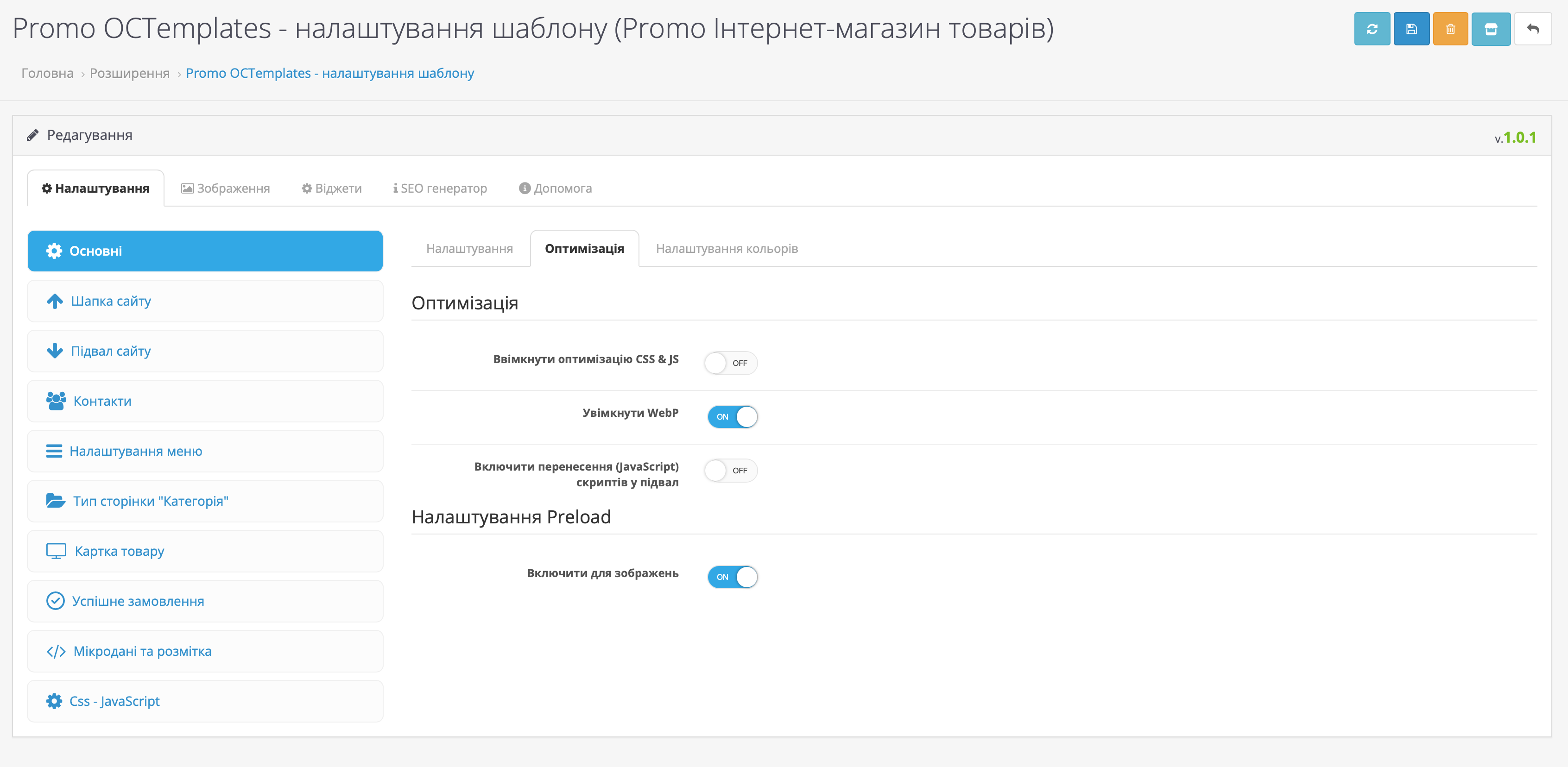 - "Ввімкнути оптимізацію CSS & JS" дозволяє включити\вимкнути стиснення та мініфікацію стилів та скриптів шаблону для швидшої роботи сайту (під час налаштування модуля, тимчасово рекомендується вимкнути оптимізацію CSS та JS.);