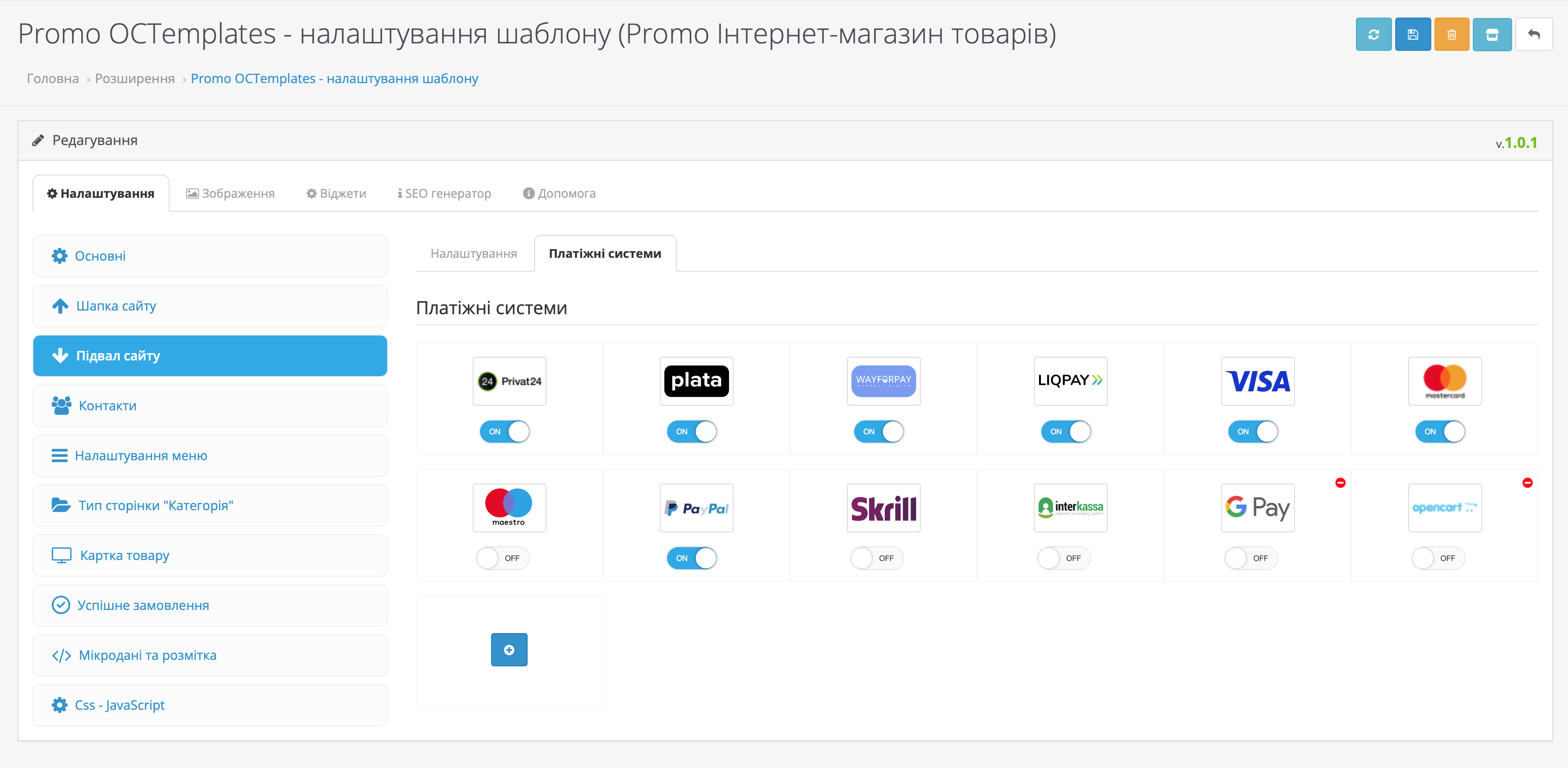 1.3.2. У вкладці "Платіжні системи" ви зможете включити\відключити необхідні вам платіжні системи, логотипи яких виводяться в підвалі сайту.