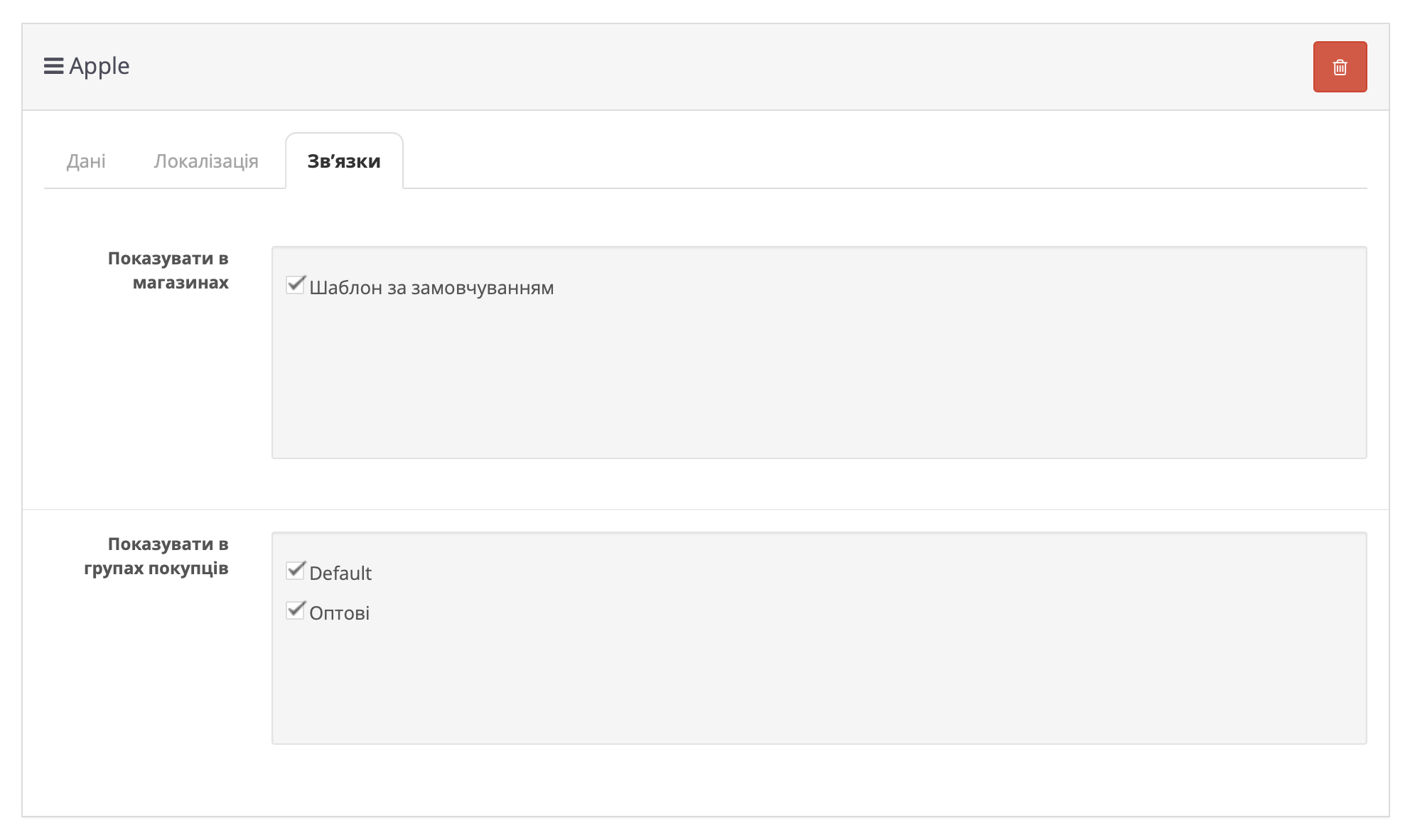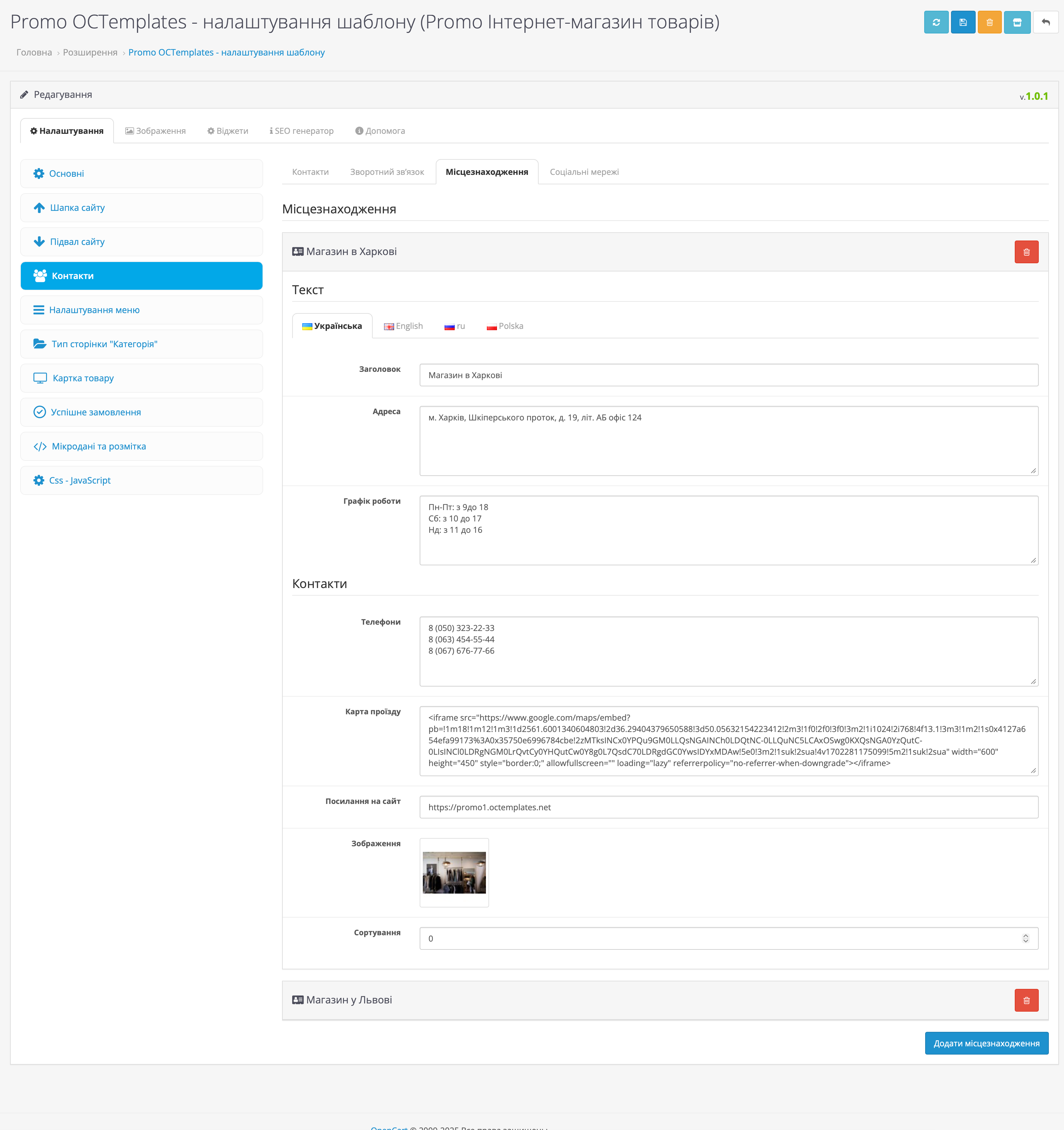 - "Показуватимісцезнаходженнядозволяє увімкнути\вимкнути відображення блоків з контактами додаткових філій магазину (див. налаштування вкладки "Місцезнаходження").