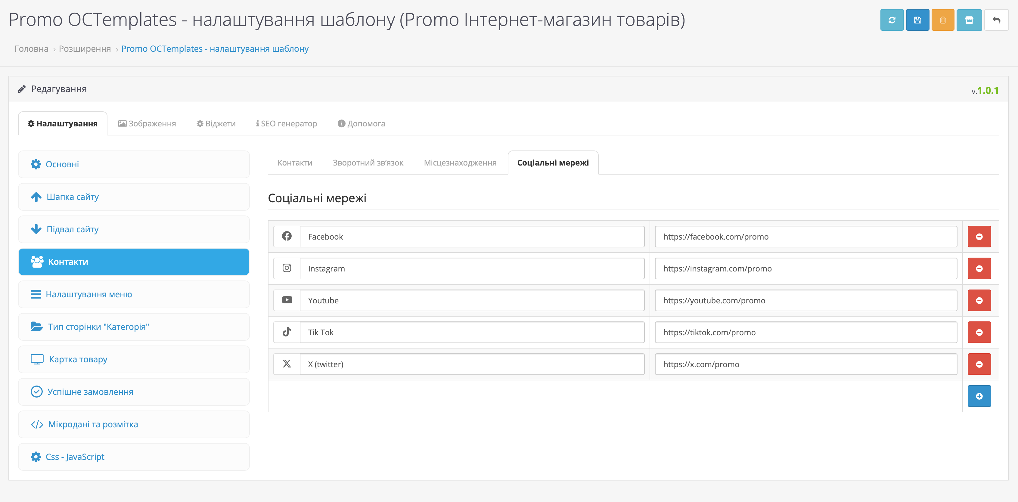 1.4.4. У вкладці "Соціальні мережі" ви зможете вказати посилання на сторінки акаунтів у популярних соціальних мережах та вибрати іконку, яка відображатиметься на кнопці соцмережі у підвалі сайту, на сторінці контактів та у dropdown з контактами в шапці сайту.