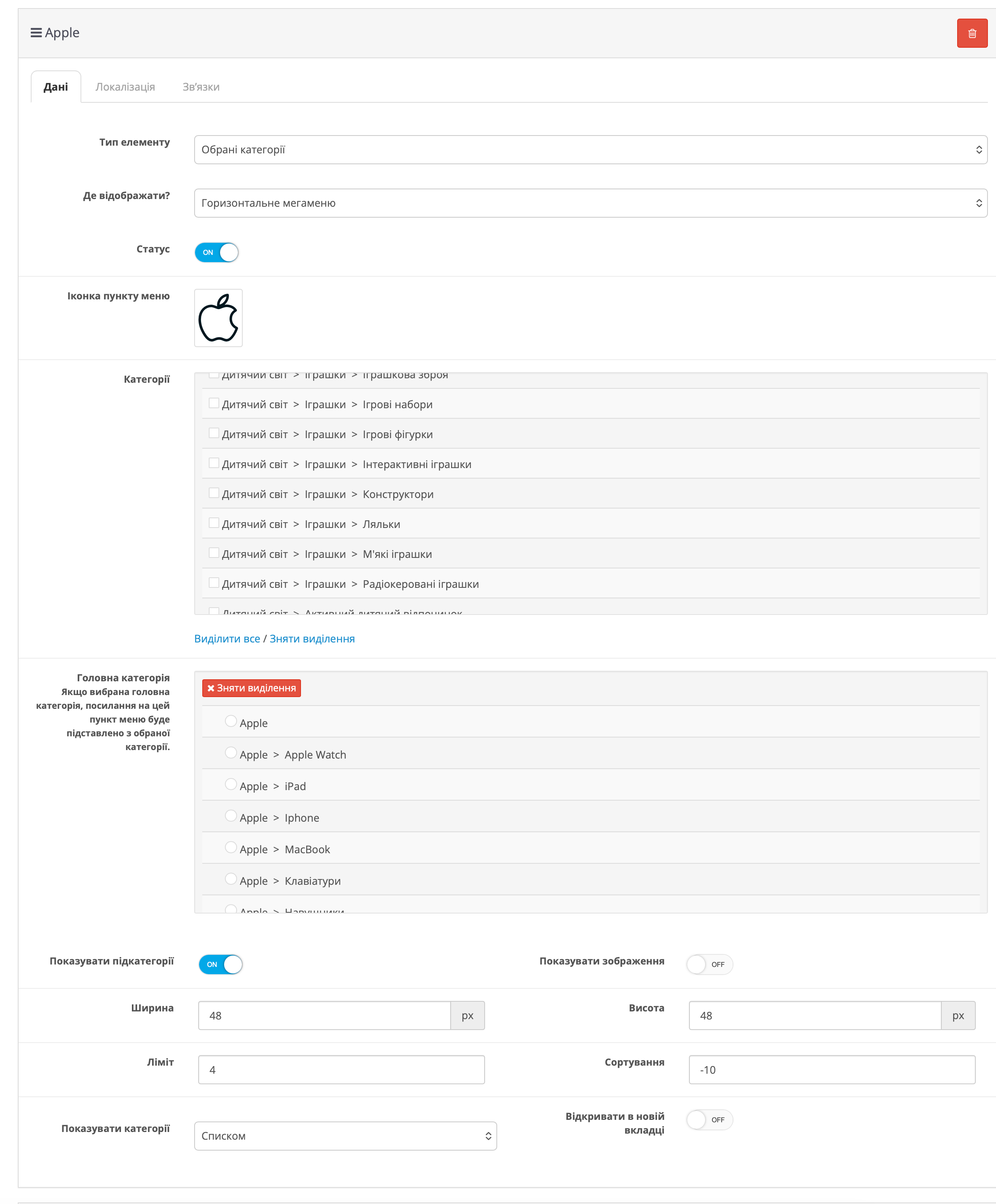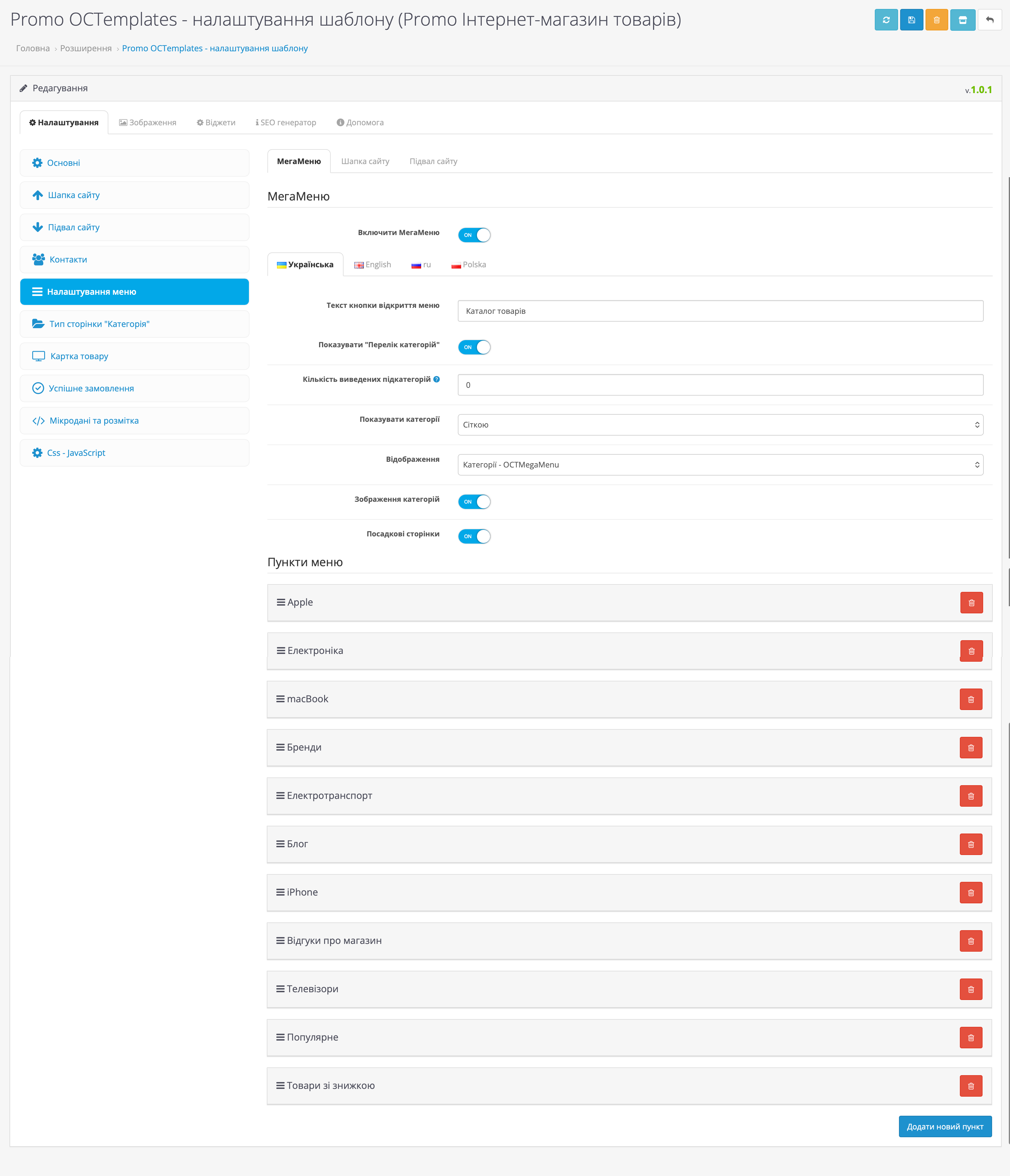 1.5.1. Вкладка "МегаМеню" містить наступні настройки: