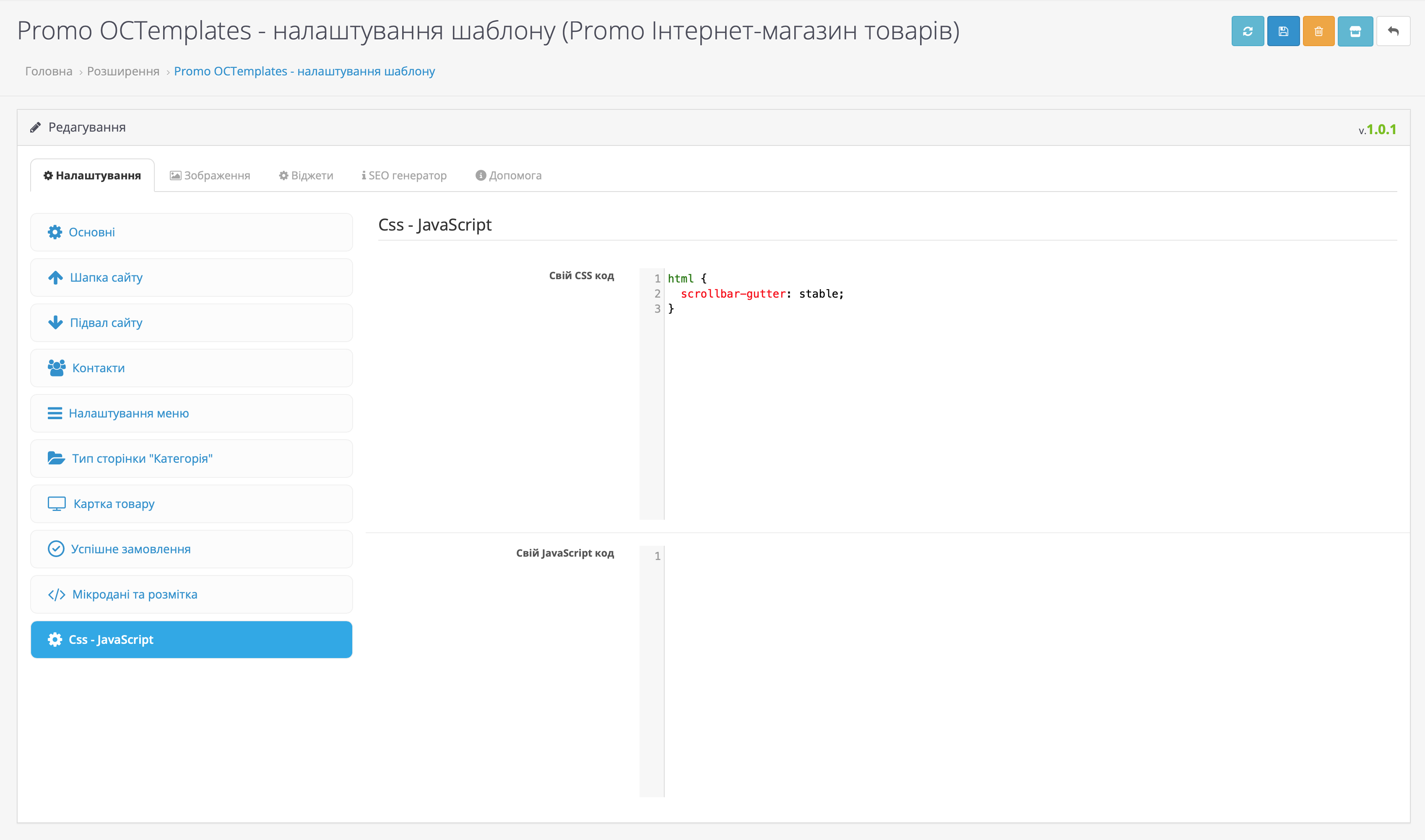 1.10. У вкладці "CSS - Javascript" ви зможете дописувати свої CSS стилі та вставляти код JavaScript скриптів у шаблон.