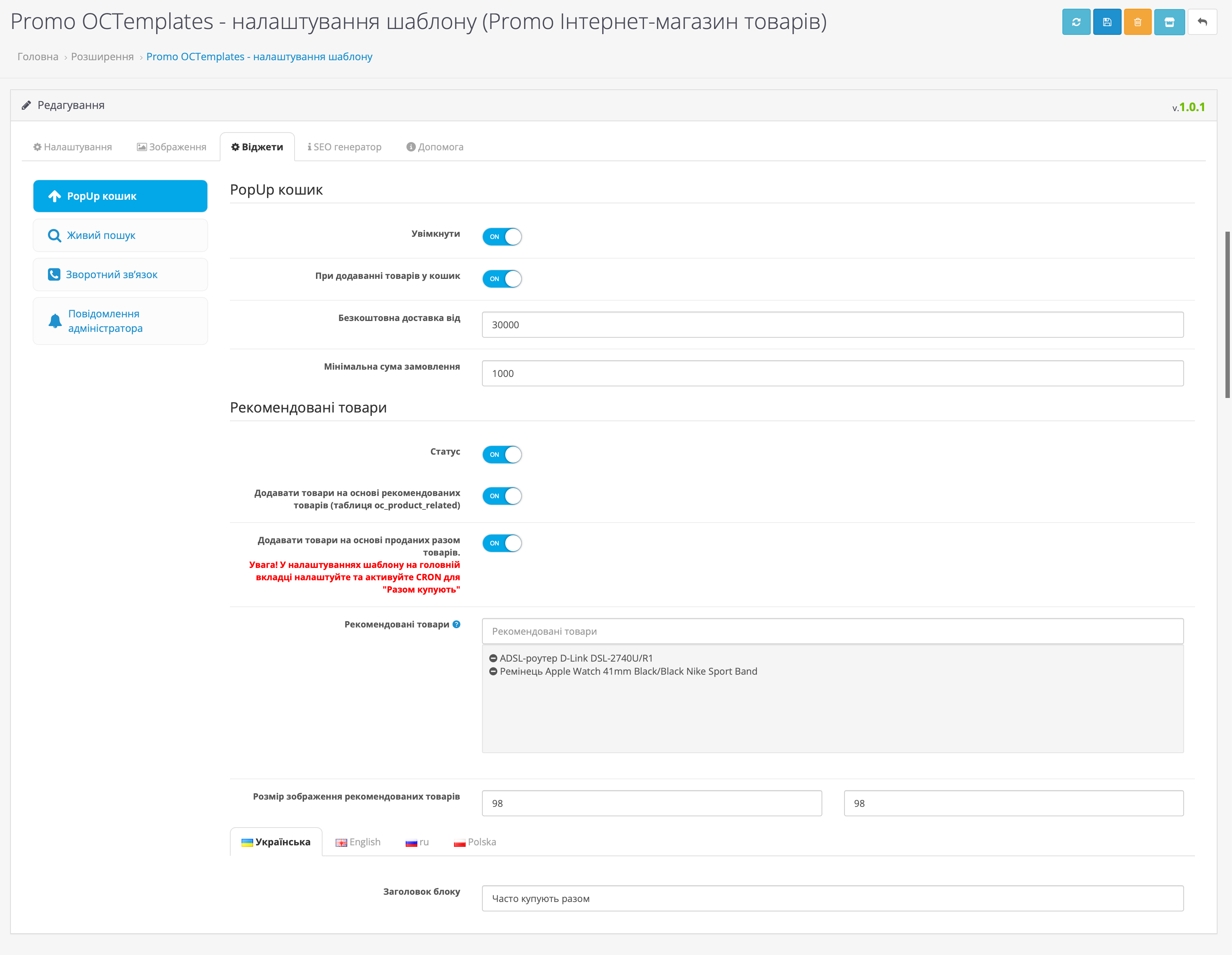 - "Додавати товари на основі продажних разом товарів" дозволяє показувати товари, що часто купуються разом (вимагає активного CRON для "Разом купують");