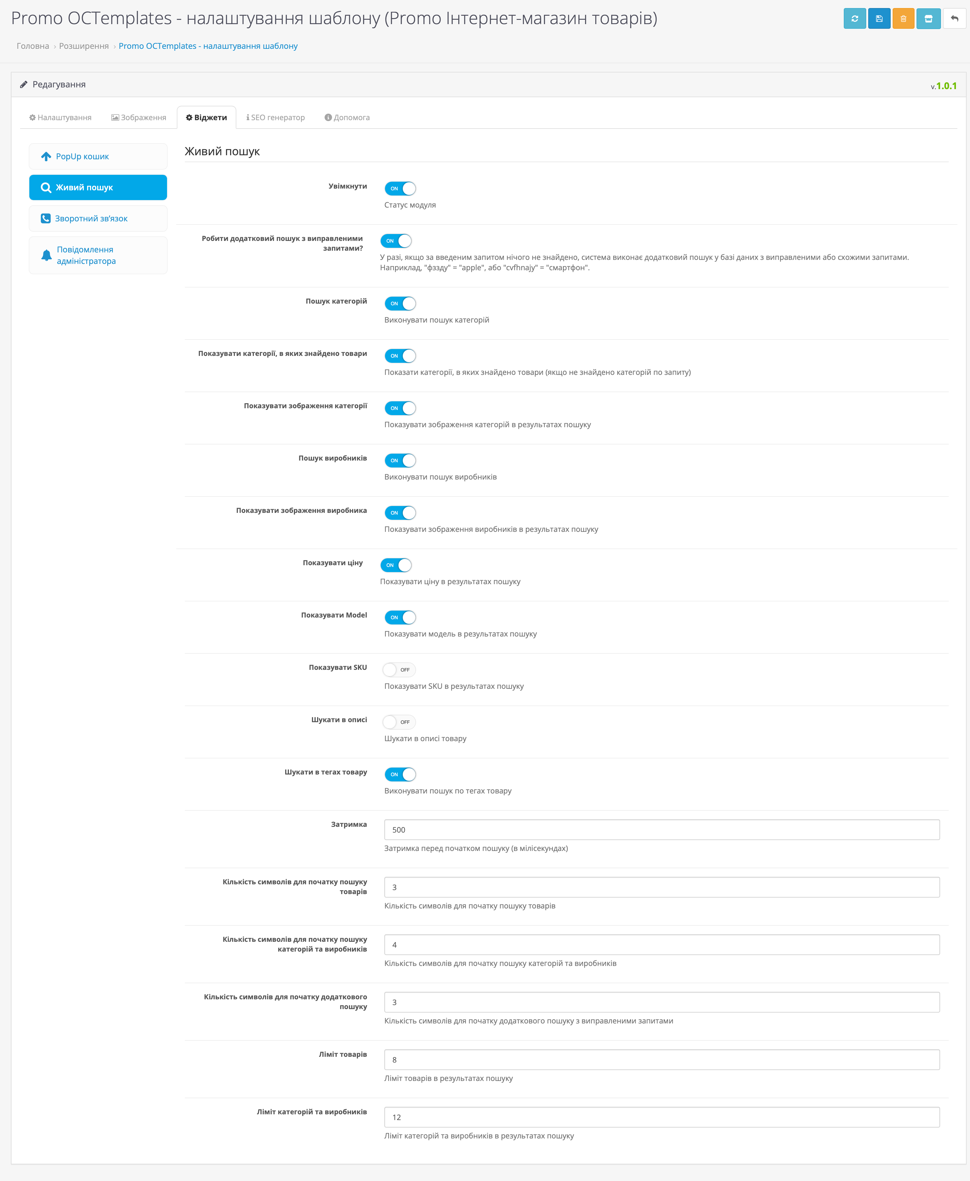 - "Шукати в тегах товару" дозволяє включити пошук по тегах товарів у результатах живого пошуку;