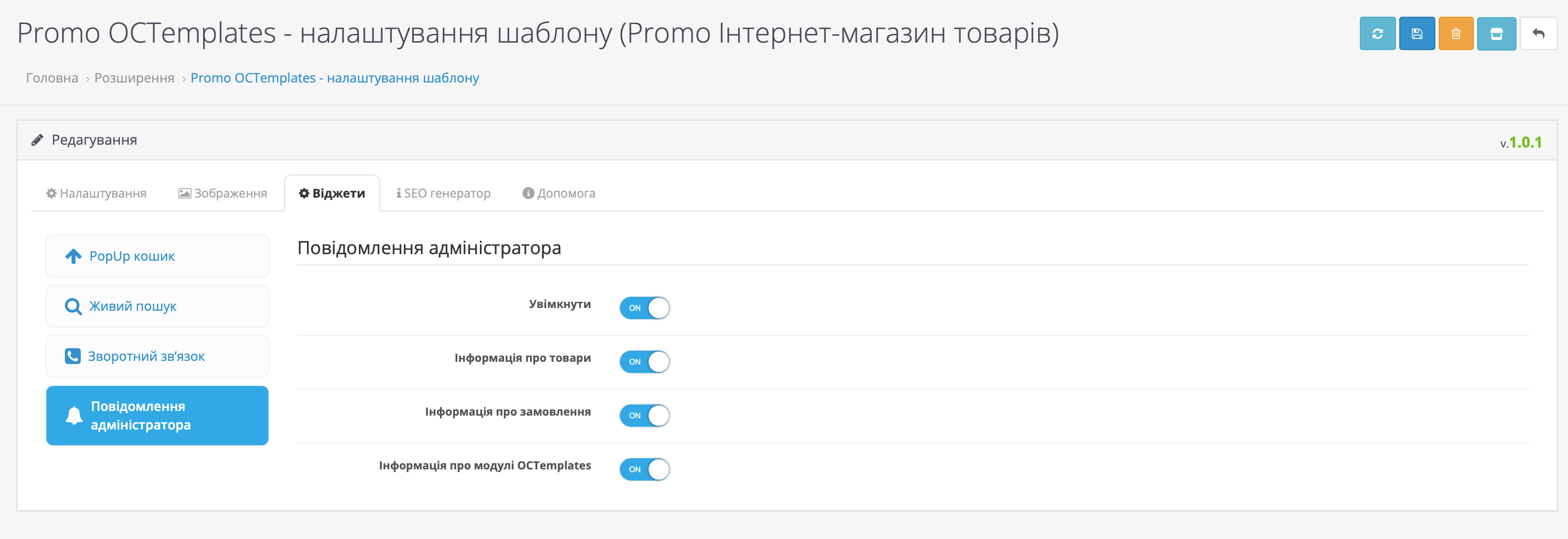 - "Інформація про модулі OCTemplates" дозволяє включити\вимкнути відображення інформації про нові заявки в модулях "Зворотний дзвінок", "Знайшли дешевше" а також нових відгуків, які очікують модерації в модулі "Відгуки про магазин".