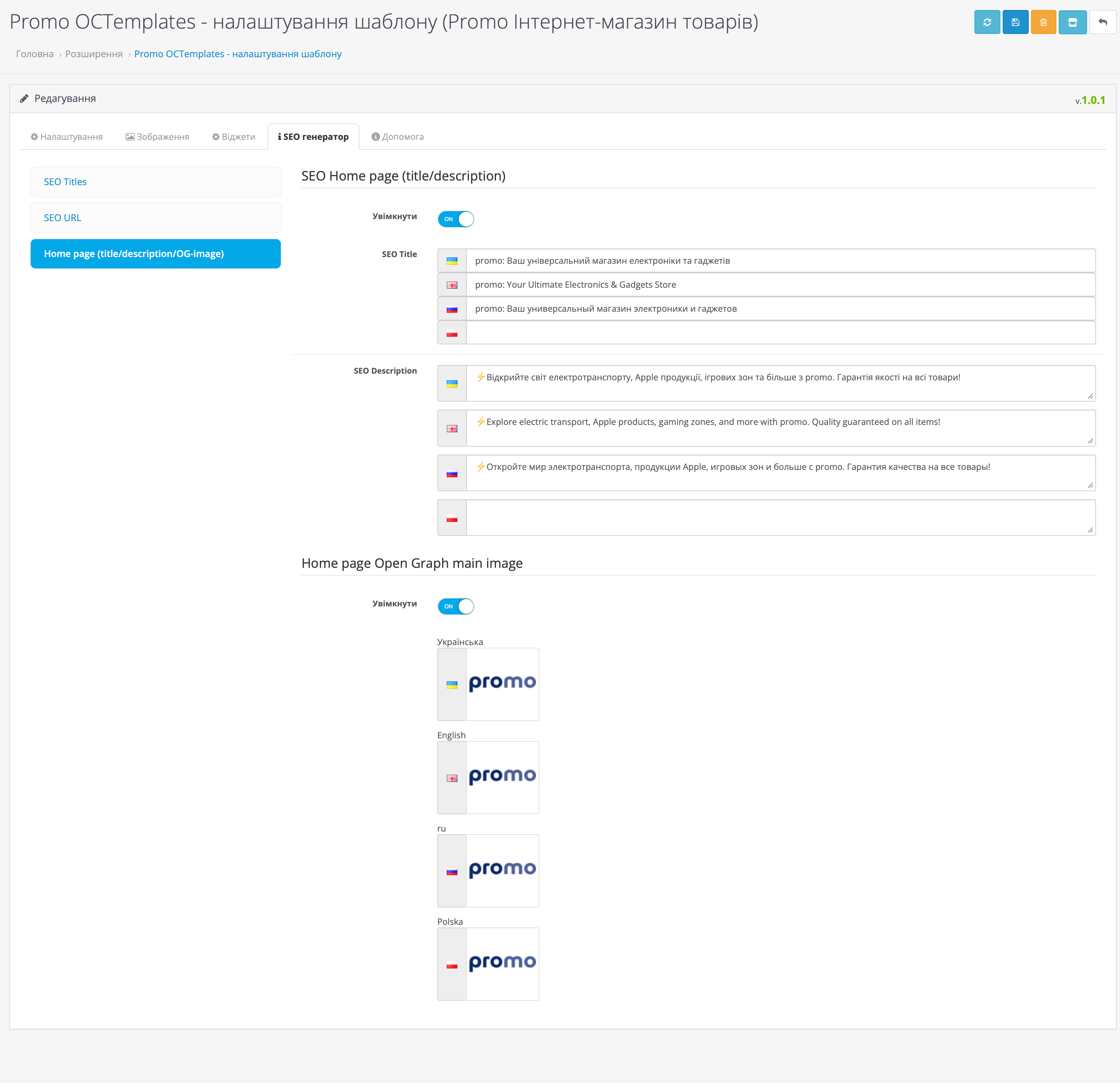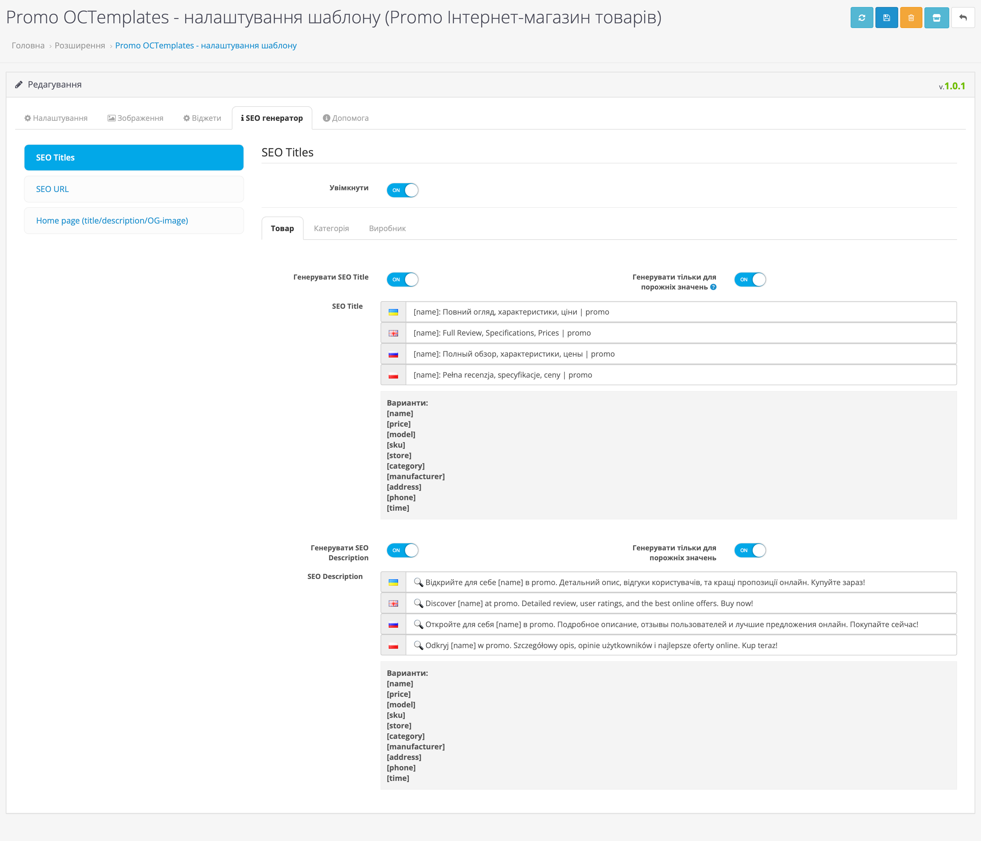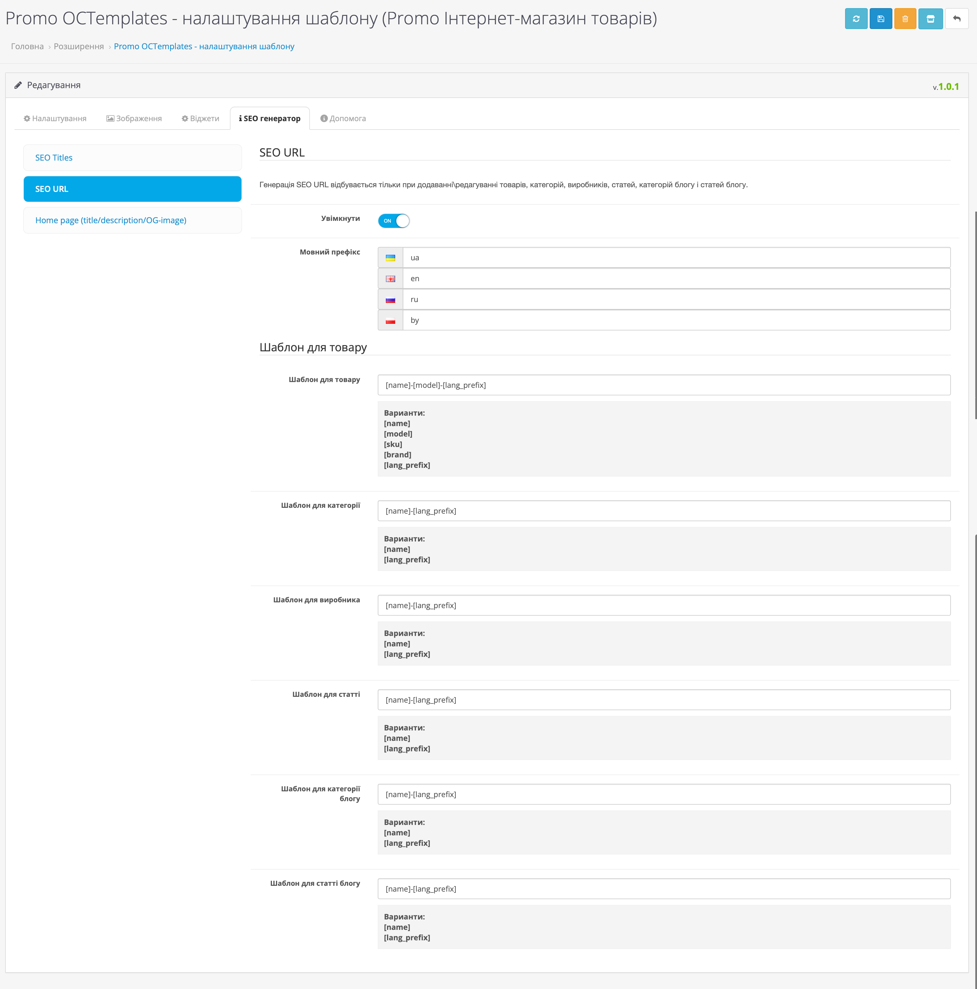 4. У вкладці "SEO генератор" ви зможете налаштувати правильні SEO-дані, а також встановити шаблон для автоматичної генерації SEO URL.