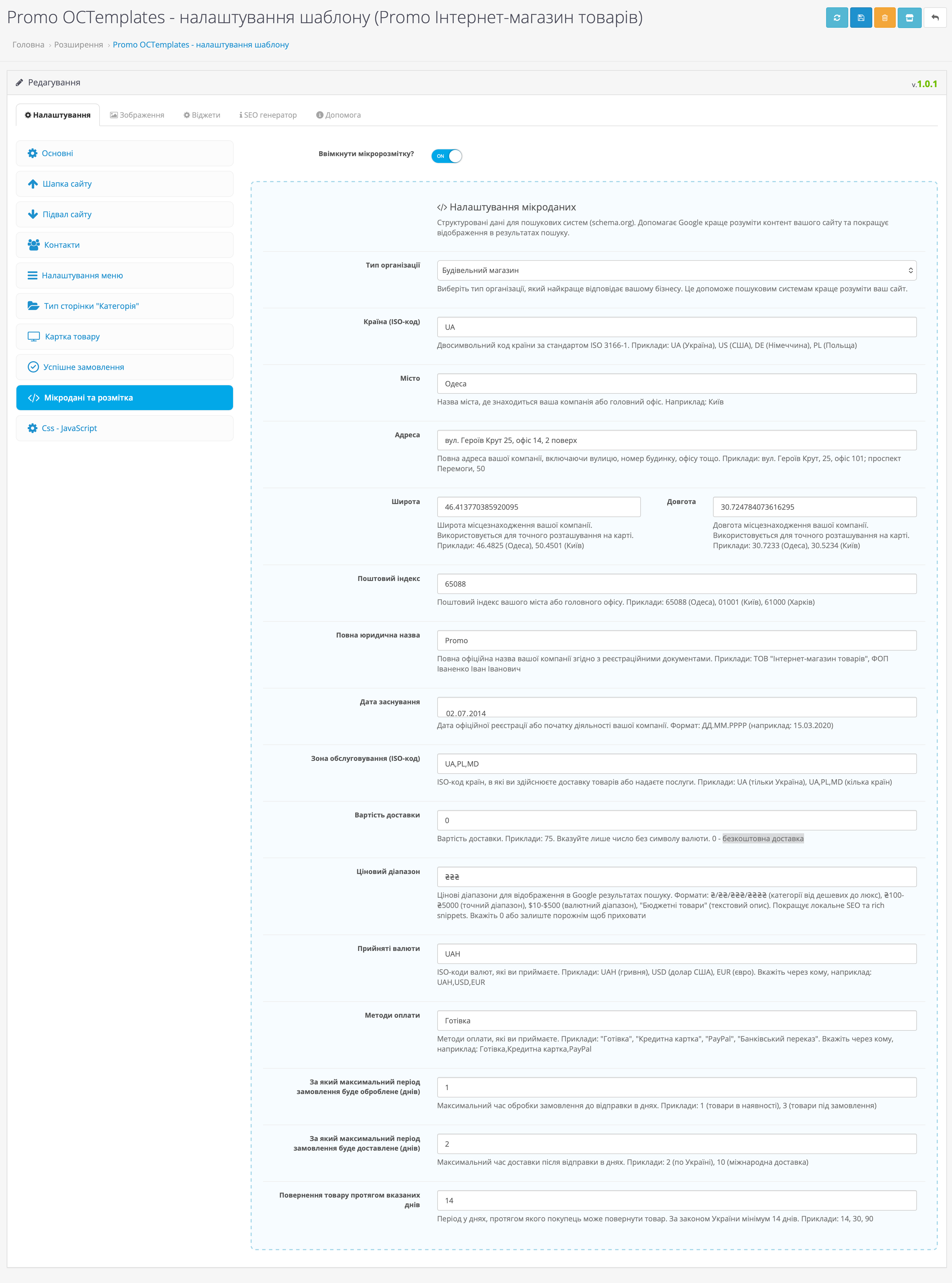 1.9. У вкладці "Мікродані та розмітка" ви зможете налаштувати структуровані дані вашого сайту за стандартом schema.org.