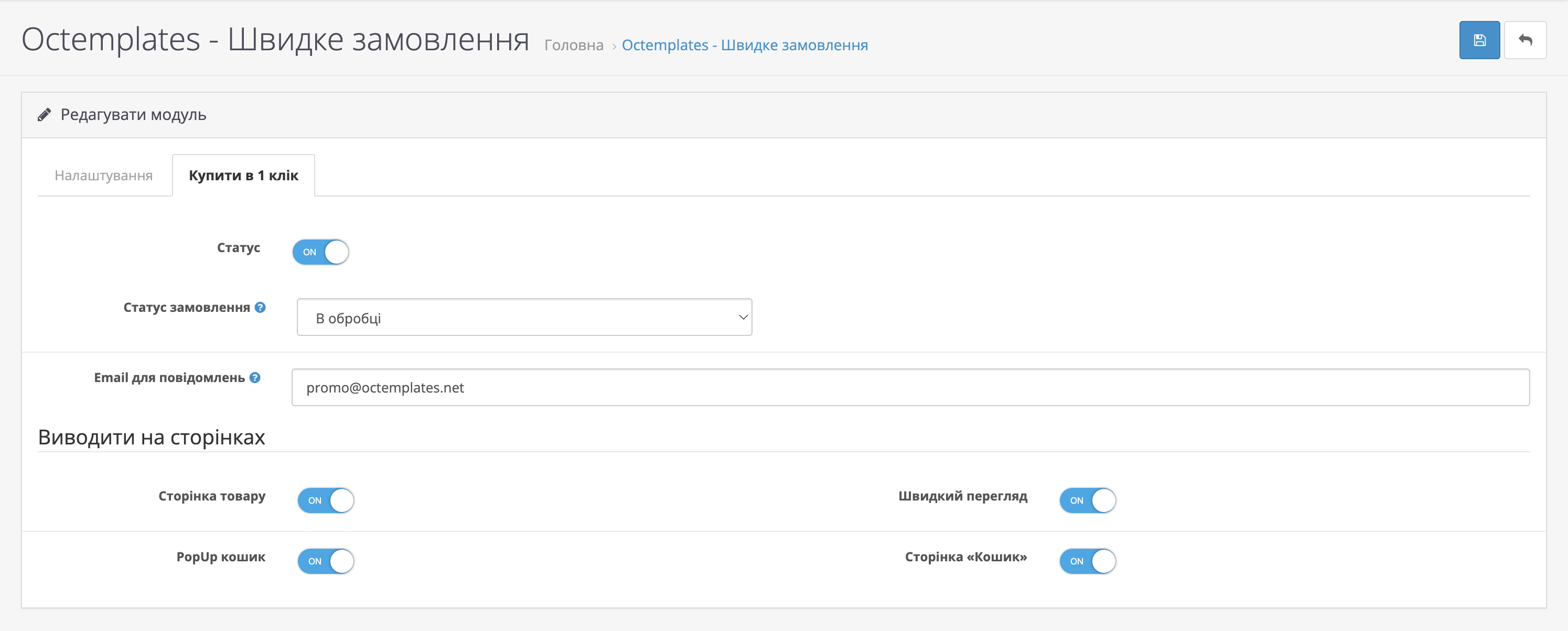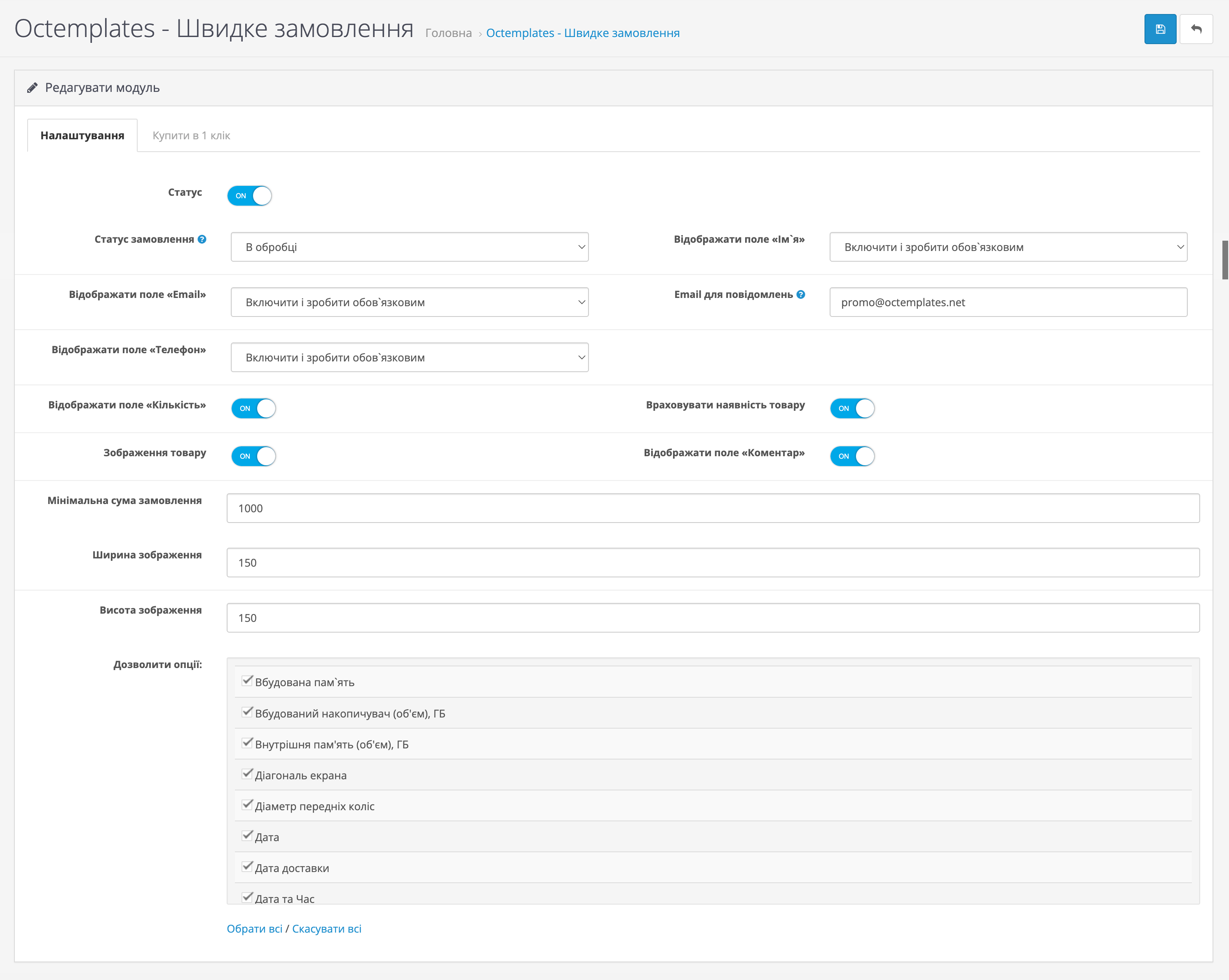У вкладці "Купити в 1 клік" модуля вам будуть доступні такі опції: