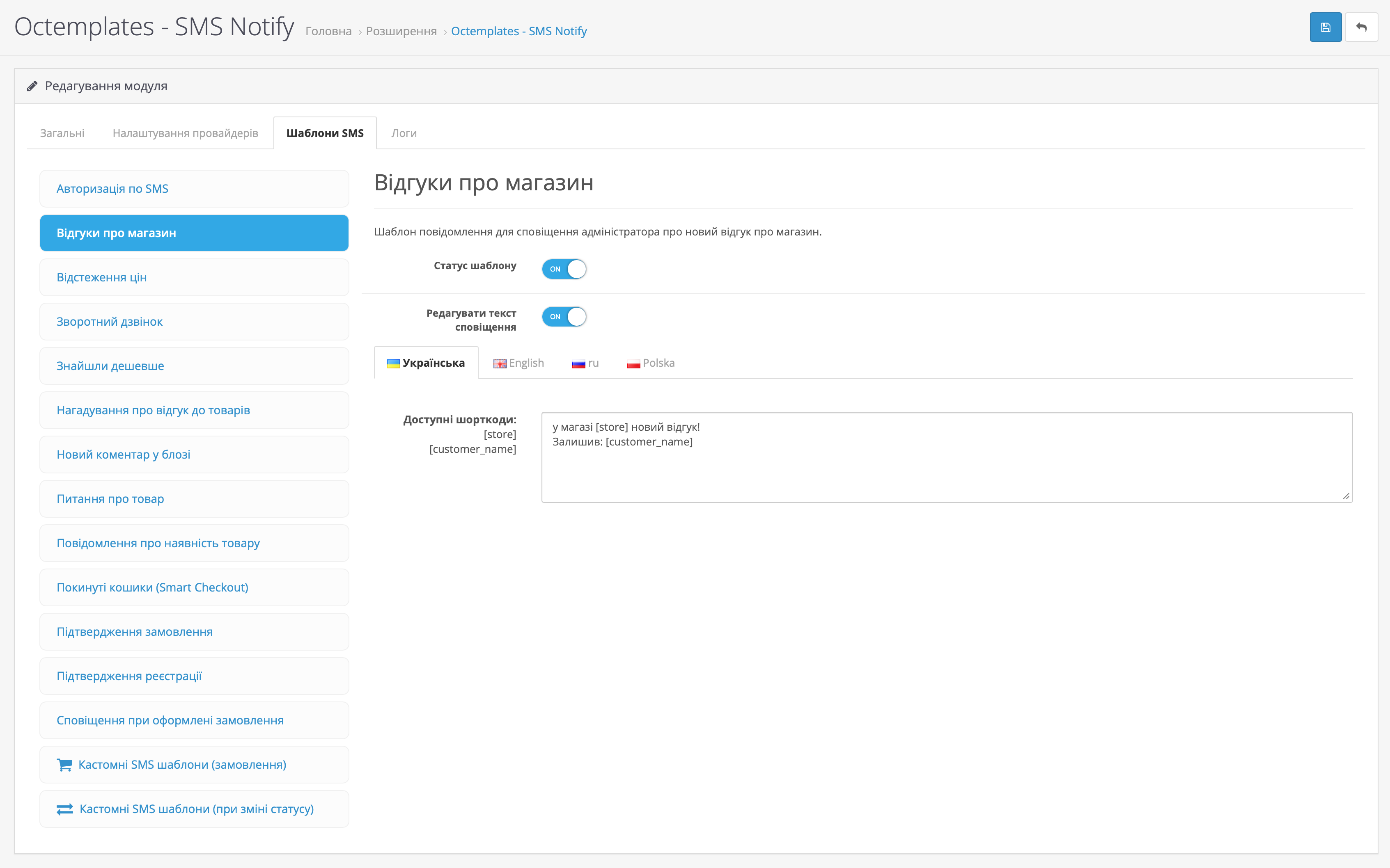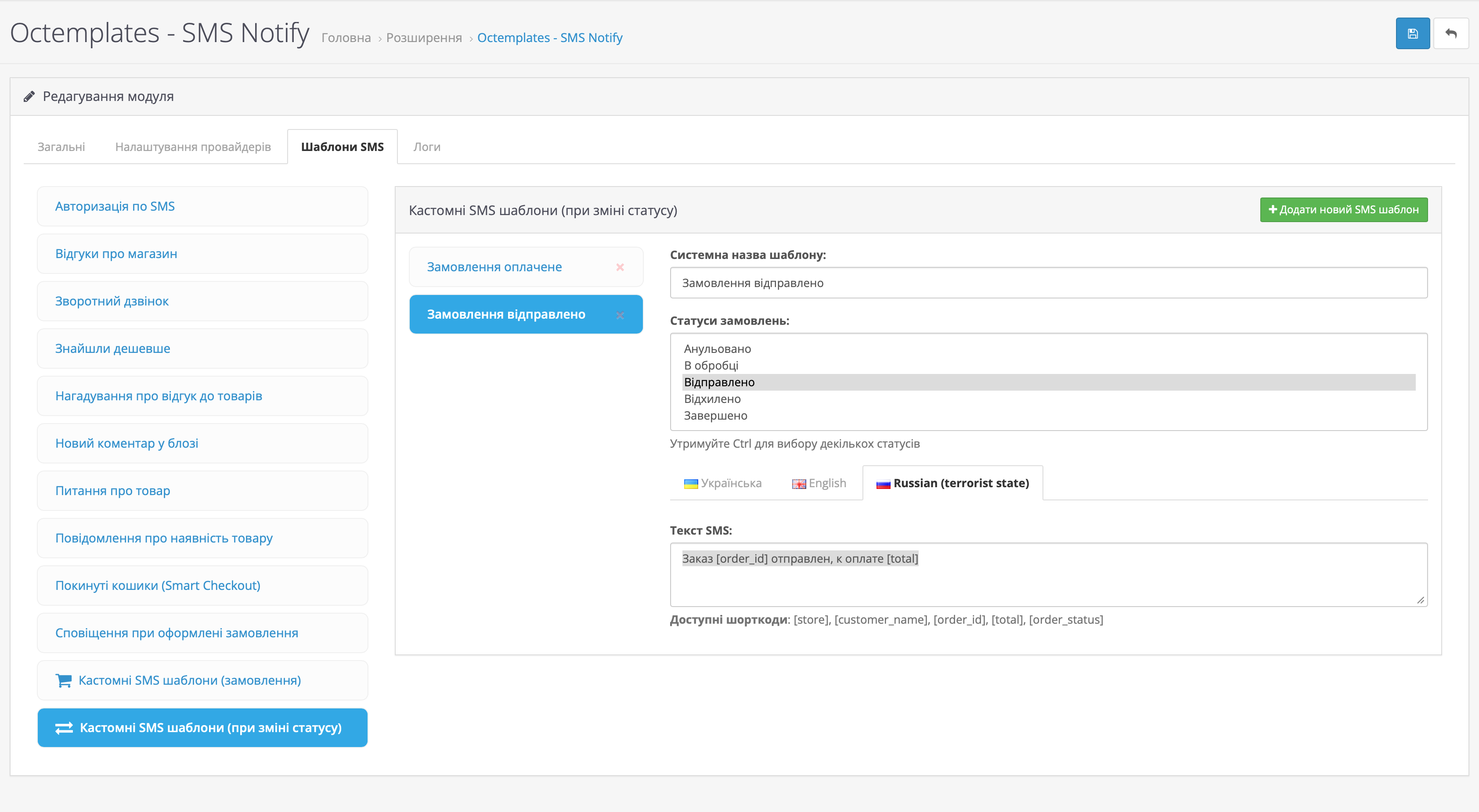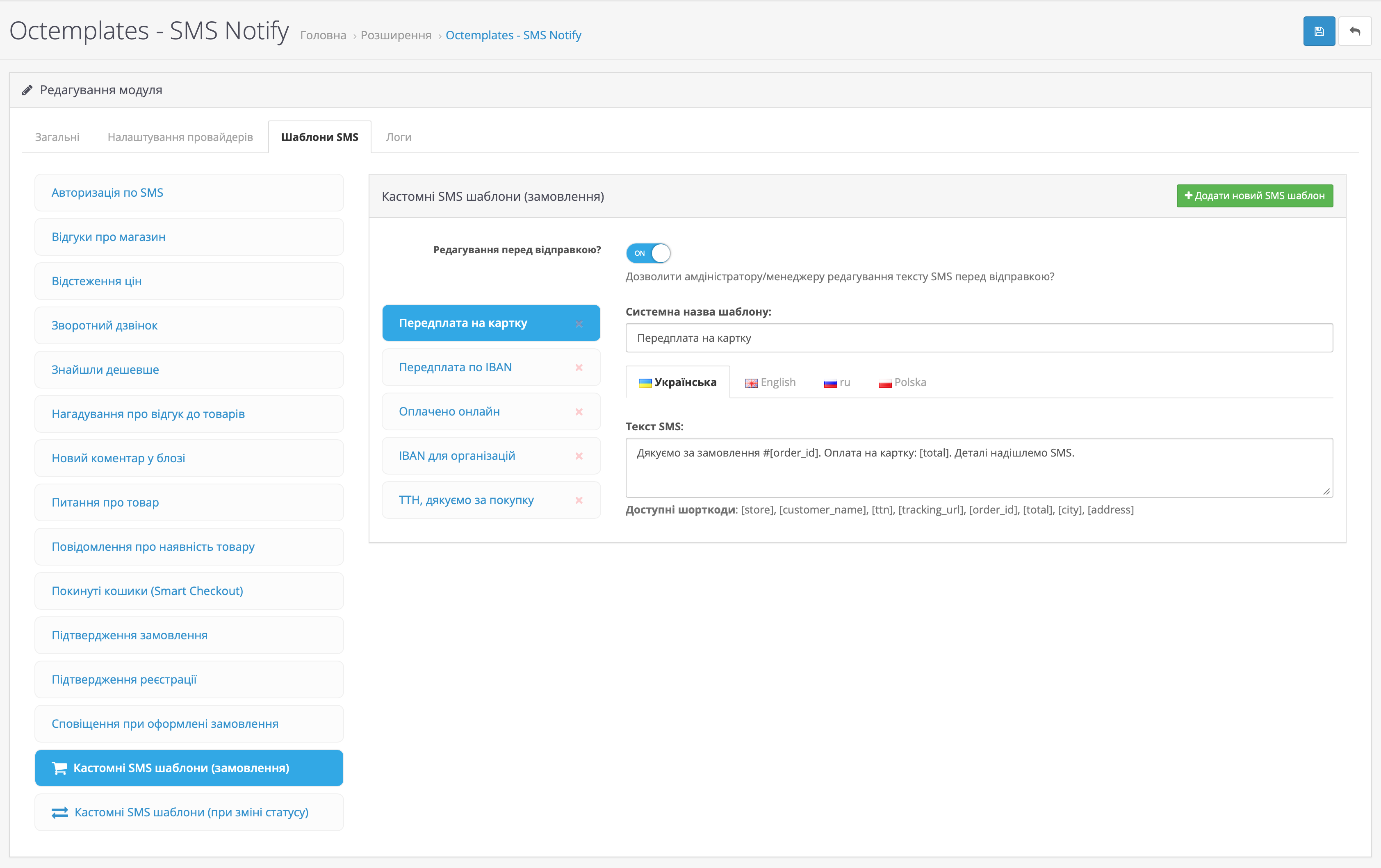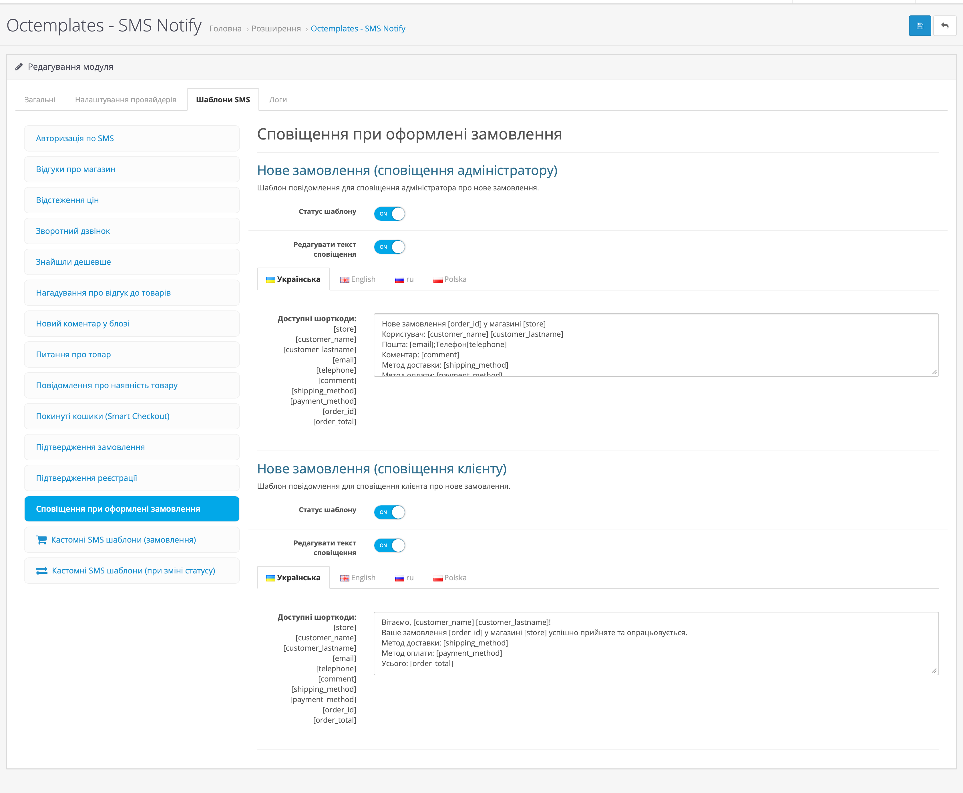 На вкладці Шаблони SMS можна налаштувати шаблони повідомлень для різних подій магазину та модулів OCTemplates.