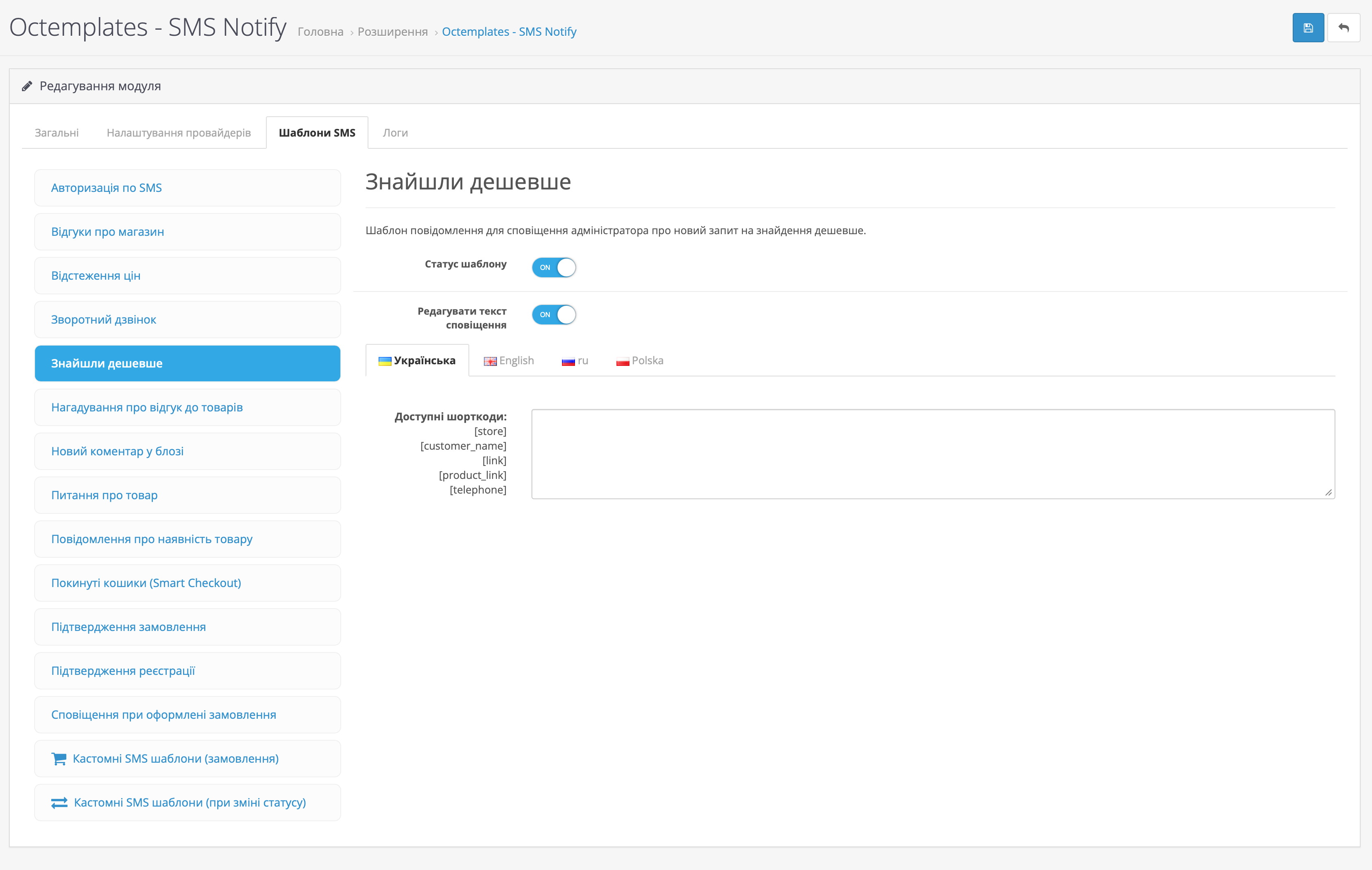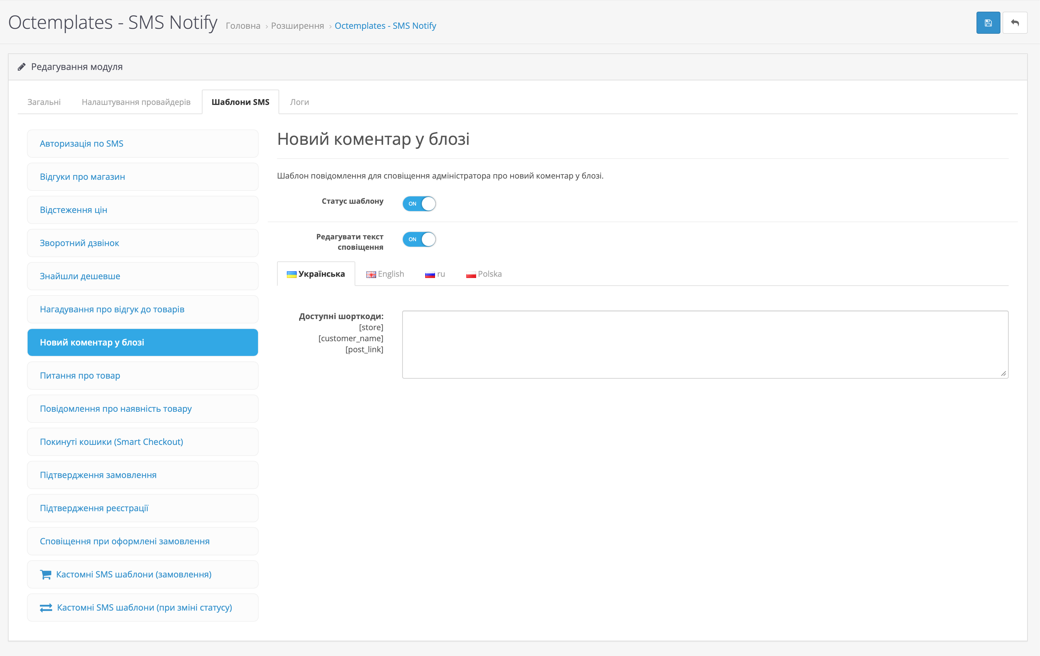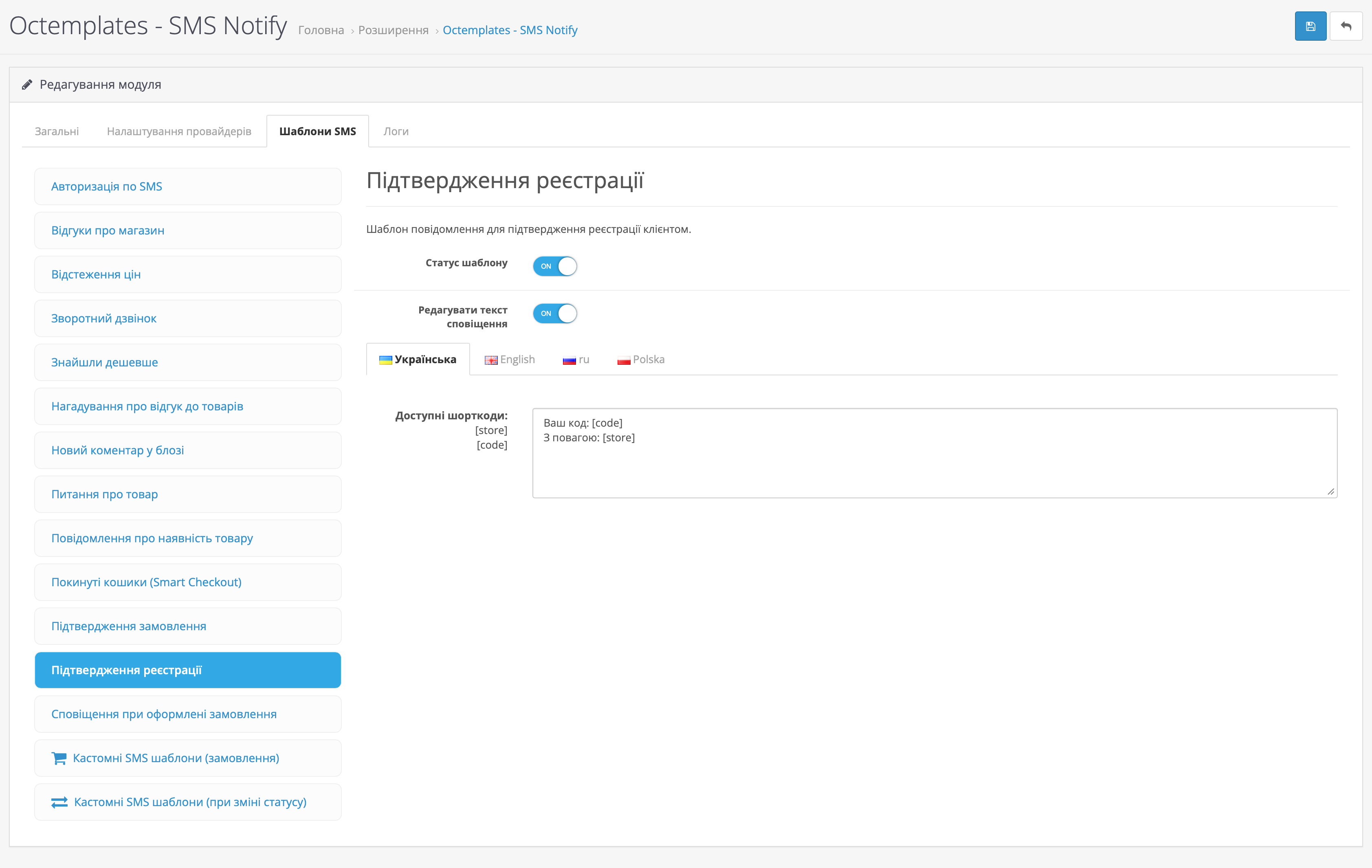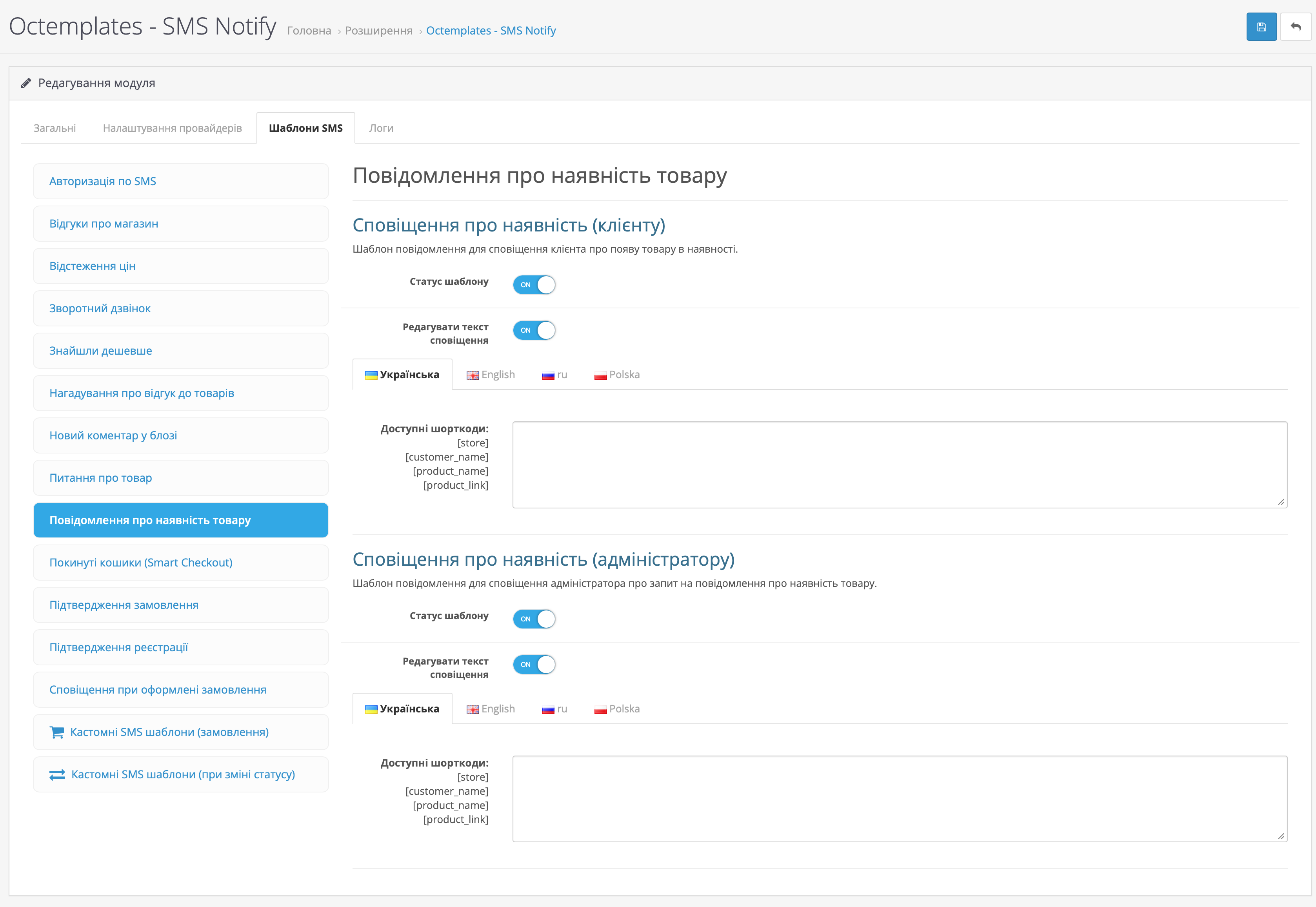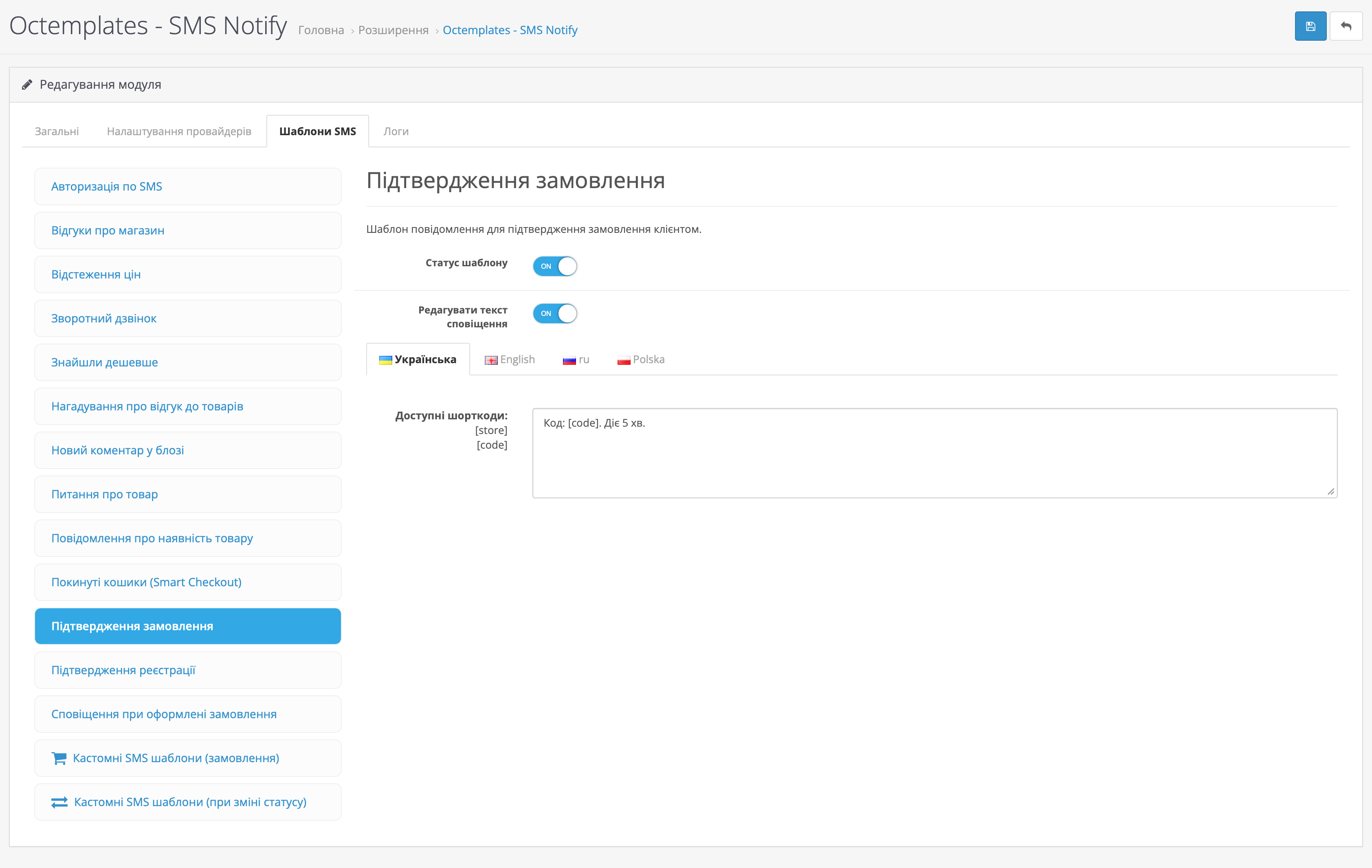 На вкладці Шаблони SMS можна налаштувати шаблони повідомлень для різних подій магазину та модулів OCTemplates.
