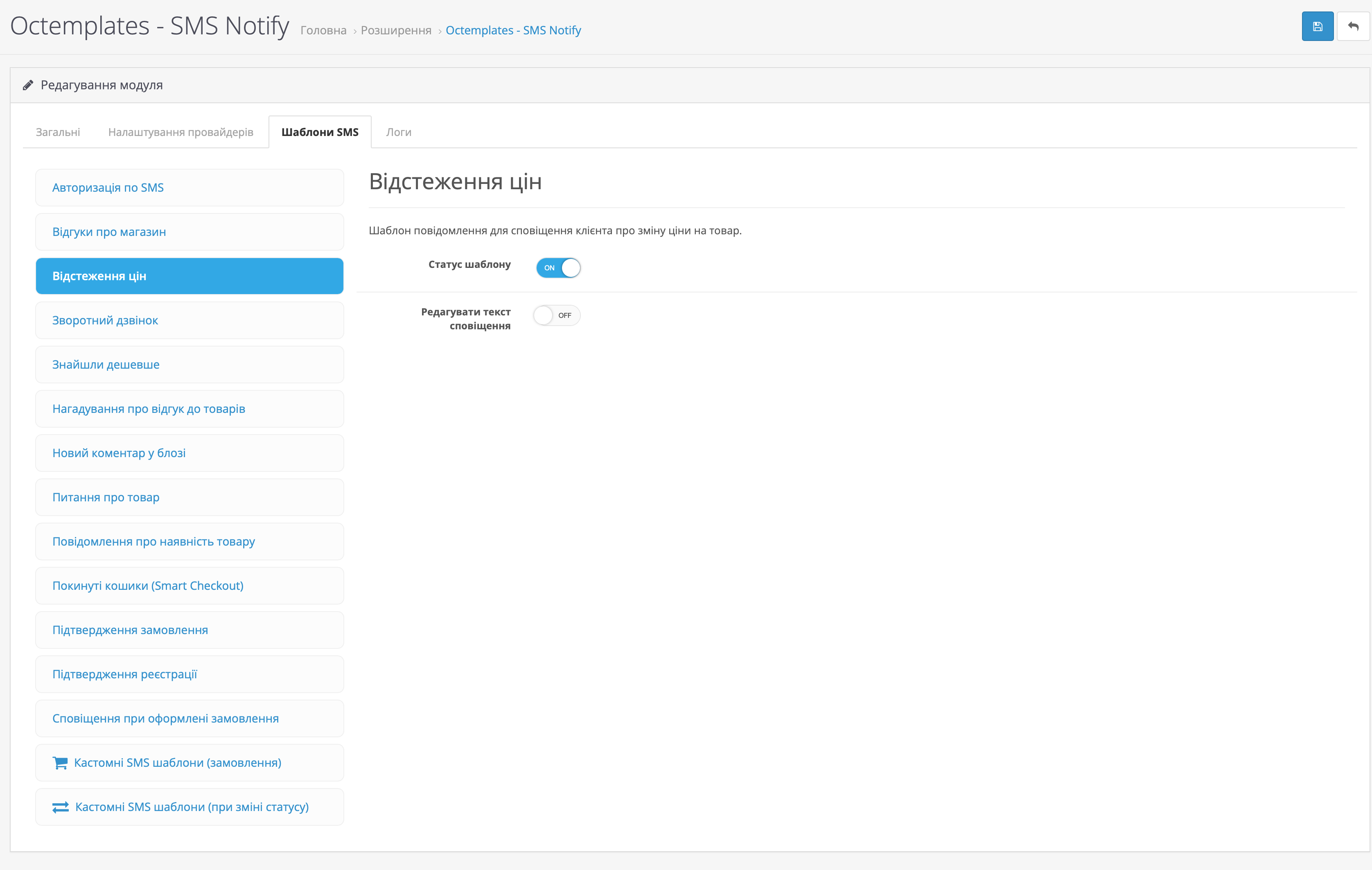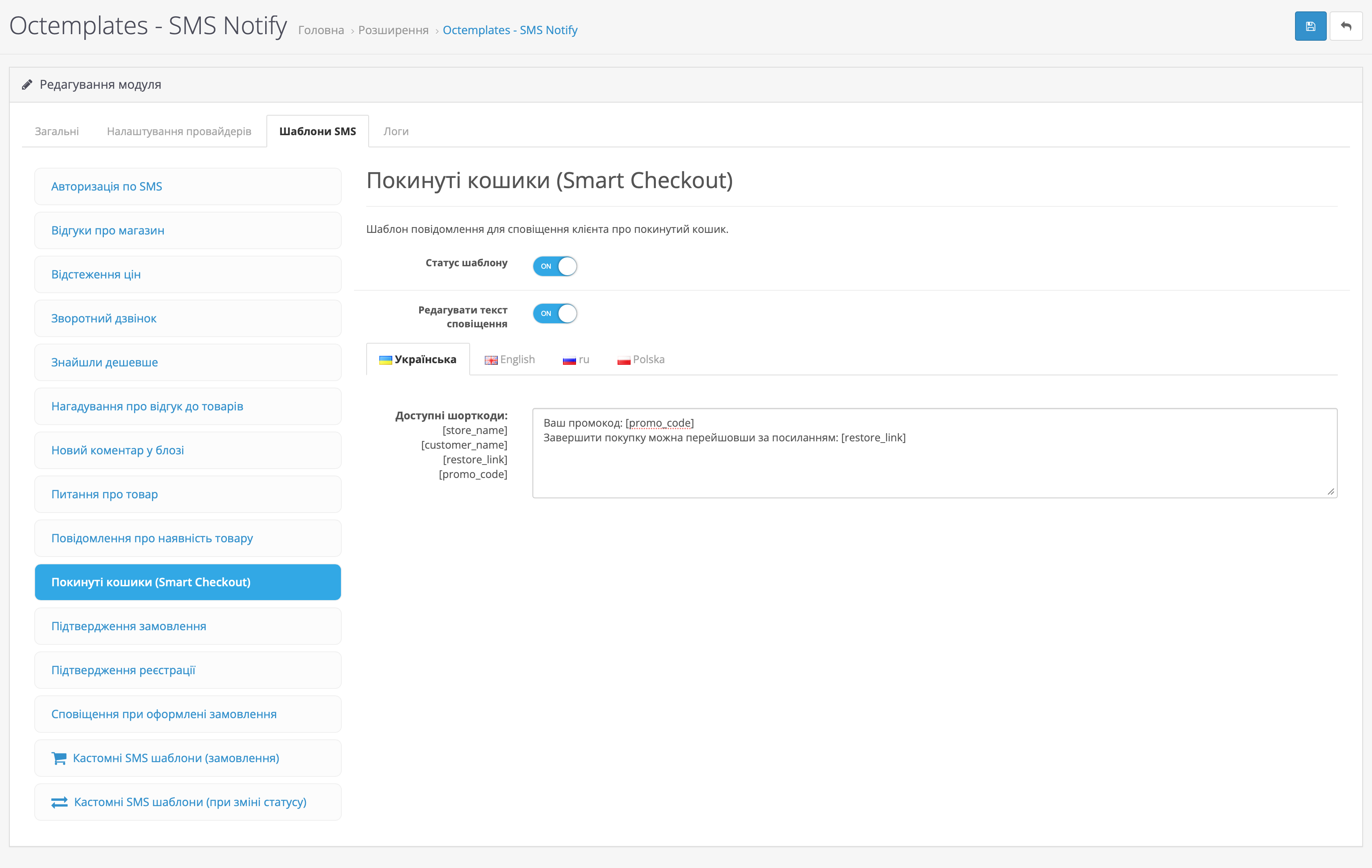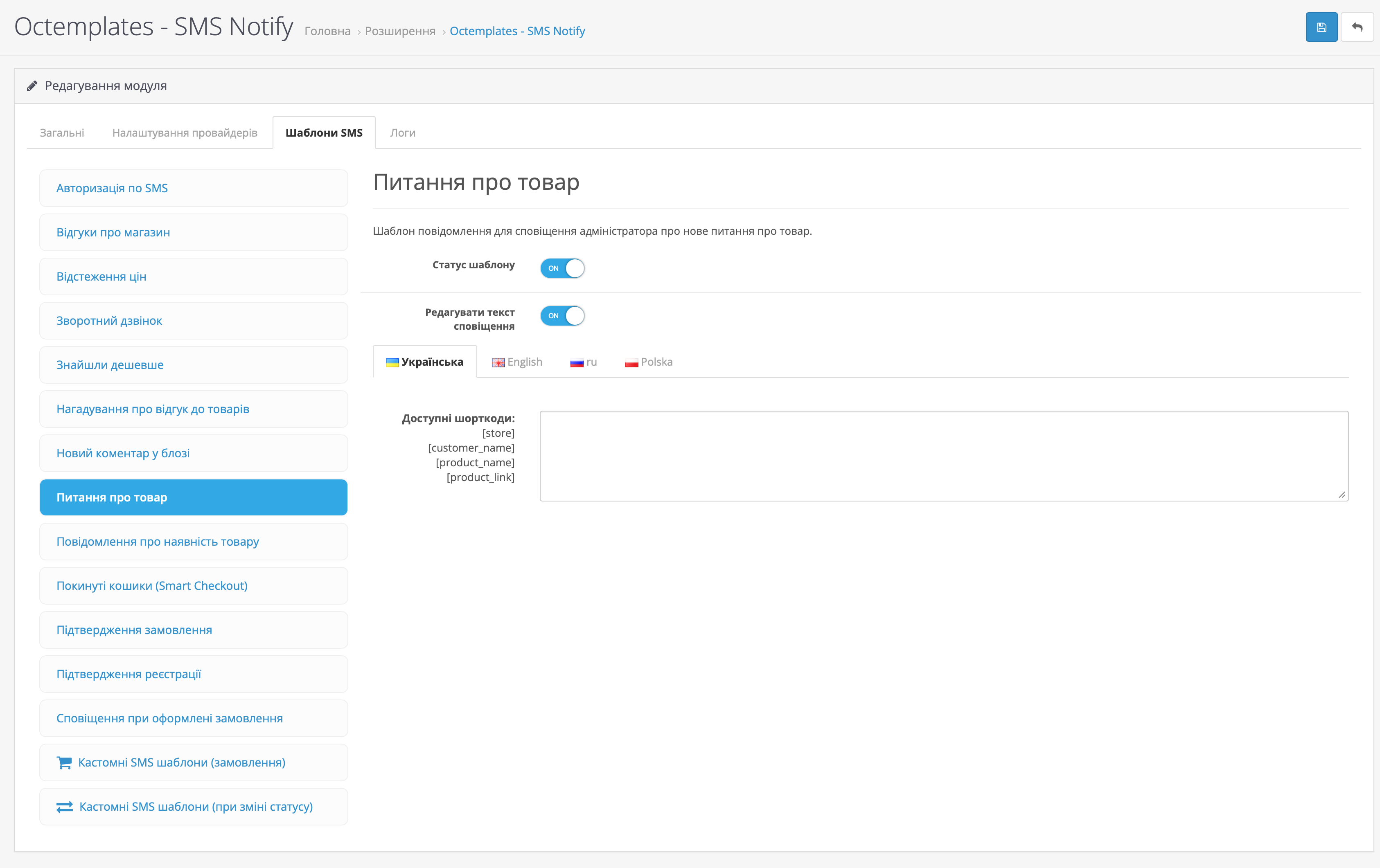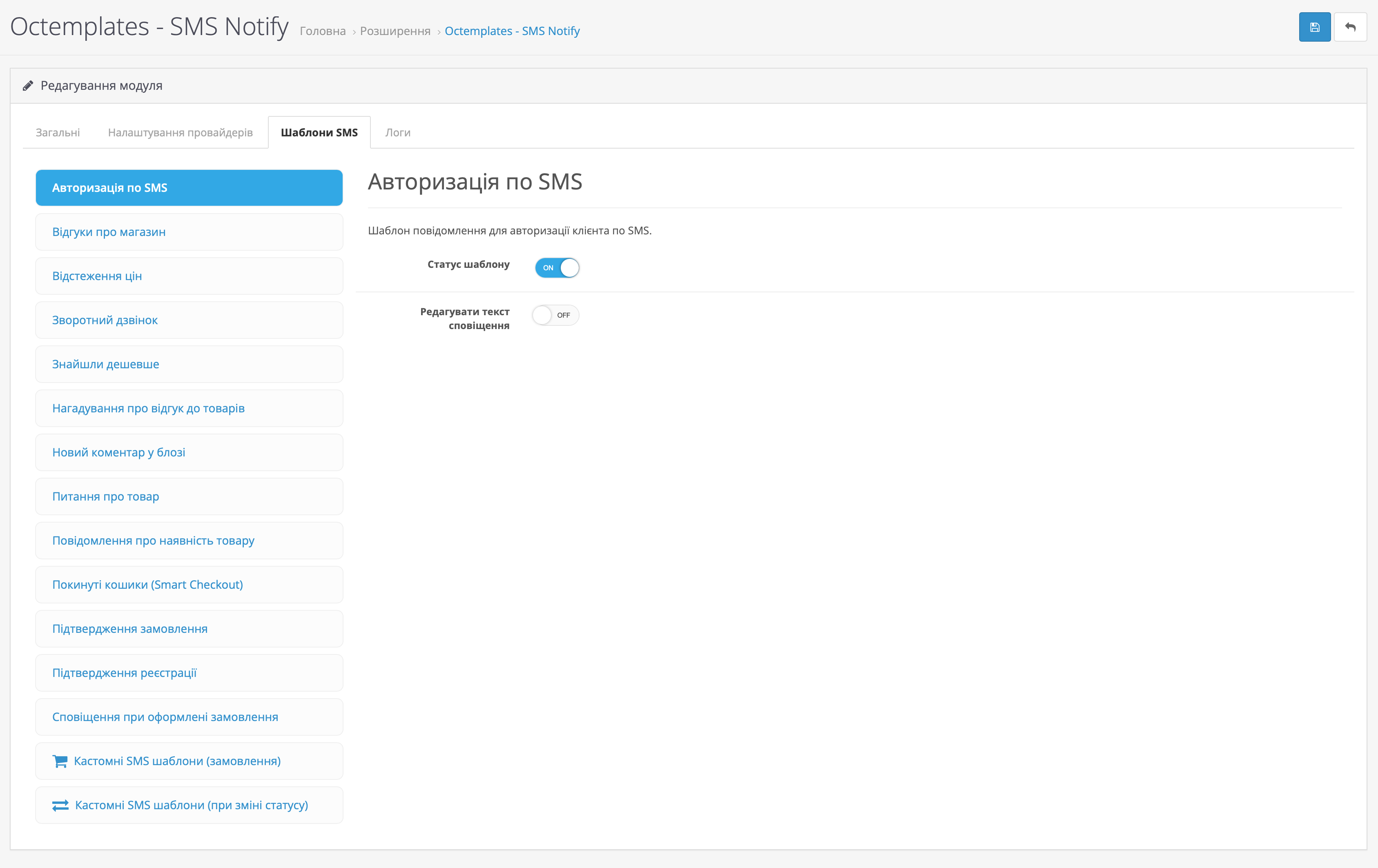 На вкладці Шаблони SMS можна налаштувати шаблони повідомлень для різних подій магазину та модулів OCTemplates.
