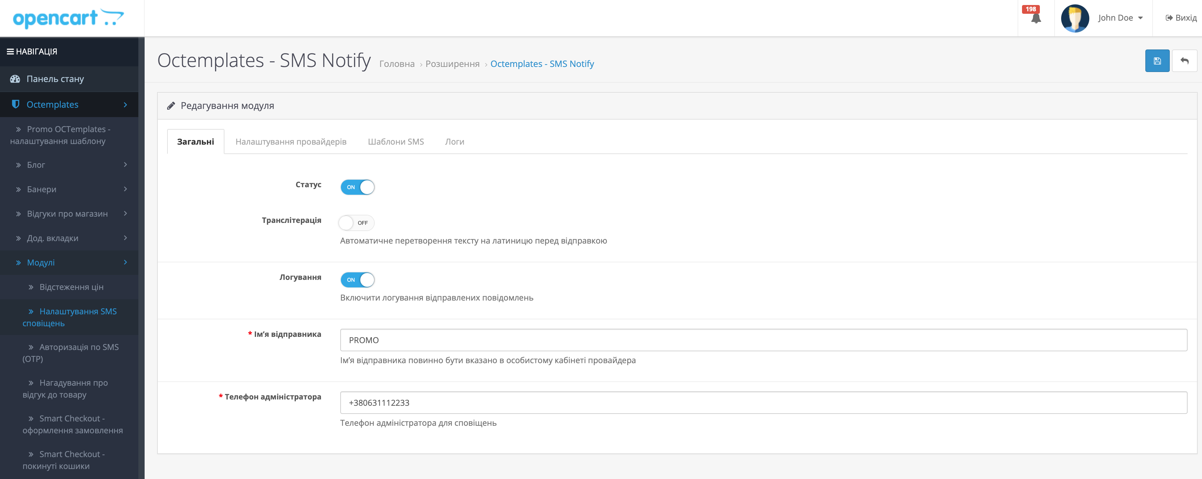 В налаштуваннях модуля достпно 4 вкладки: "Загальні", "Налаштування провайдерів", "Шаблони SMS" та "Логи".