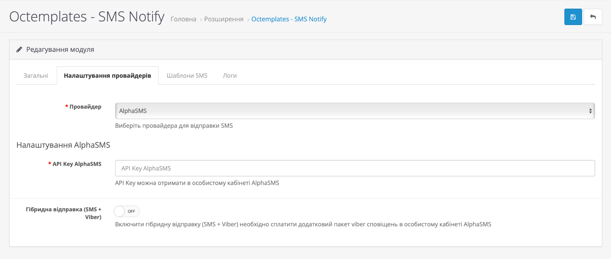 Все, що потрібно для роботи модуля - зберегти ключ API вашого SMS-провайдера, згенерований у відповідному особистому кабінети.