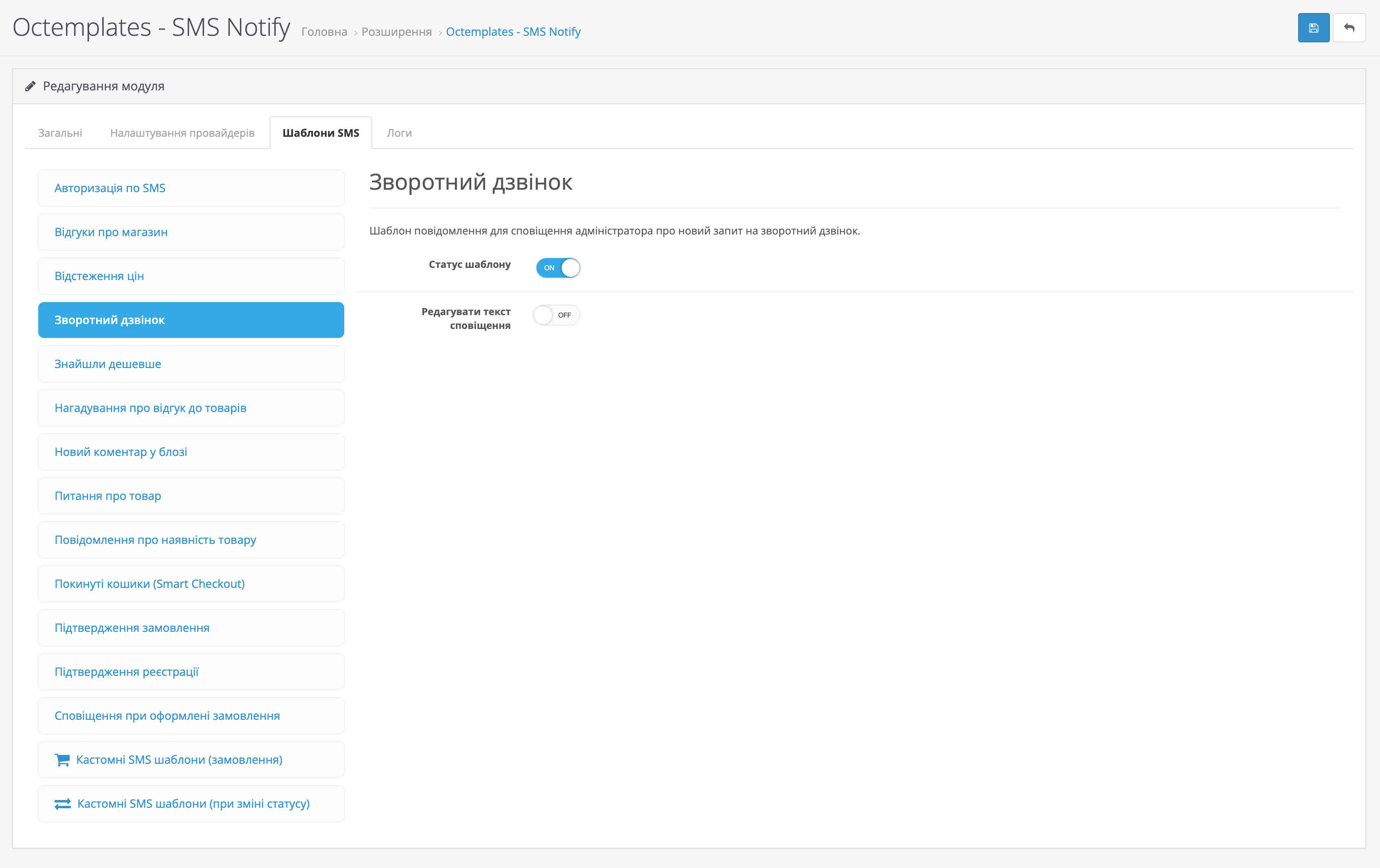 - OFF: шаблон неактивний, повідомлення про зворотний дзвінок не будуть надсилатися.