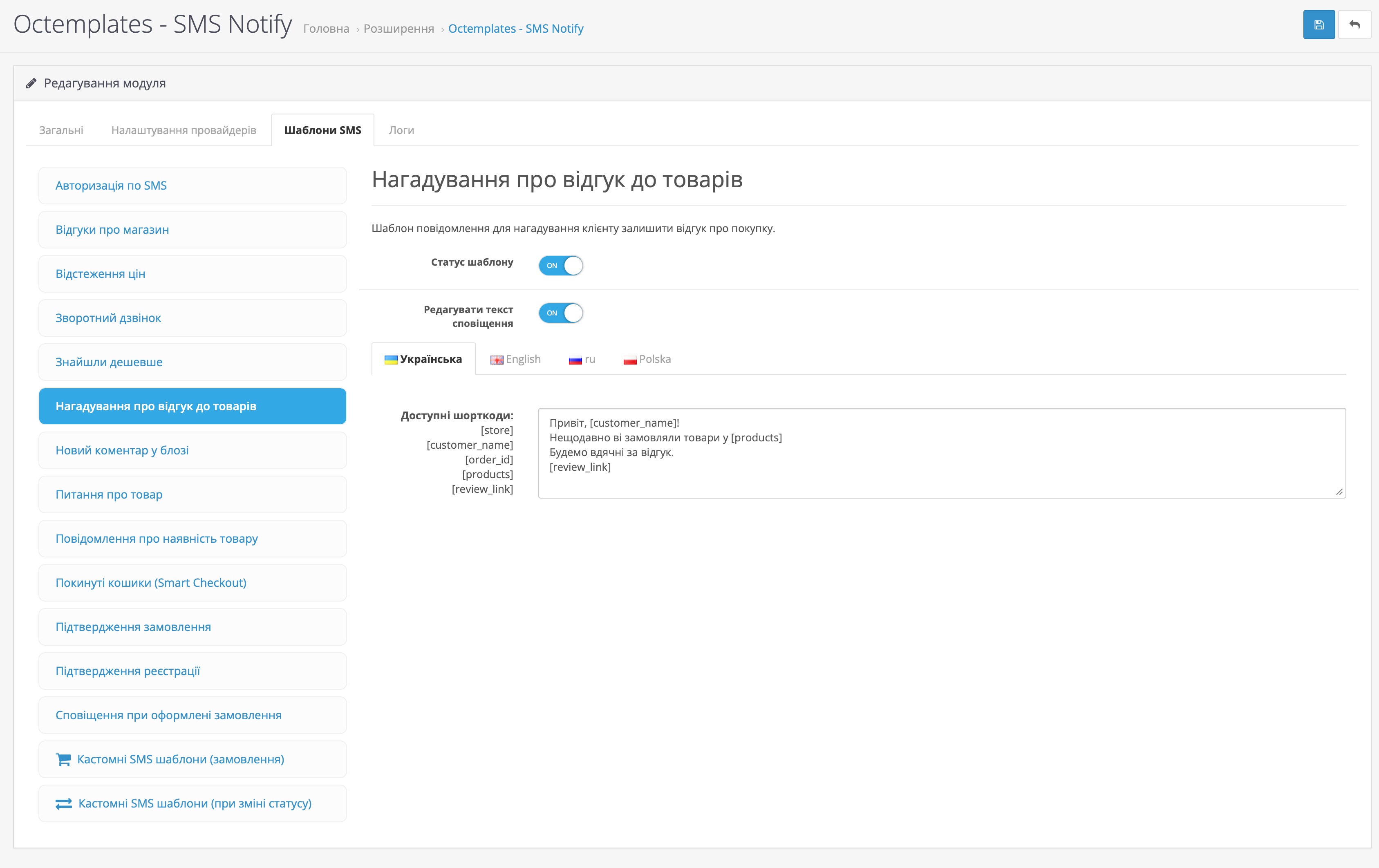 У вкладці "Нагадування про відгук до товарів" можна налаштувати автоматичне SMS-нагадування для клієнтів про залишення відгуку на куплені товари, з підтримкою різних мов та персоналізацією повідомлень за допомогою шорткодів.