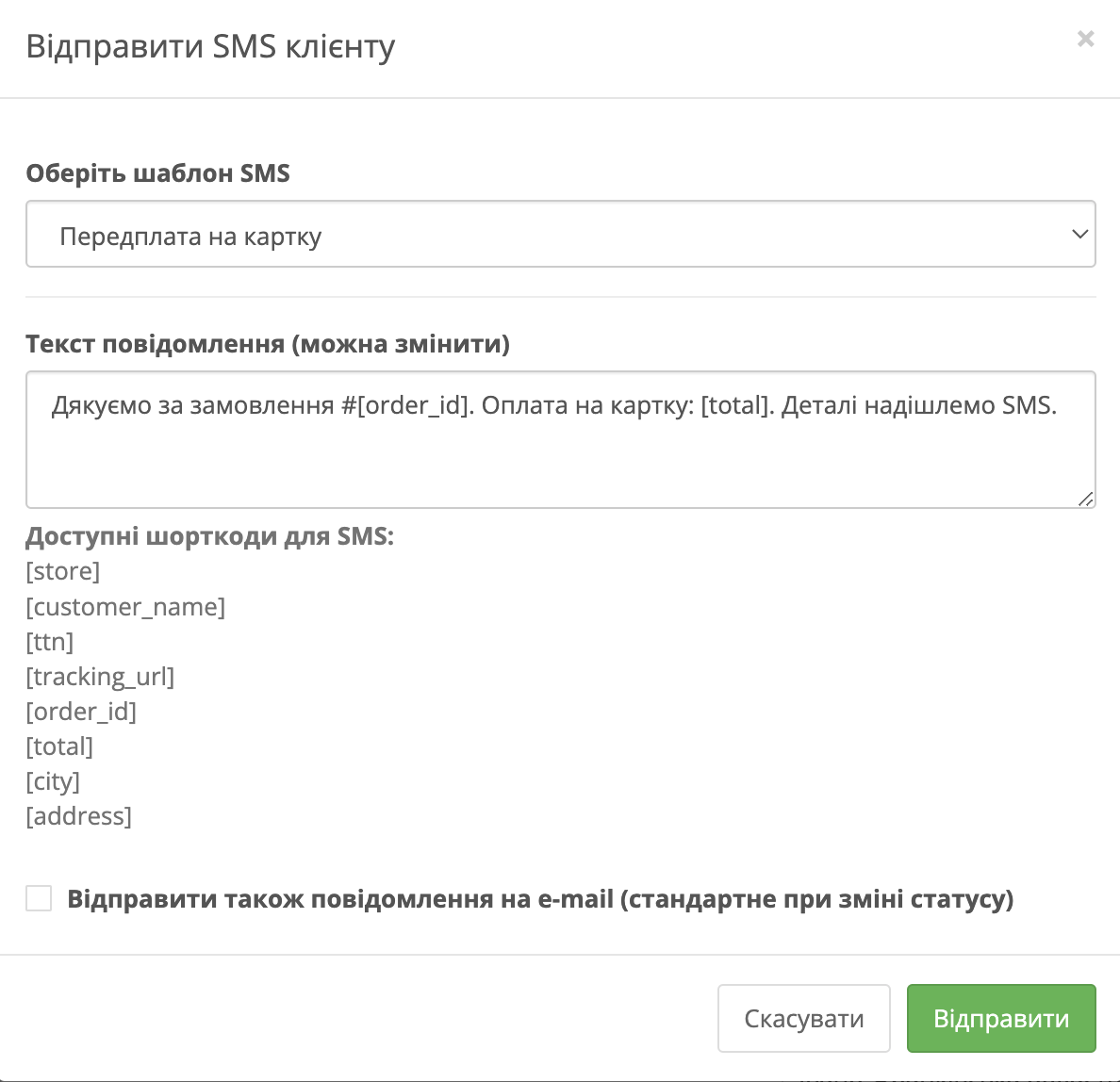 Відправити також повідомлення на e-mail – додатковий параметр. Якщо позначити цей чекбокс, клієнт отримає таке ж повідомлення ще й електронною поштою (таке саме, яке надсилається при зміні статусу замовлення).