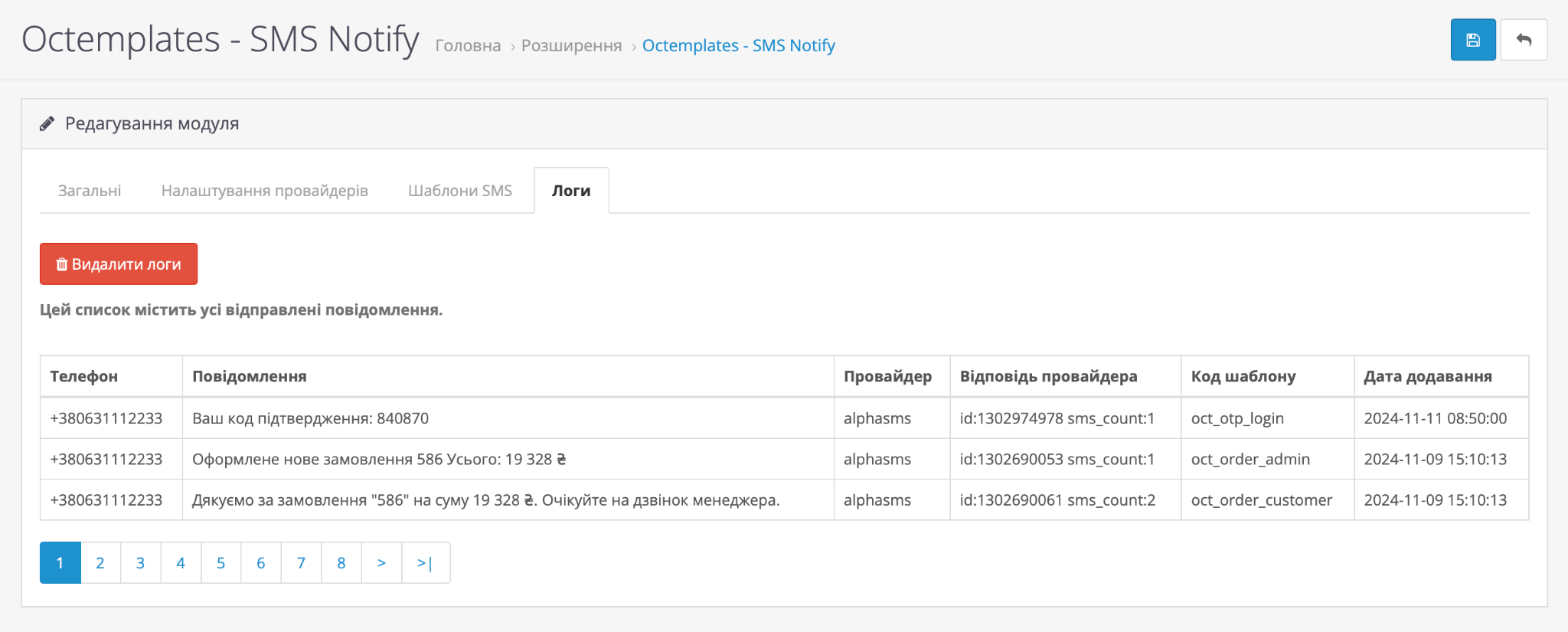 Вкладка "Логи" містить журнал усіх відправлених SMS-повідомлень, що дає можливість адміністратору перевіряти статус і зміст відправлених повідомлень, а також відстежувати відповіді від провайдера. Це може бути корисним для моніторингу ефективності роботи SMS-сповіщень і швидкого виявлення можливих проблем з відправкою.
