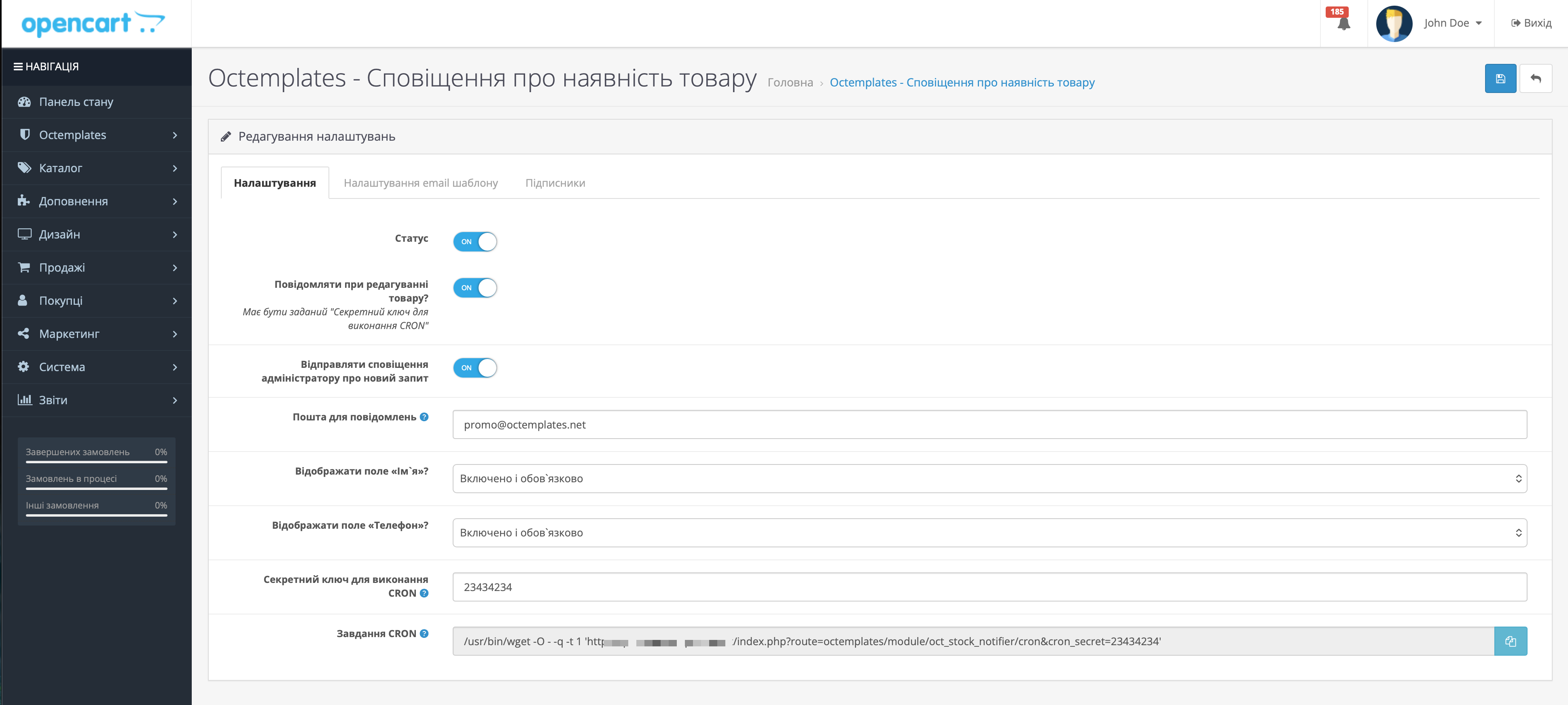 Секретний ключ для виконання CRON: Якщо залишки товару у вашому магазині оновлюються за допомогою синхронізації, рекомендуємо налаштувати автоматчину перевірку підписників на наявність товарів. Для цього вкажіть секретний ключ, який використовується для автентифікації запитів CRON. Після цього збережіть налаштування модуля та отримайте готові налаштування для CRON.