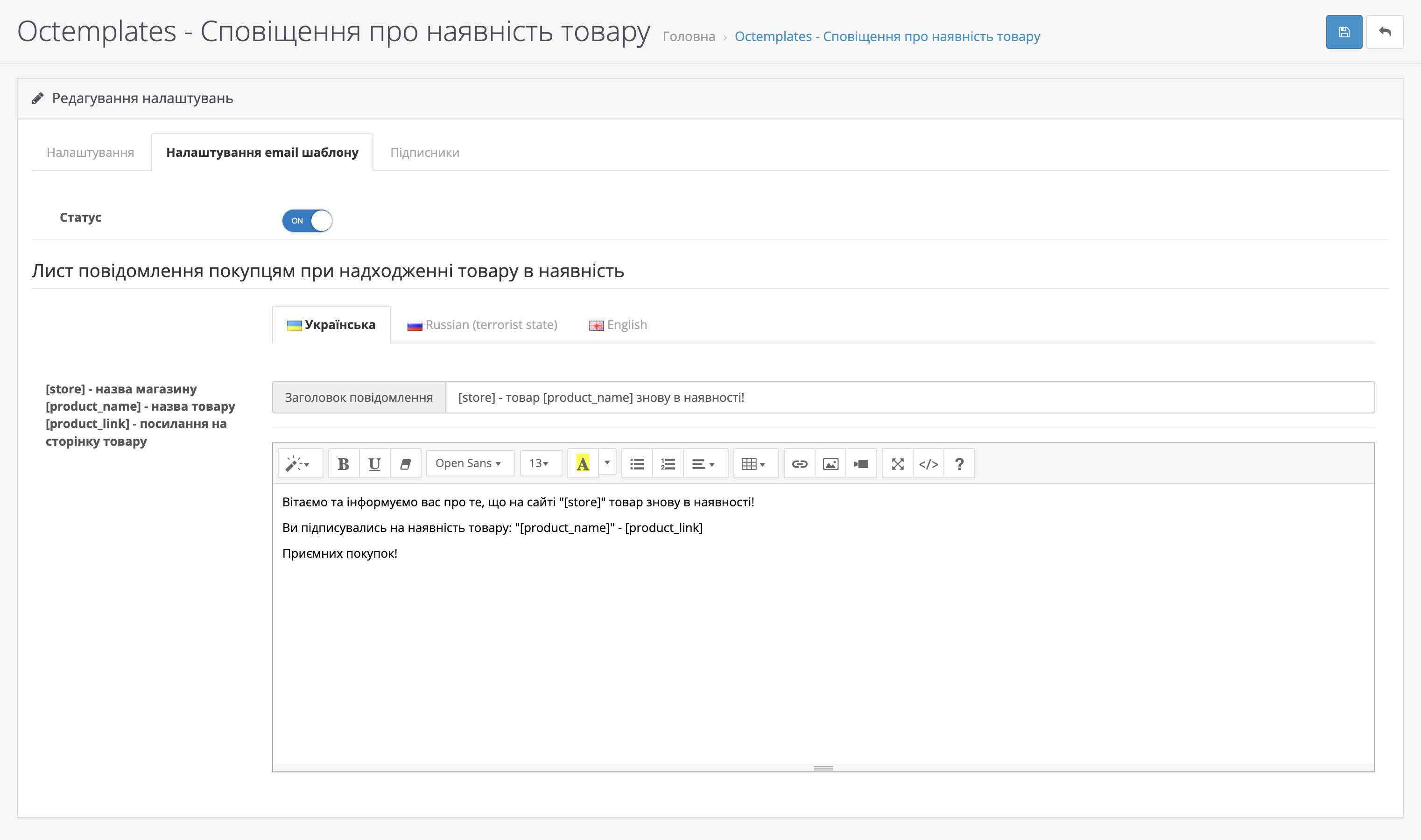 - Статус: дозволяє активувати (ON) або деактивувати (OFF) цю функцію. Коли статус увімкнено, покупці будуть отримувати сповіщення на електронну пошту. Якщо статус (OFF), тіло листа повідомлення буде сформовано з файлів локалізації модуля.