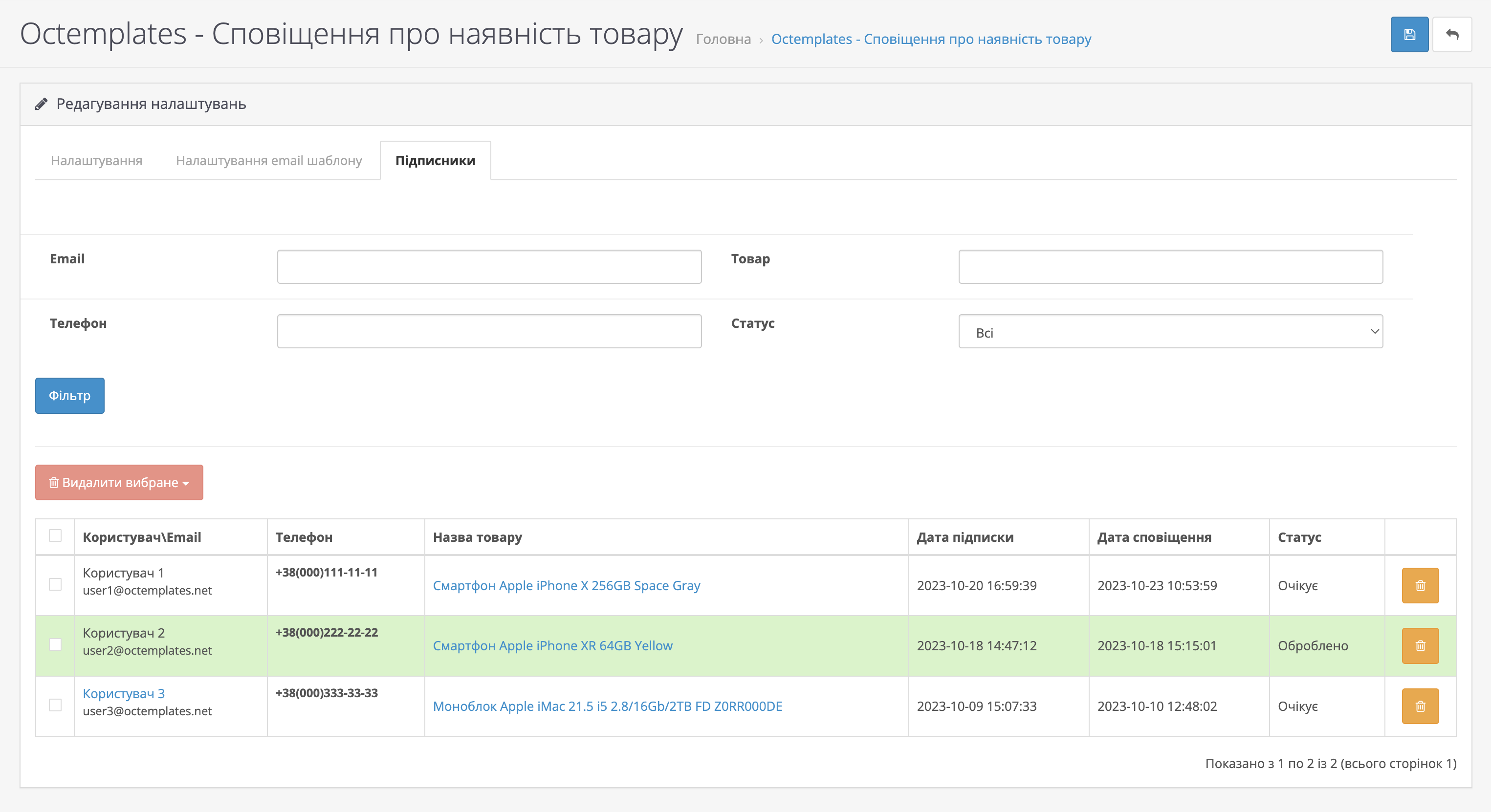 - Товар: Поле для введення або фільтрації за конкретним товаром, на який здійснено підписку.