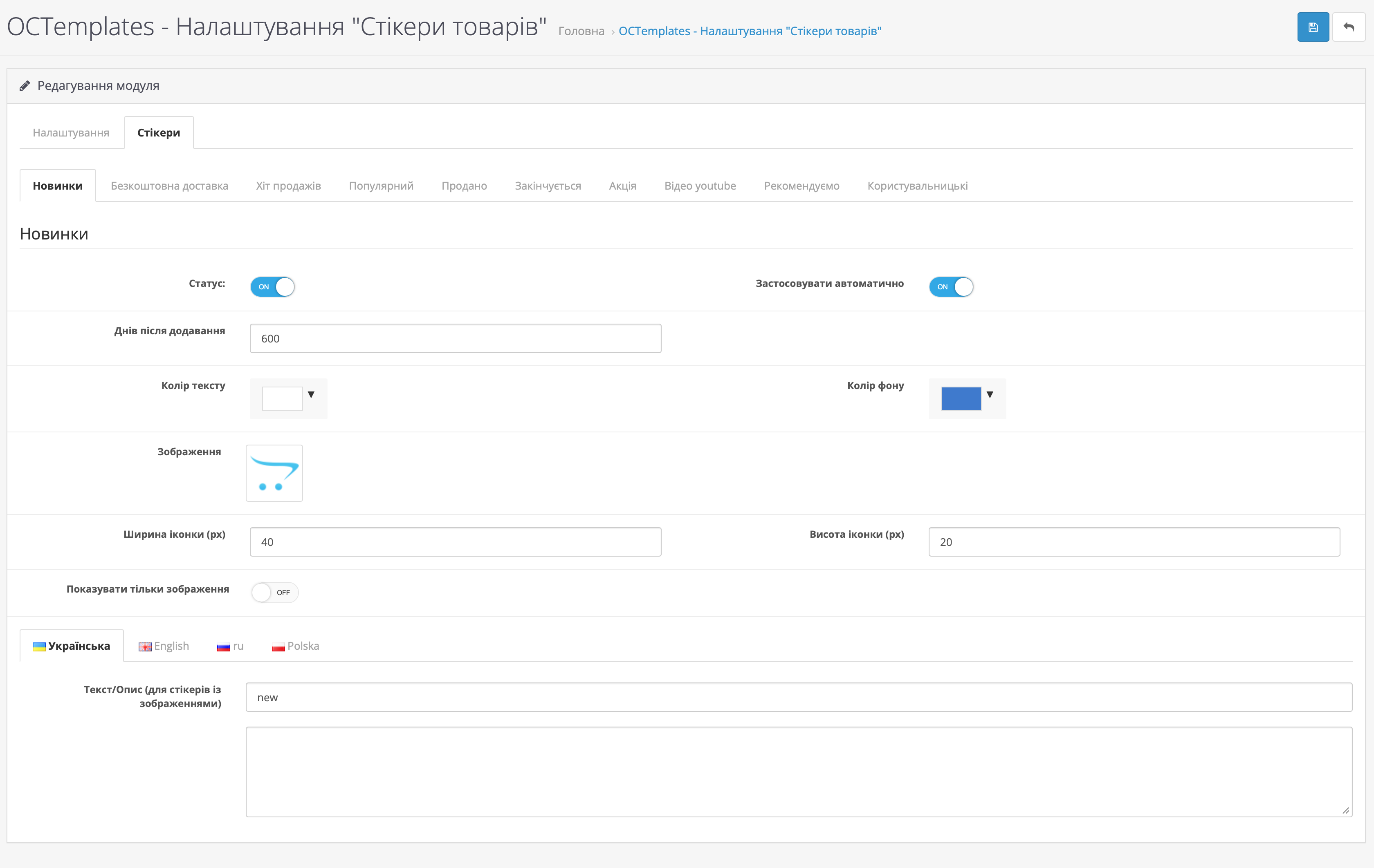 - "Днів після додавання" дозволяє встановити кількість днів, протягом яких товар матиме стікер "новинка" після його додавання до каталогу;