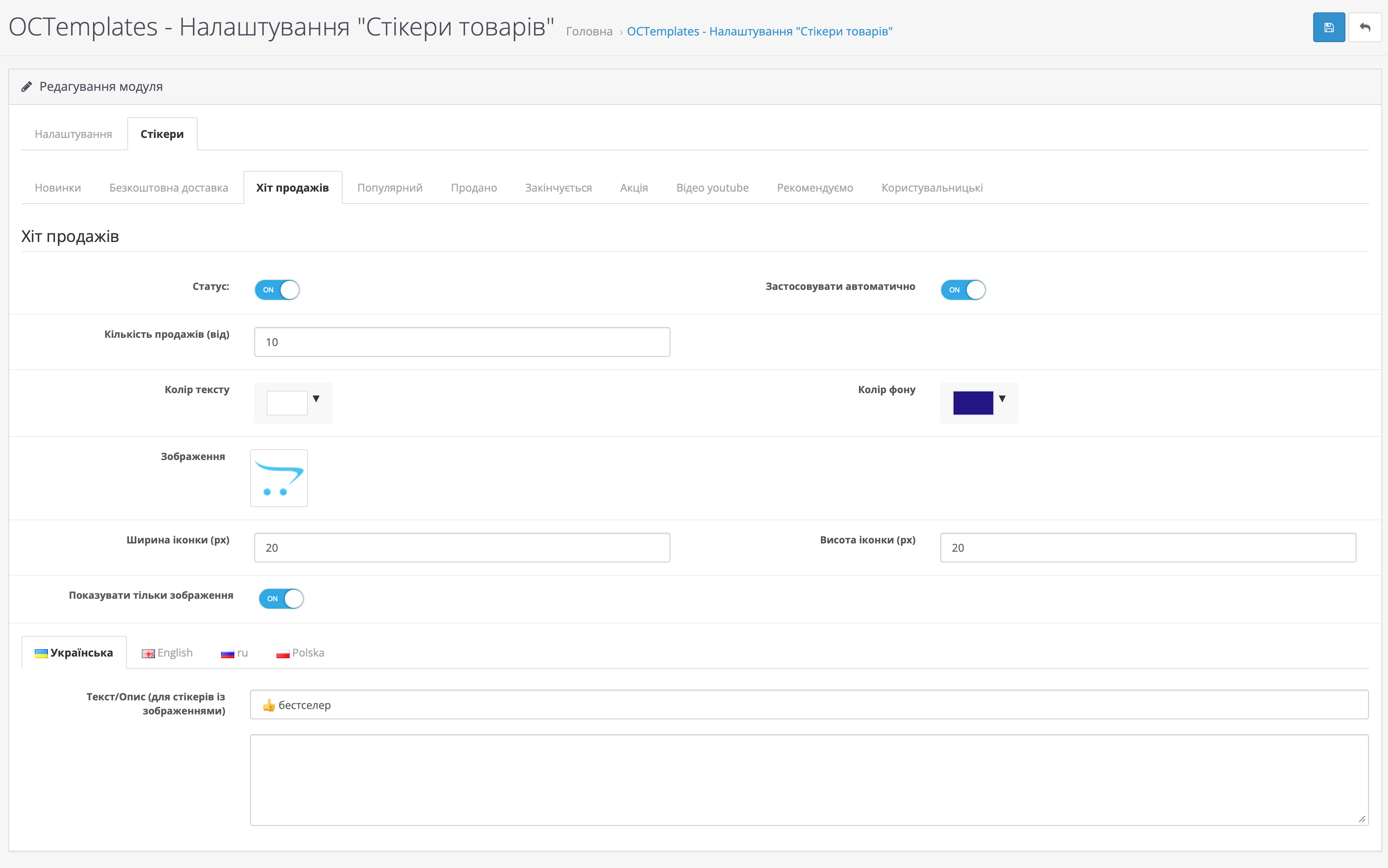 - "Статус" дозволяє активувати відображення стікера "хіт продажів" на товарах;