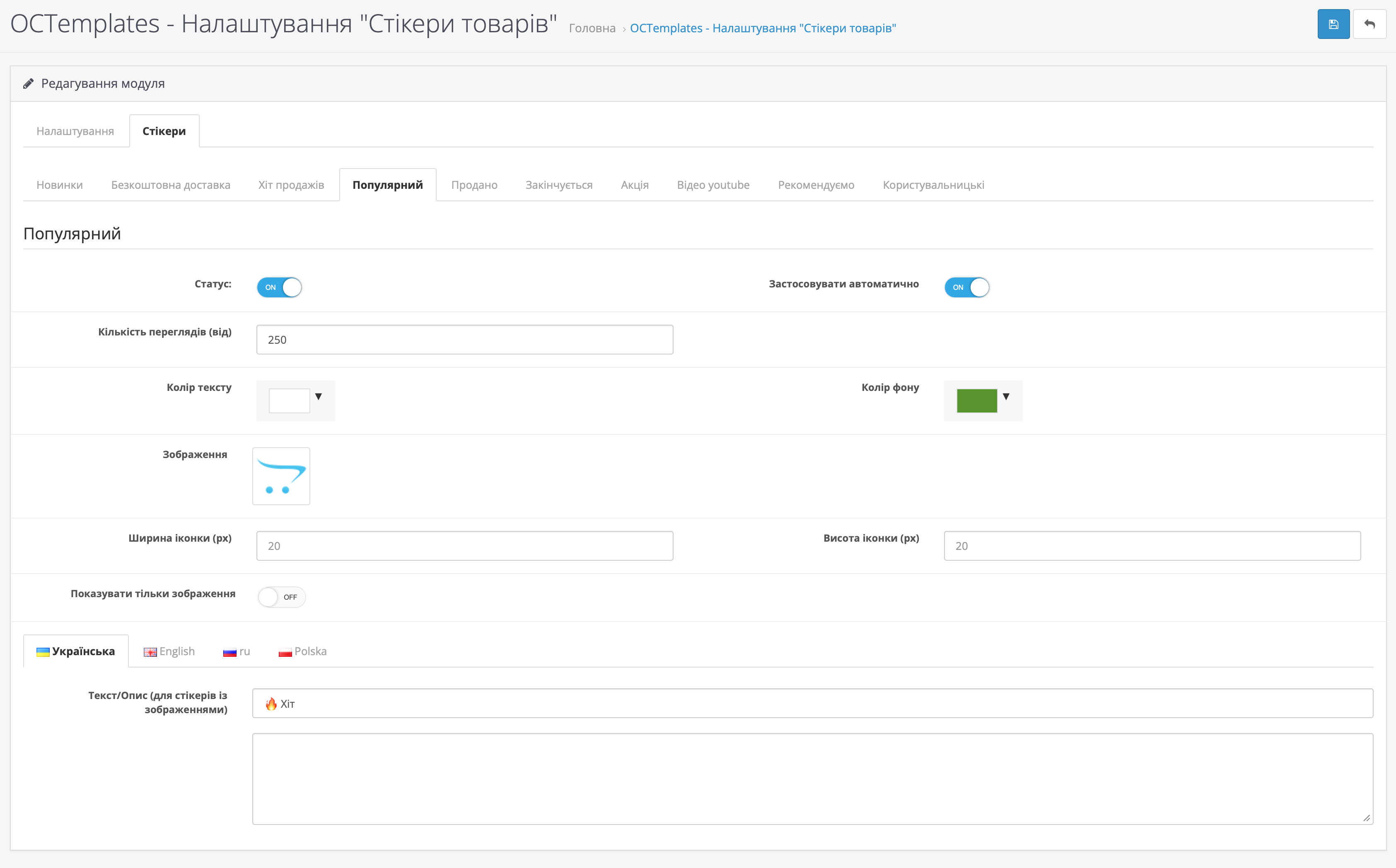 - "Статус" дозволяє активувати відображення стікера "популярний" на товарах;