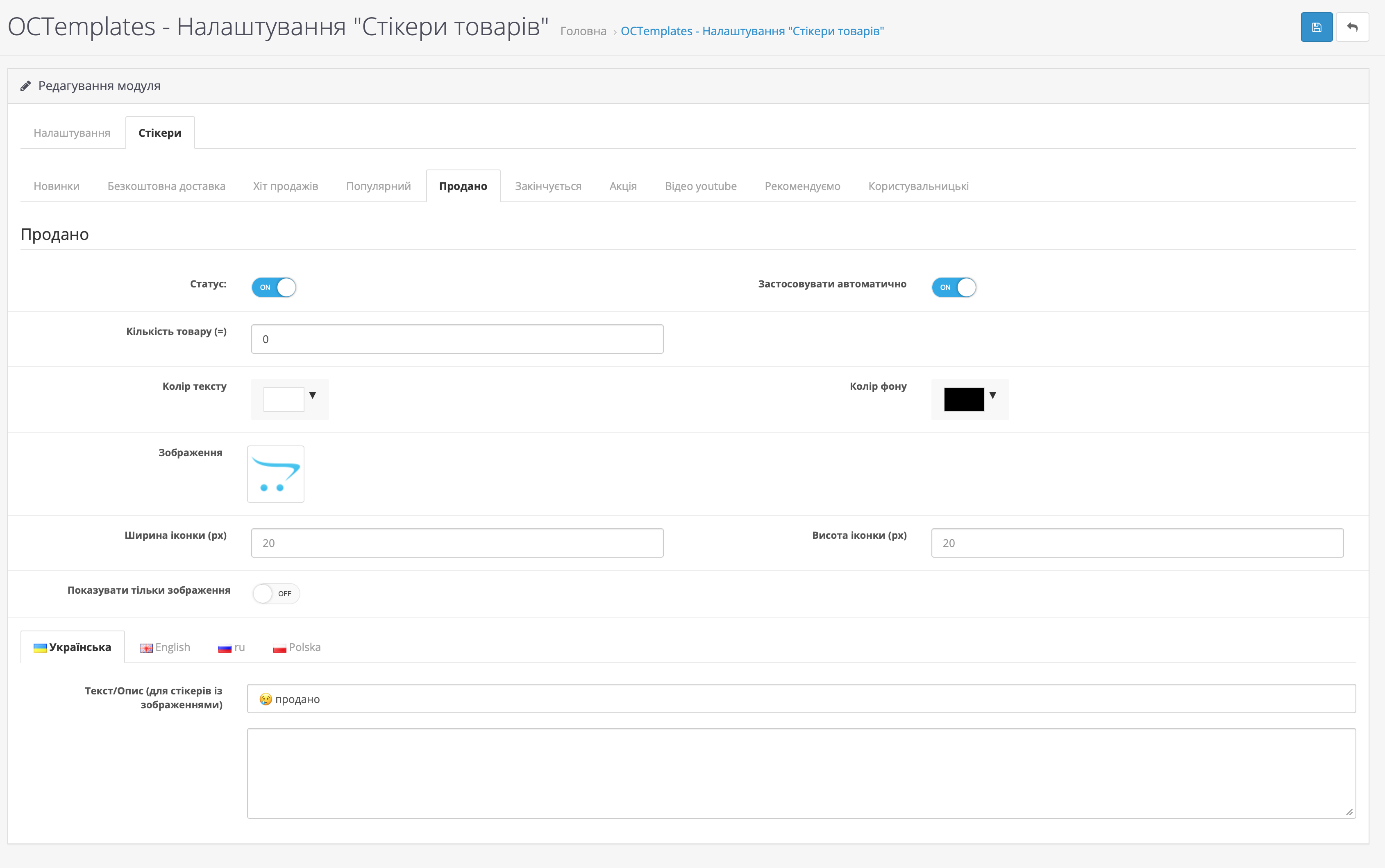 - "Кількість товару (-)" кількість товару, при якій він отримає стікер "продано";
