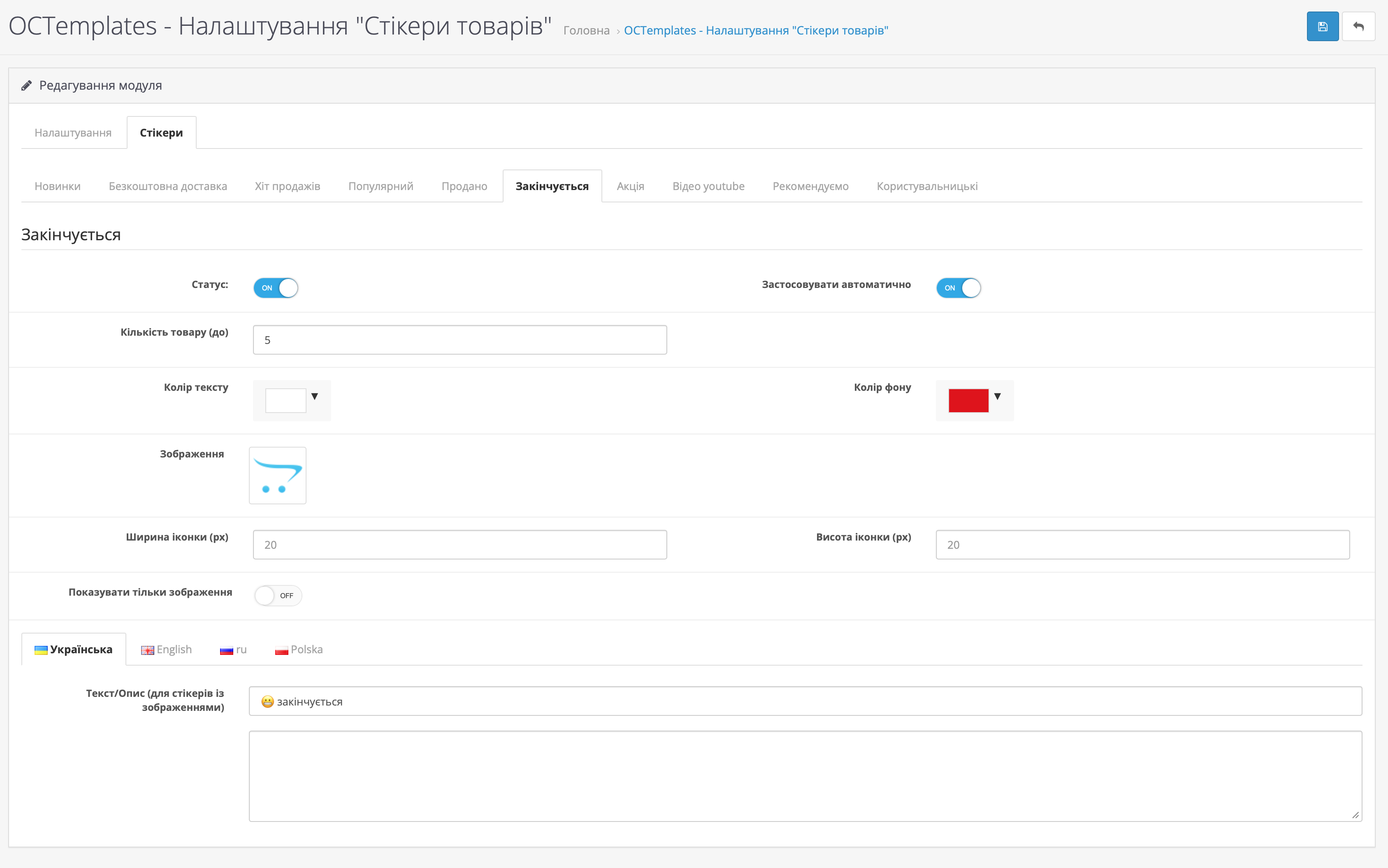 - "Статус" дозволяє активувати відображення стікера "закінчується" на товарах;
