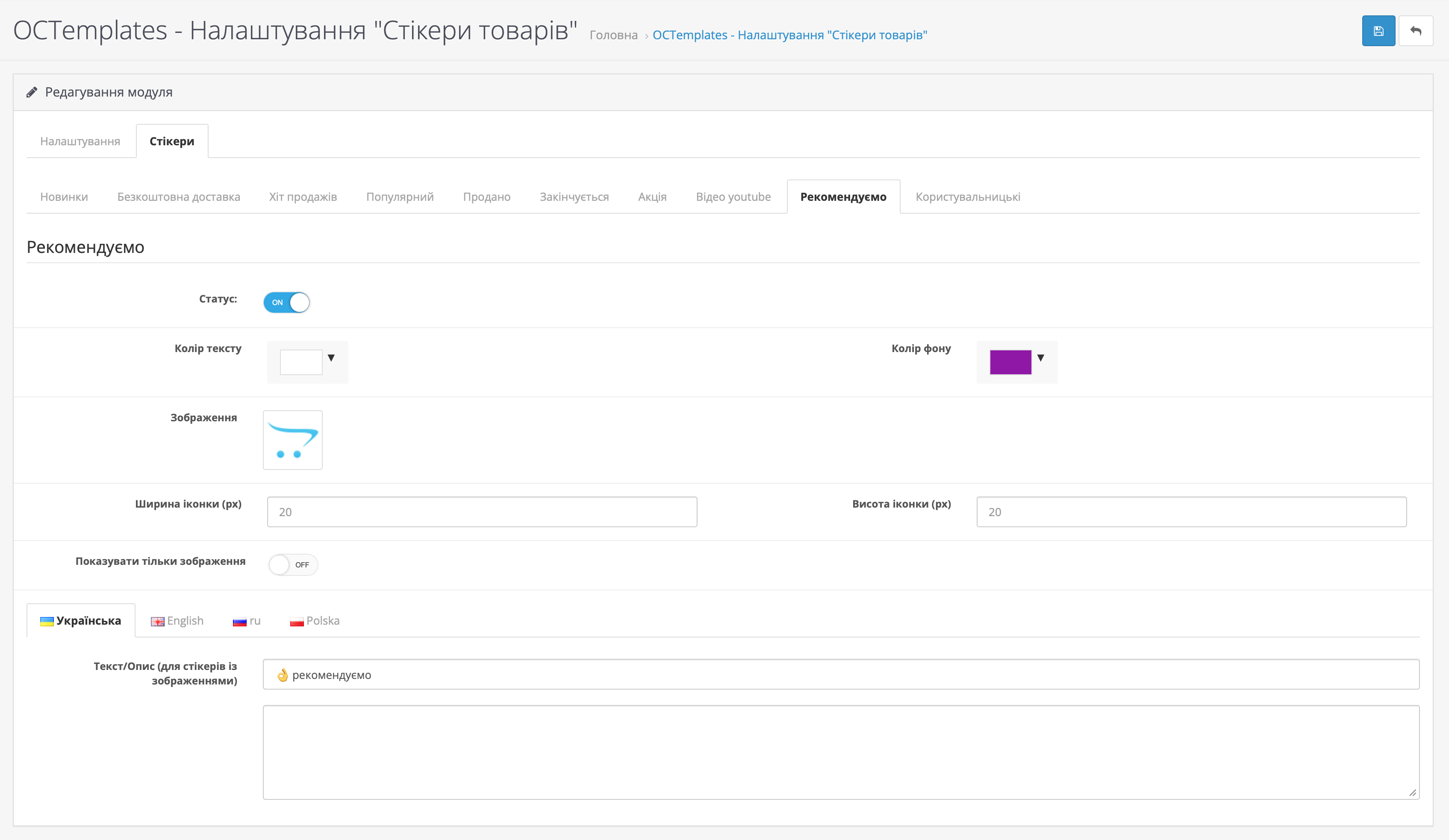 - "Статус" дозволяє активувати відображення стікера "рекомендуємо" на товарах;