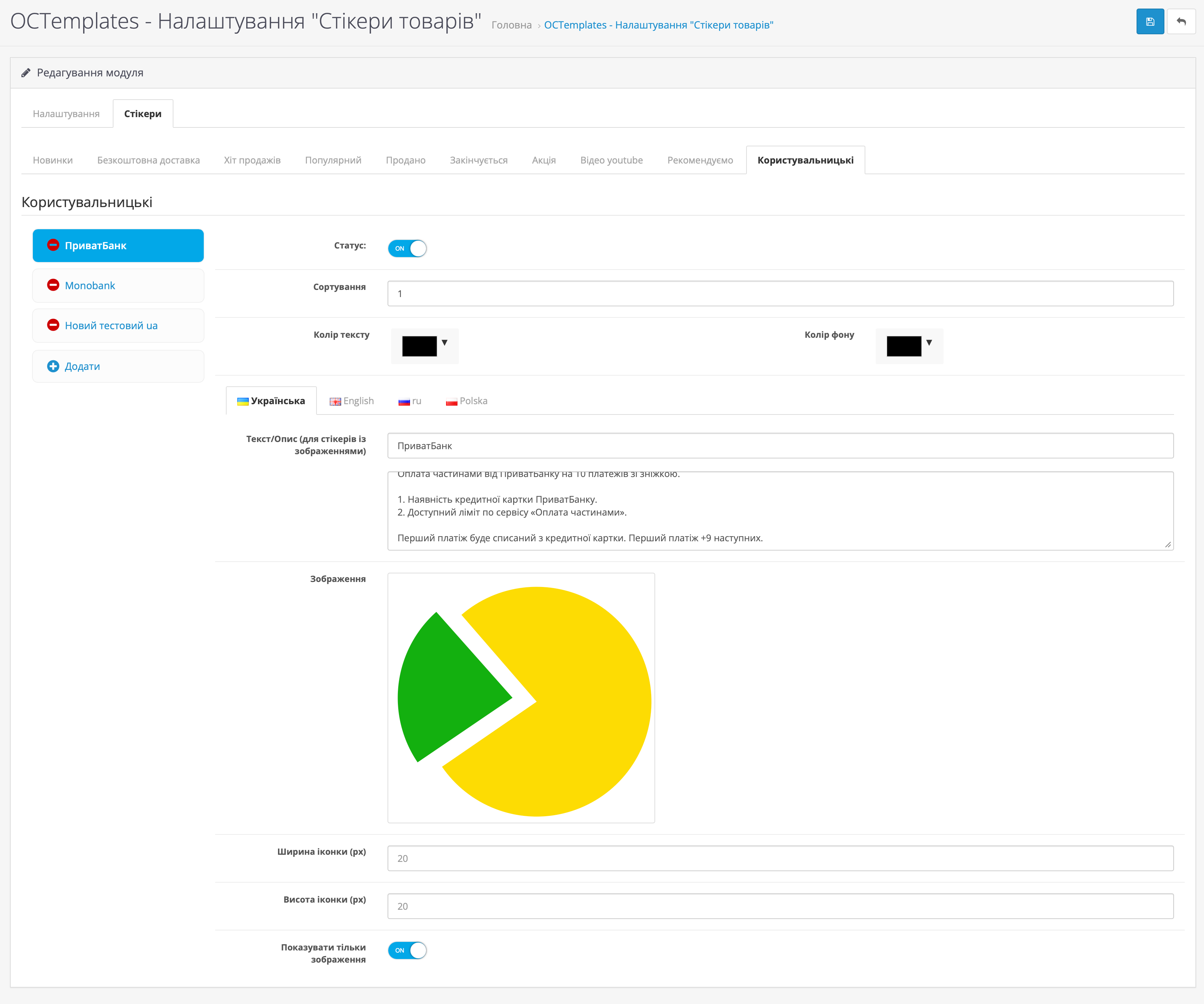 - "Зображення" дозволяє завантажити зображення або іконку для стікера "новинка";