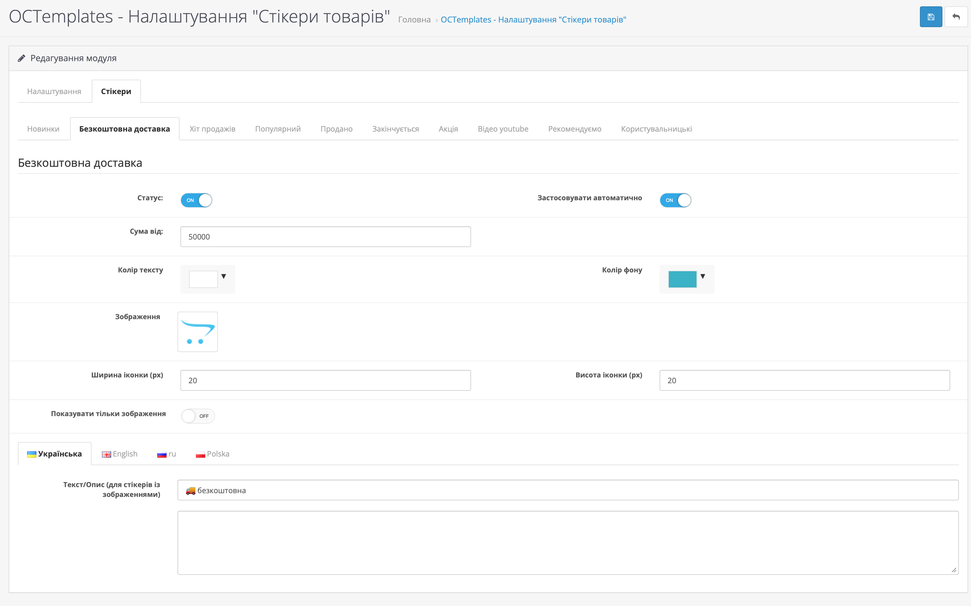 - "Статус" дозволяє активувати відображення стікера "безкошточна доставка" на товарах;