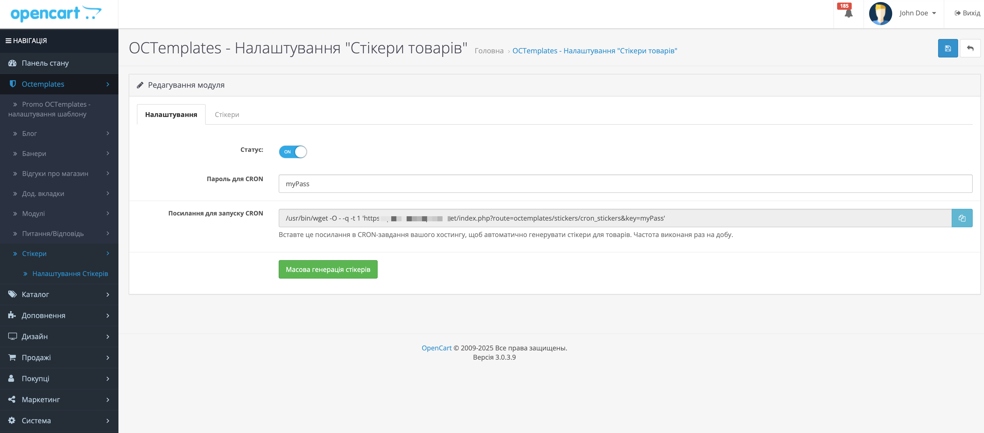 Для налаштування модуля в лівому меню адміністратора перейдіть на сторінку "OCTemplates" - "Стікери" - "Налаштування стікерів". Тут вам будуть доступні дві вкладки.